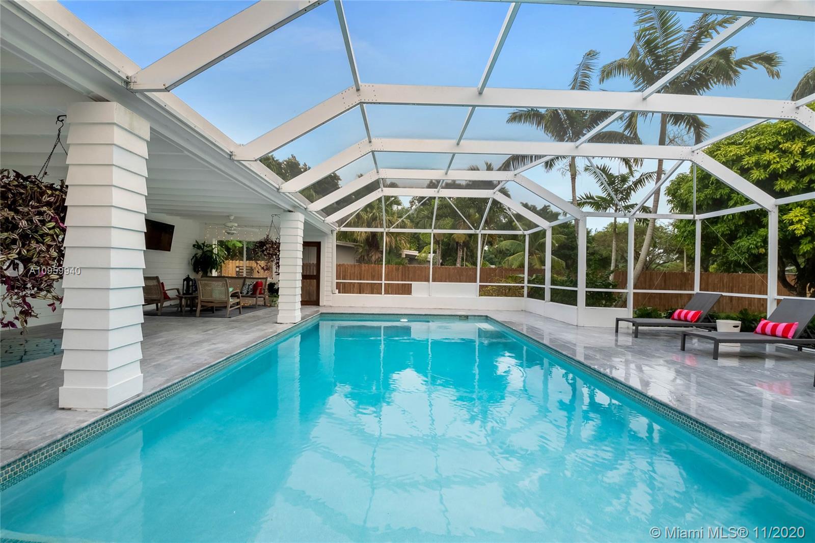Roof & front fence to be replaced PRIOR to closing by owner with approved permits from City of Pinecrest. Enter the front privacy gates to a stylish and chic, renovated half-acre estate. Designed around a beautiful pool courtyard the lifestyle this property conveys is flexible for family weekends & entertaining. Gorgeous eat-in kitchen is a place to congregate & adjacent to French doors opening up to screened-in pool & patio. Fantastic spaces include family room w/artistic built-ins & a screened-in rear terrace perfect for lounging. Living room & dining rooms open to the kitchen-very open floor plan! Lot configuration provides ample grassy area in backyard for pets and family soccer matches. Perks include complete privacy from street, vaulted ceilings & fruit trees.