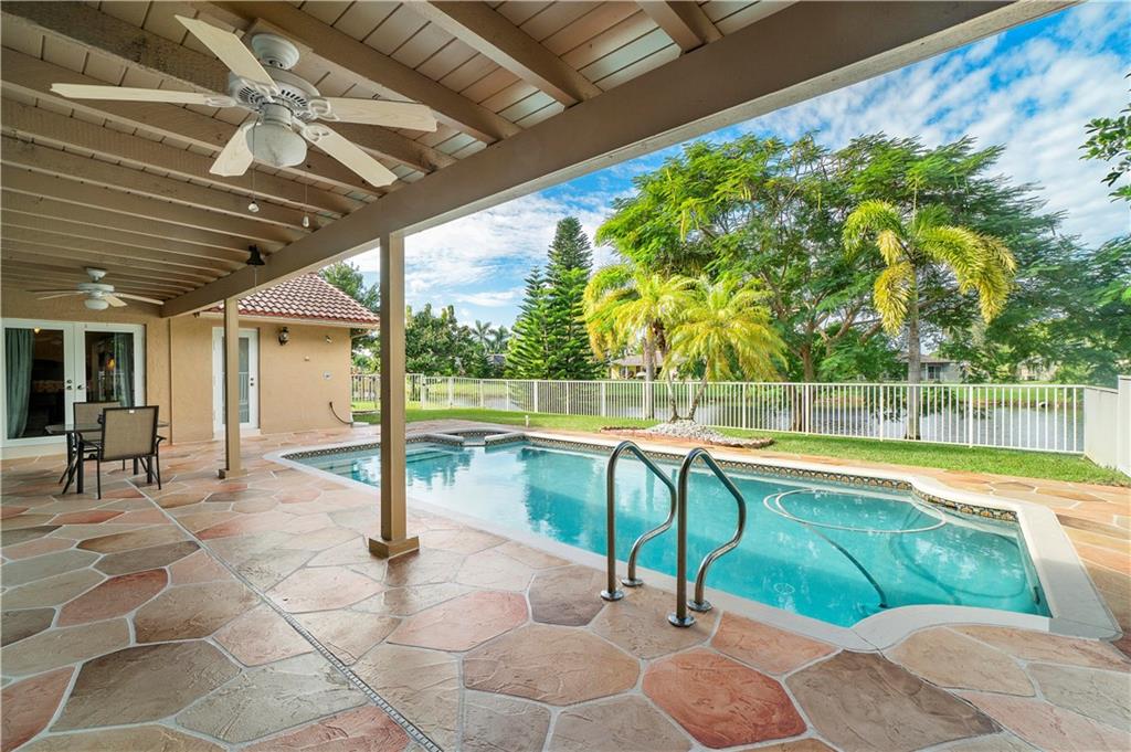 A rare find in Popular tree lined Maplewood! Welcome to wide WATERFRONT views, cul de sac 3 bedroom plus bonus 4th bedroom (no closet) plus 3 CAR GARAGE and 2.5 baths with ALL IMPACT Windows and Doors! Vaulted ceilings, open floor plan, fireplace, circular paver driveway, led lights, 2 newer AC's, New WH, closet organizers, generator ready! Outdoor backyard is perfect for entertaining with new Euro patio decking, fenced pool area, shower, patio has built in with sink & plenty of grass area to see sunset. Sprinkler runs off lake. Baths are updated with new designer 2 sink vanities(tub and separate shower in master) . Kitchen has huge breakfast nook that opens to updated private side deck, granite counters, soft close drawers ,SS. NO HOA FEES! Close to shopping, schools, & parks.