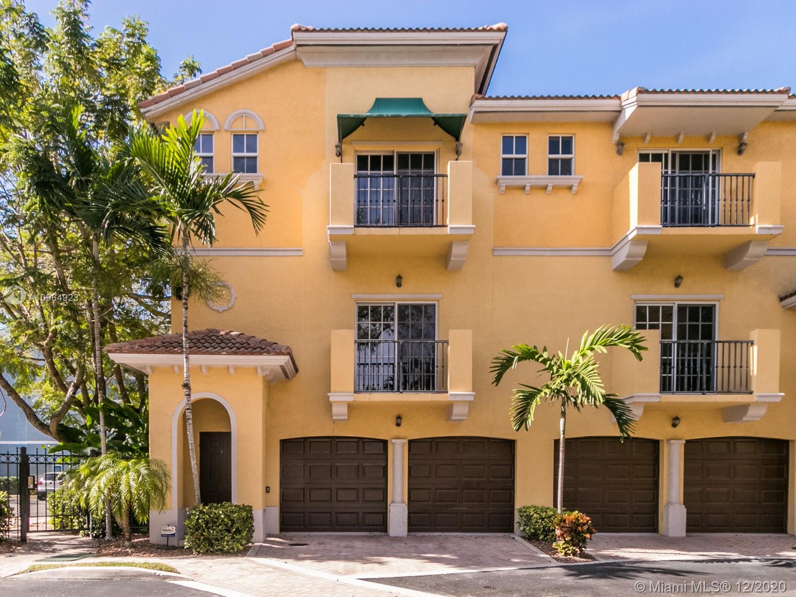 Elegant tri-level corner townhome in the upscale gated community of The Grove At River Oaks. This rarely available 2 bedroom, 2 and 1/2 bath home boasts a double garage and rear fenced patio. Each bedroom has it's own on-suite bath and balcony. Granite kitchen countertops with under counter lighting. Stainless steel appliances. Large master closet including a free standing safe. Wood floors in the main living areas and carpeted bedrooms. Impact glass windows and storm rated doors. Community pool. Conveniently located on Marina Mile near I-95 and the airport. Close to the beaches and downtown Fort Lauderdale