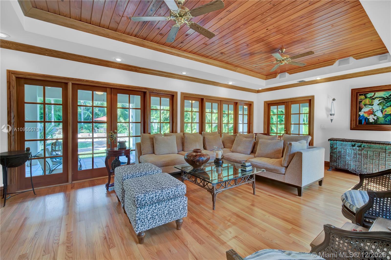 Resort Style living in Pinecrest. Large 4/3.5 home on 41,817 Sq. Ft. lot located in a gated enclave. Enter the great room with beautifully restored original oak wood floors and an 18ft tongue and groove ceiling. The family room with tray ceiling is surrounded by a courtyard and wraparound terrace. Sit in the den with the interior planter for some quiet time. Master suite and 1 Ensuite bedroom located on one side of the house, other two bedrooms with a Jack & Jill bathroom are on the other side. Transport yourself to a resort as you walk the terrace and winding pathway surrounding the lagoon pebble tech pool. The beach entrance & waterfall offer fun family time. This home has the modern-day comfort you're looking for and the luxury you desire. New roof installed 2019, PVC pipes, city water.