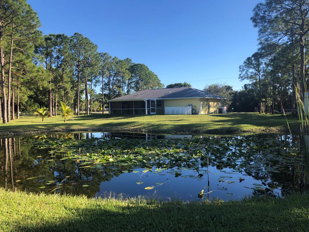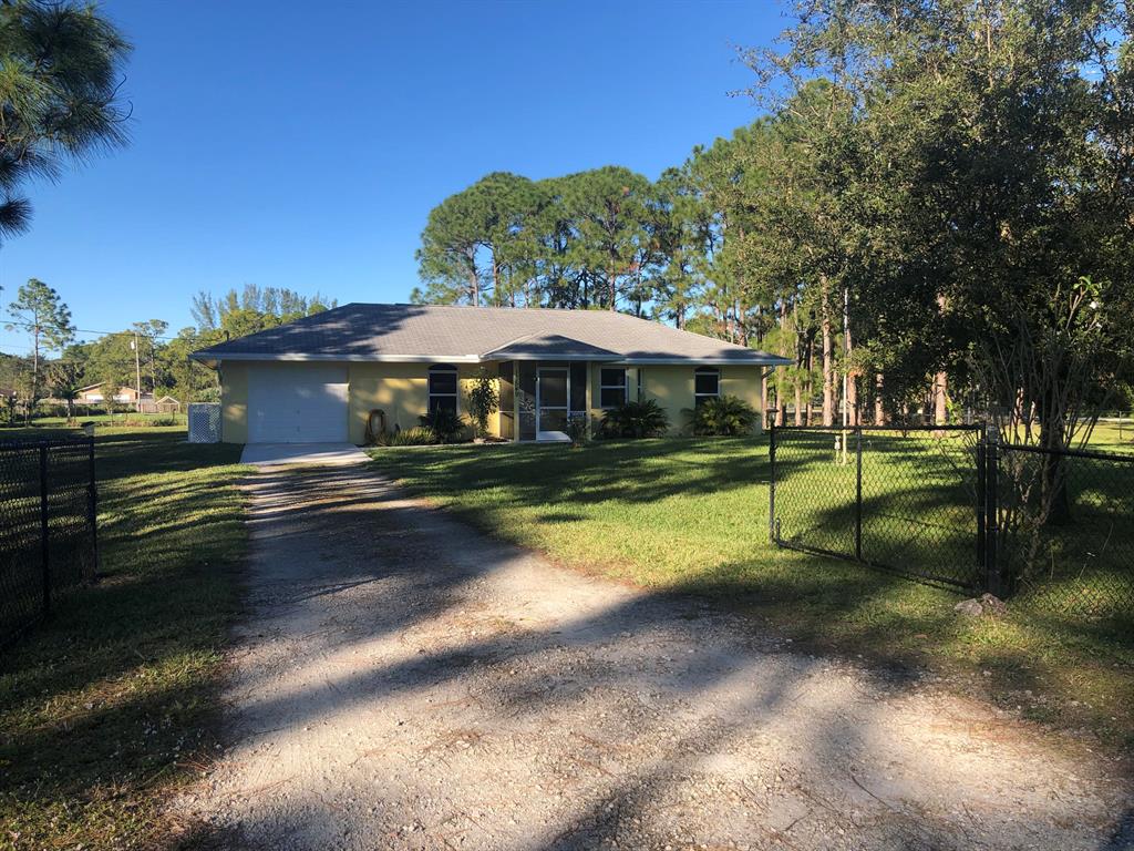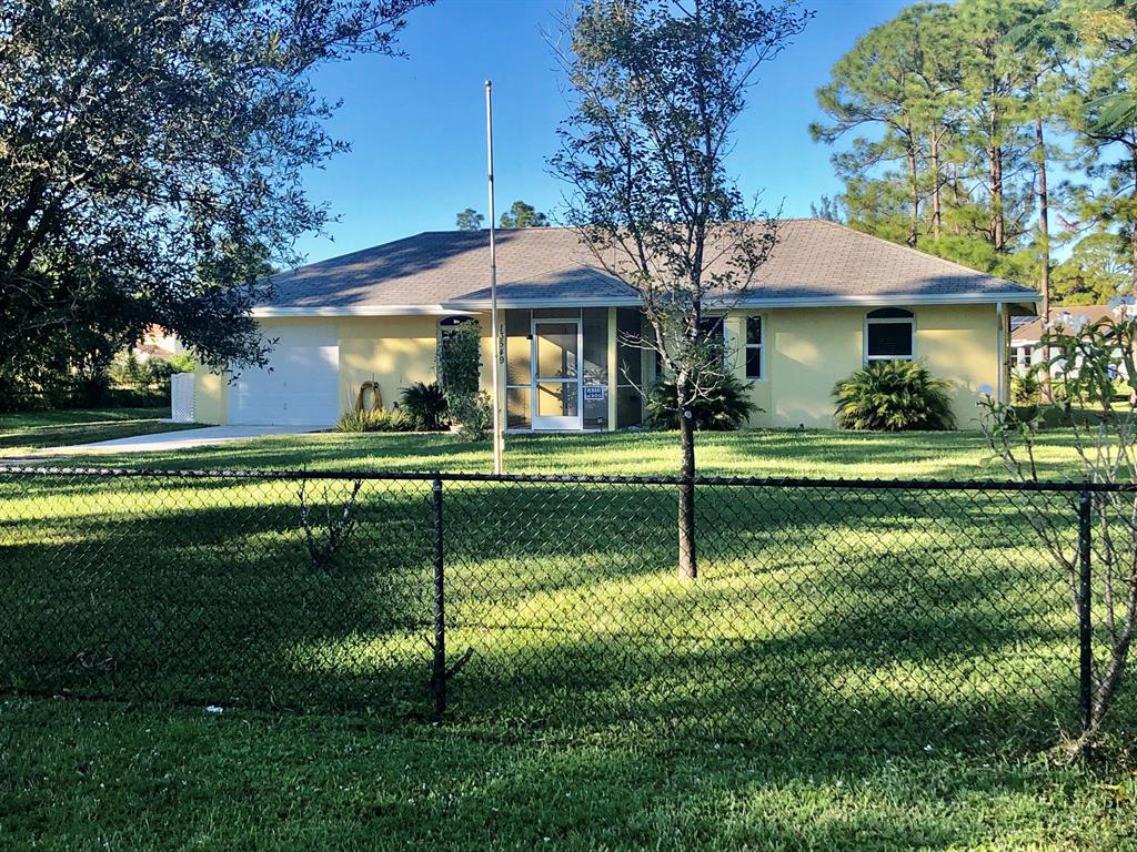 Fabulous CBS home on corner paved road! Kitchen & Baths renovated 2012-2013 with Wood Cabinets & Granite Counters. Windows are Hurricane Impact including French Doors & Front Door which also has built in blinds. Living room has a Bay Window with wood blinds. Owner's Suite includes walk in closet, wood blinds, ceiling fan & step in shower. Both guest rooms have 2 windows each, ceiling fans & walk up closets. Guest bath offers a combo tub/shower. Split floor plan, vaulted ceilings in Great Room & Owner's Suite. Garage has a built-in workbench, pull down attic stairs & automatic opener. Fully fenced with 3 sides chain link which is owned by this property. 23' X 11' Shed with power & ramp. 24' X 14' screened patio off the kitchen & french doors. Sprinkler system. Agent is related to seller.
