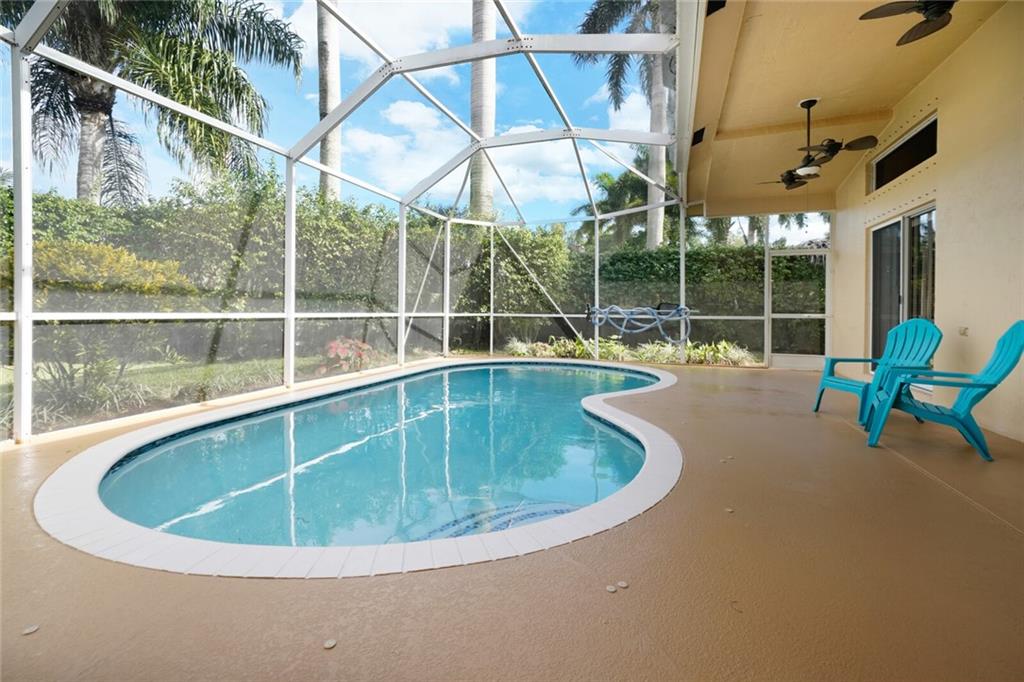 Move-in ready, well-appointed 4 bedroom, 3 bath pool home with split floor plan design – Bristol model – see floor plan in photos. Spacious and open. Upon entering, you immediately get a glimpse of the fun, screened-in pool area just beyond the living room. Brand new pool heater. Inviting kitchen with updated wood cabinetry, granite counters and stainless-steel appliances-open to family room. Large Master bedroom has vaulted ceilings, almost new carpet, two walk-in closets. All bathrooms upgraded 5 years ago. New washer and dryer in the Large laundry room equipped with sink and cabinets. Windows that get heavy sun have UV protection and/or tinting. Fenced backyard has a privacy hedge. Hurricane shutters. “A” rated school district. Owners are flexible on a closing date.