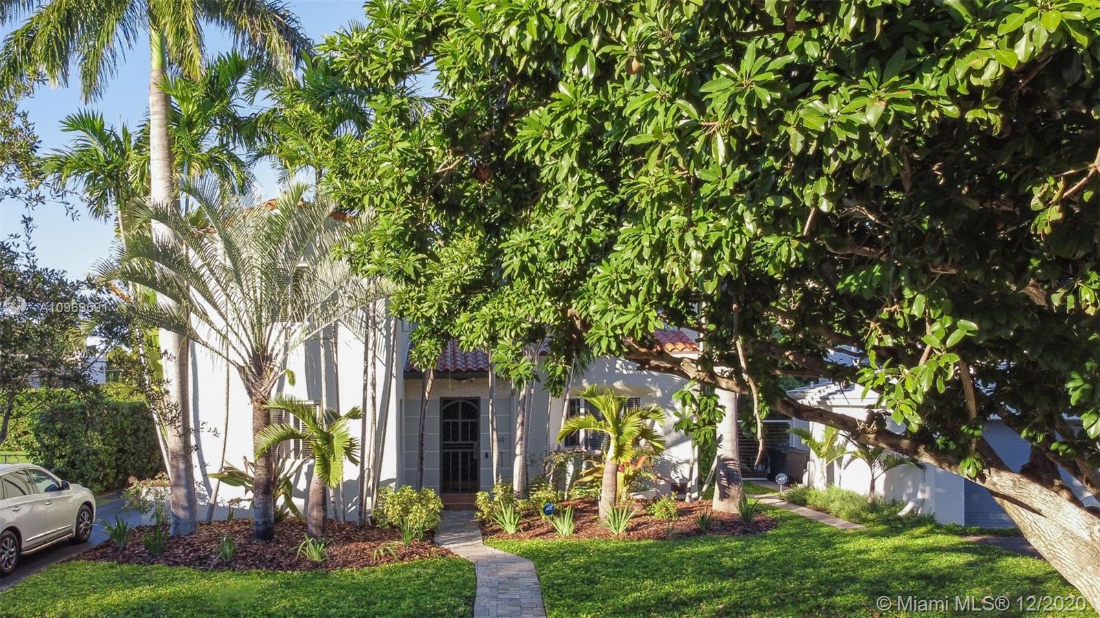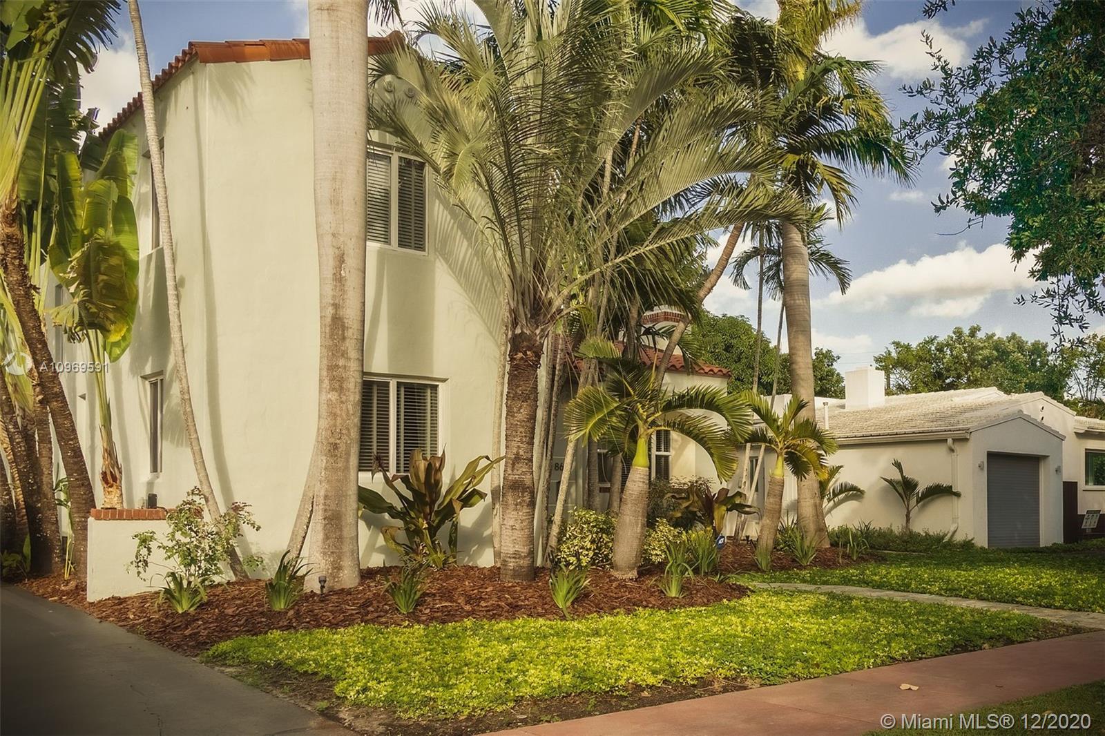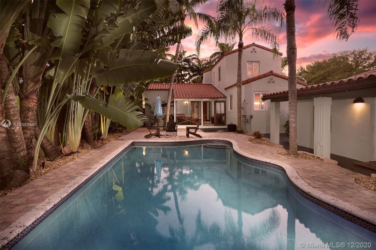 Beautifully updated Miami Beach Mediterranean pool home with guest house. Located on a quiet, tree-lined street, meticulously maintained & updated, the main house features vaulted ceiling with wood burning fireplace, wood floors, beautifully updated kitchen/dining room, powder room & bedroom suite. Upstairs features two bedrooms and one bath. French doors in Living room and Dining room lead to screened-in patio over looking the pool. Impact windows throughout. Natural Gas. Resort-like backyard- with mosquito control system- is landscaped with variety of palms & tropical plants, surrounding custom designed heated pool. Detached guesthouse includes 1BR/1BA cottage & studio. 20min walk/8min bike to beach. 2 blocks to Ritz Carlton residences. Walking distance to houses of worship.