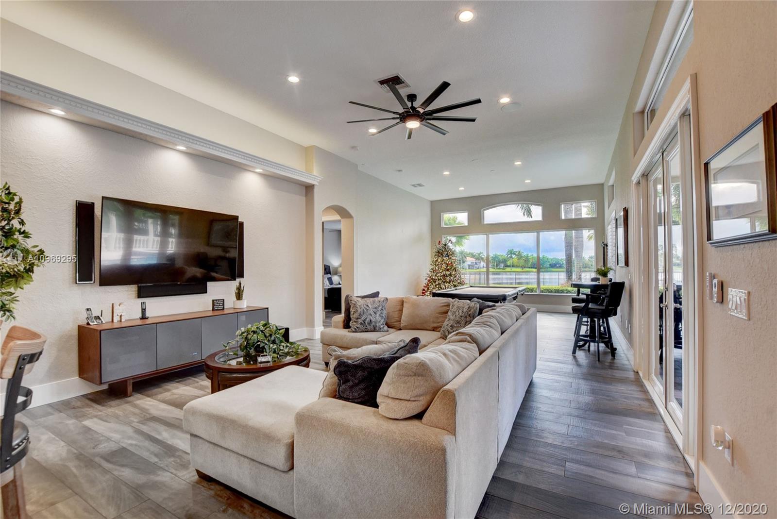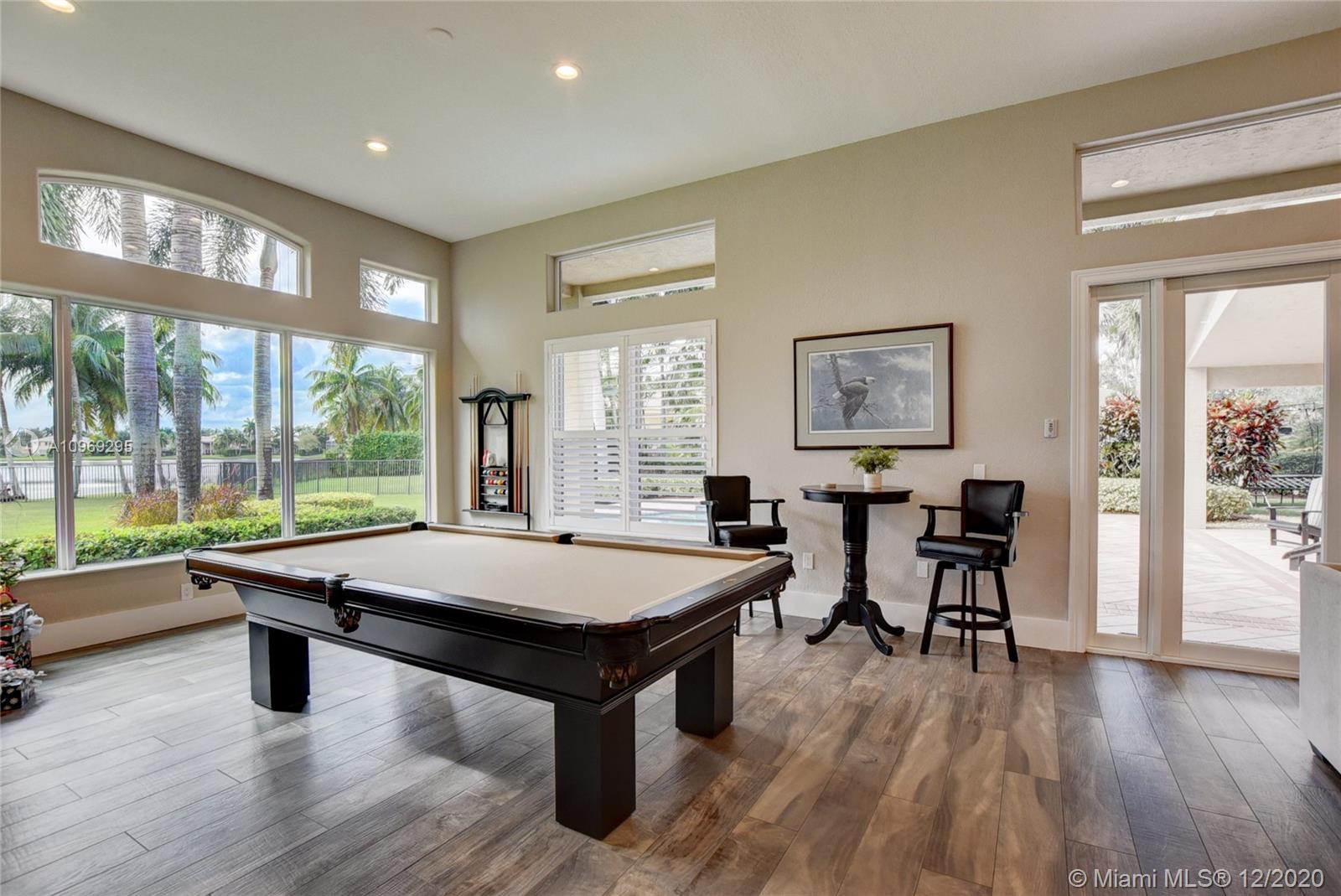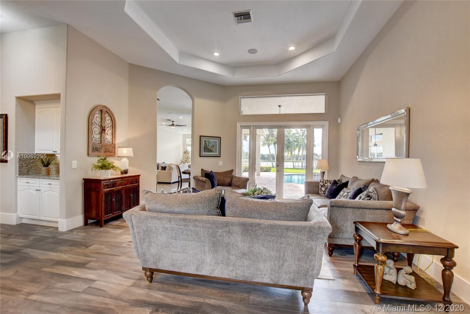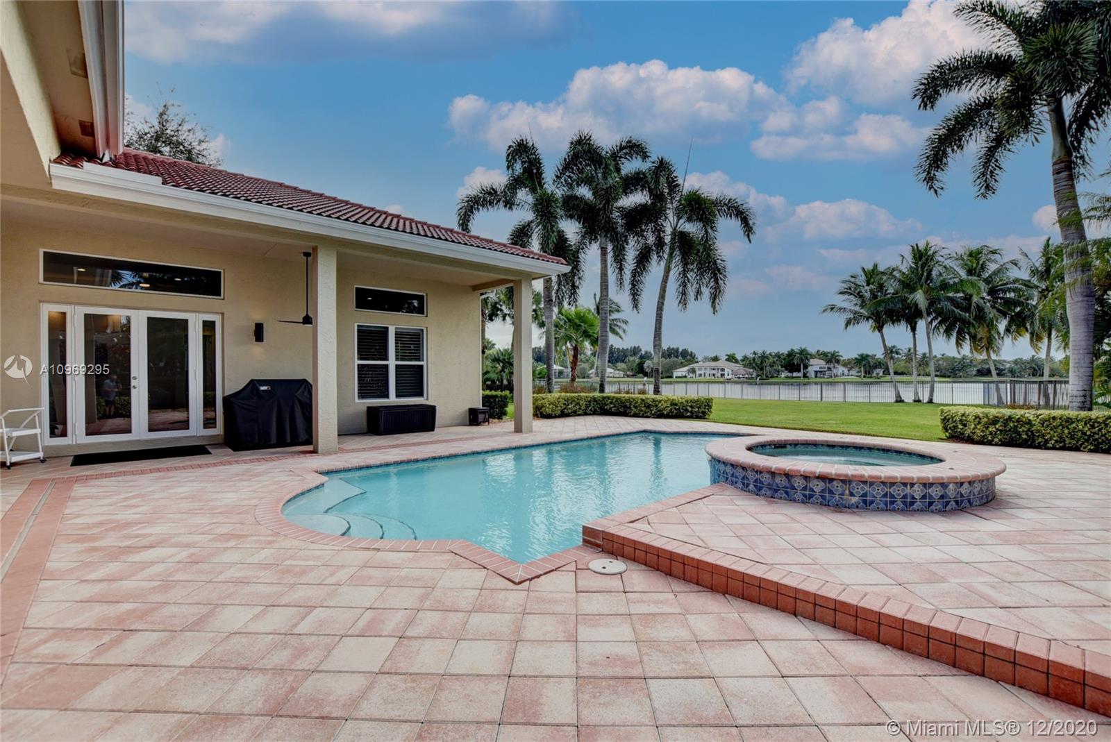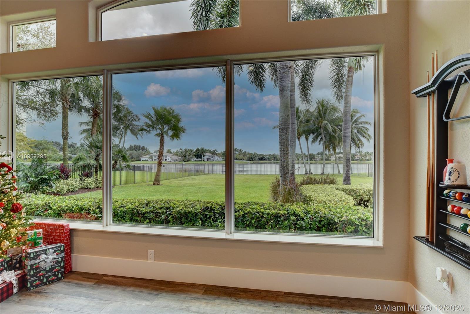 Gorgeous lake view from this immaculate, completely remodeled 5 bedroom + dedicated office + great room/3 bath residence in guard-gated Long Lake Estates. Impact glass windows/doors showcase generous yard, salt system pool w/raised spa, & wide view of the lake. Meticulously maintained & tastefully updated w/high-end finishes: porcelain wood tile flooring w/new 7.25" baseboards, quartz bathroom countertops, undermount sinks. Newer roof (2007) w/Roof-a-cide treatment, New a/c's, new Rheem water heater, new LG washer/dryer and all new Samsung & GE Profile kitchen appliances. U-line wine fridge, Plantation shutters, customized shelving in all closets. 3-car garage w/impact resistant garage doors, higher horse power motors & app-controlled entry. Whole-house water filtration/softening system.