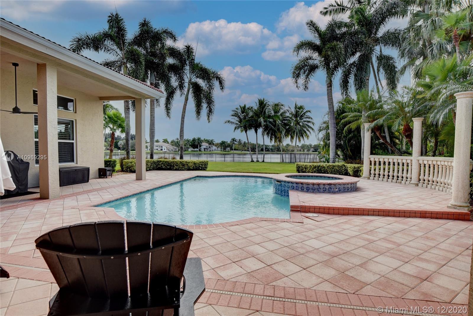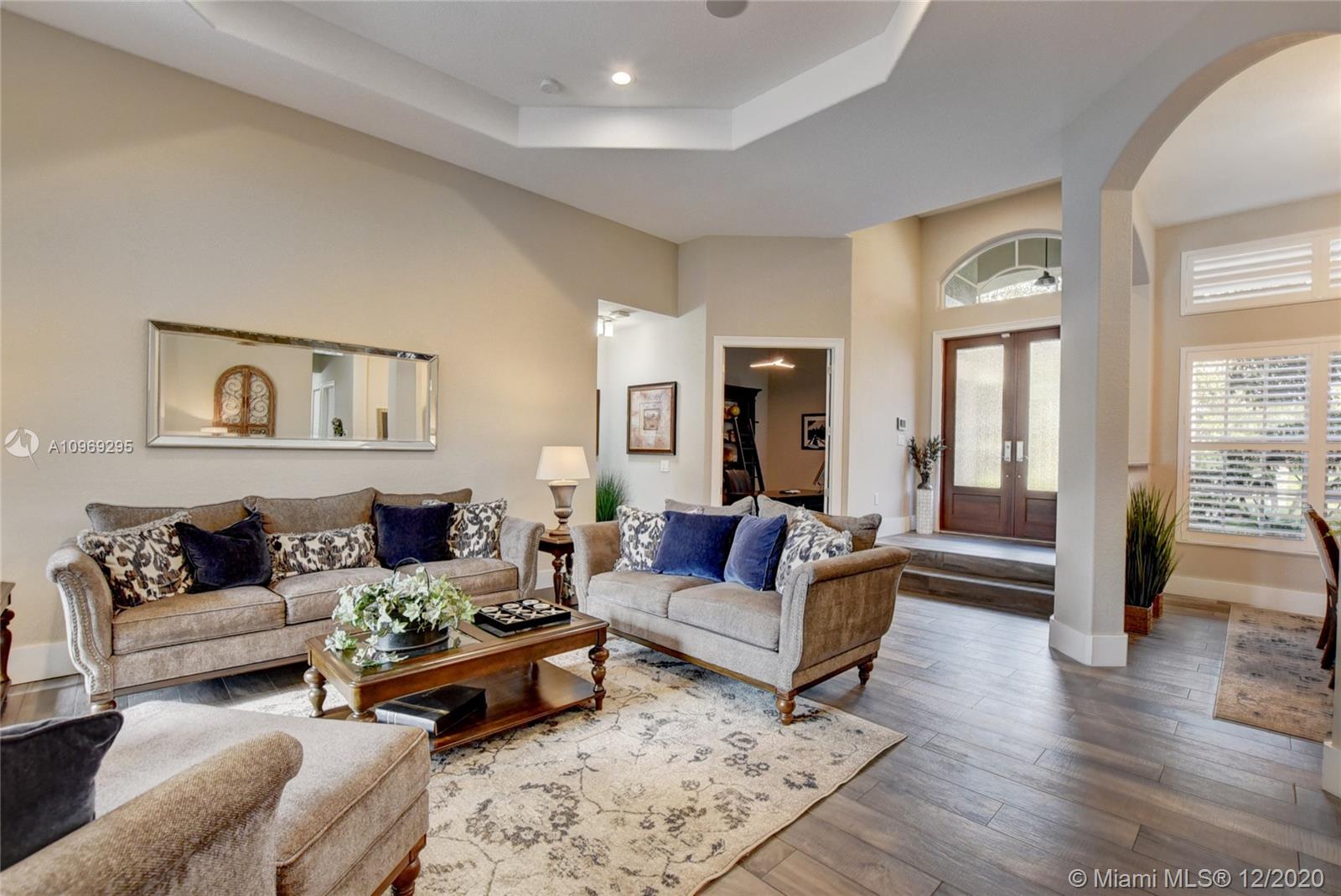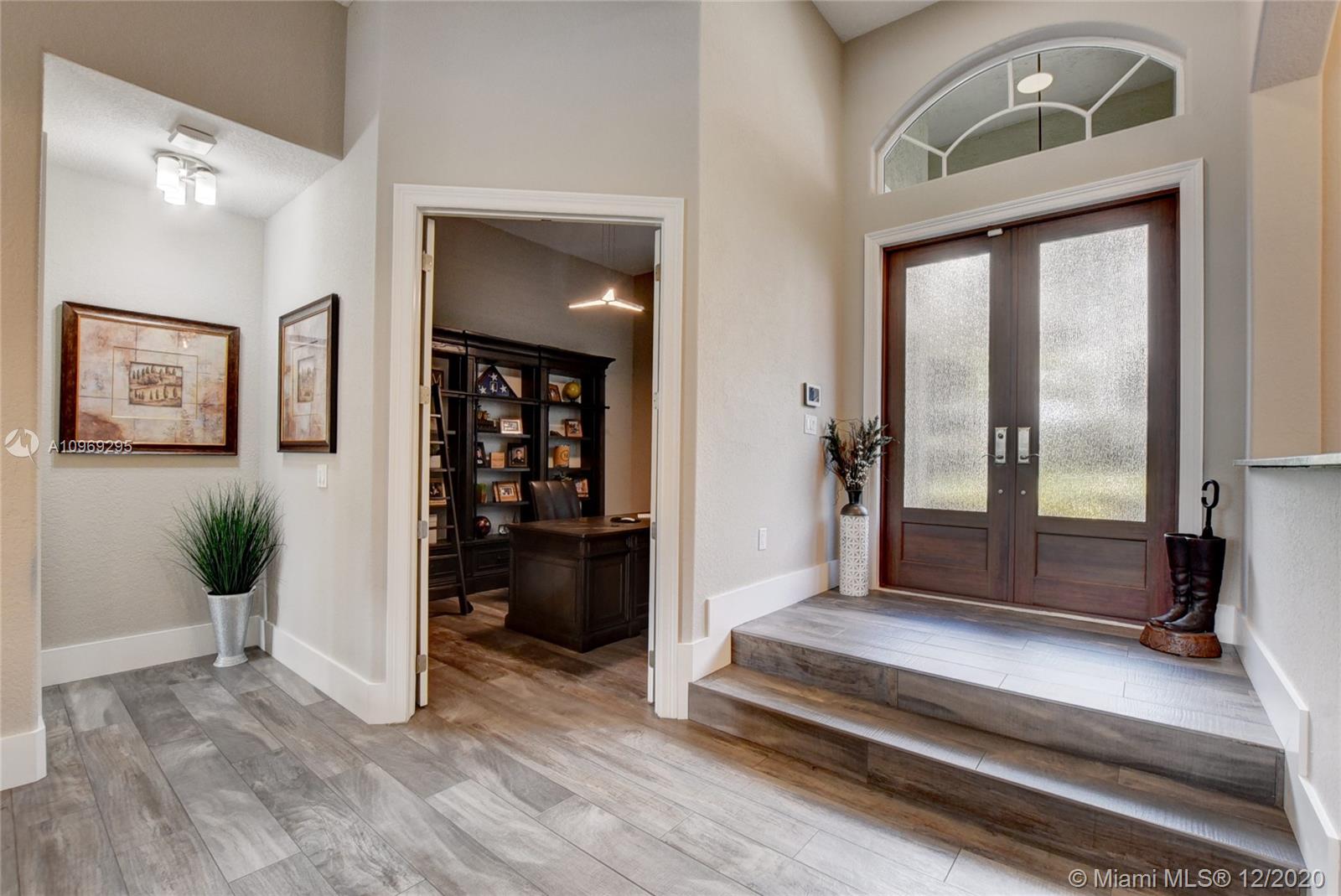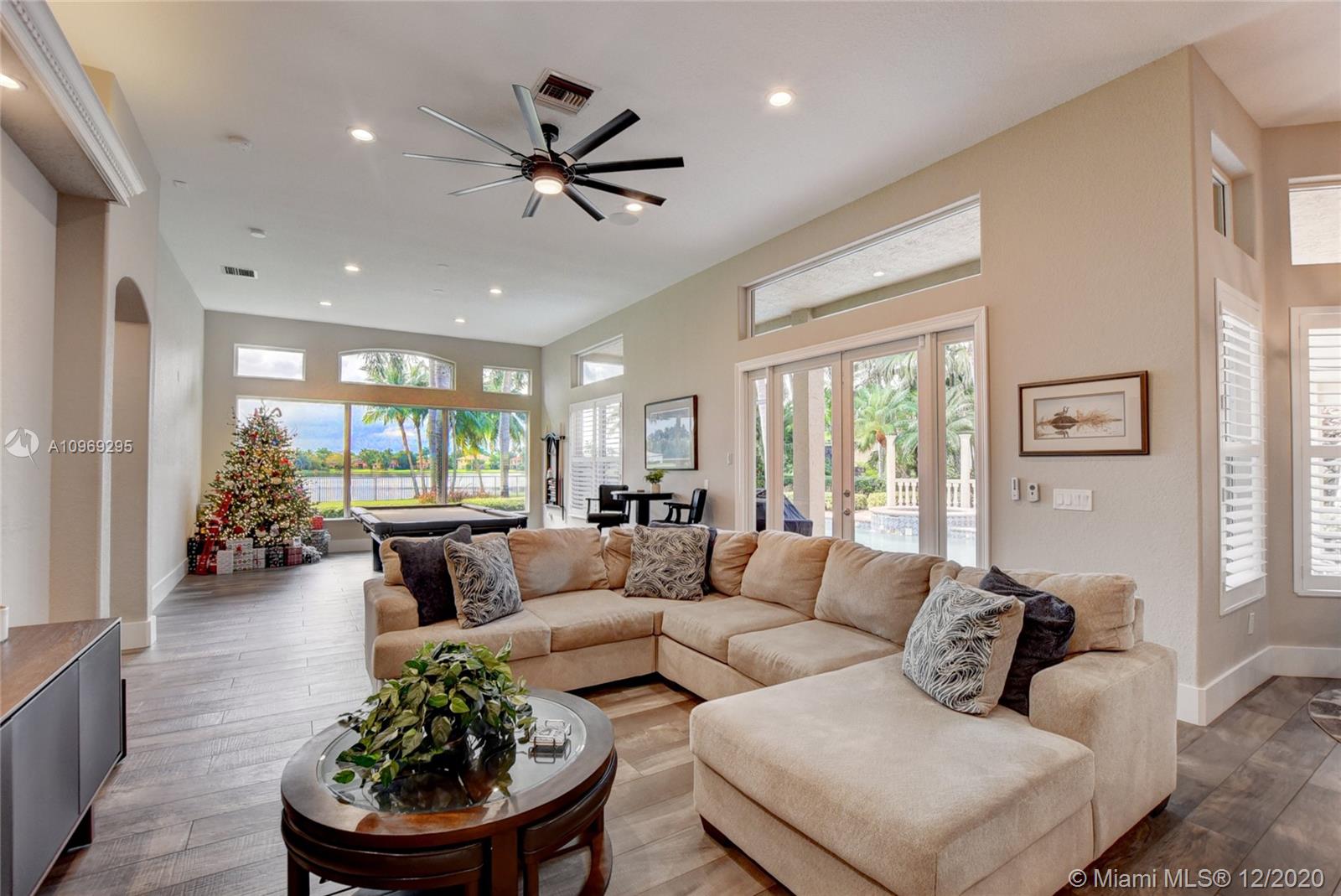 Gorgeous lake view from this immaculate, completely remodeled 5 bedroom + dedicated office + great room/3 bath residence in guard-gated Long Lake Estates. Impact glass windows/doors showcase generous yard, salt system pool w/raised spa, & wide view of the lake. Meticulously maintained & tastefully updated w/high-end finishes: porcelain wood tile flooring w/new 7.25" baseboards, quartz bathroom countertops, undermount sinks. Newer roof (2007) w/Roof-a-cide treatment, New a/c's, new Rheem water heater, new LG washer/dryer and all new Samsung & GE Profile kitchen appliances. U-line wine fridge, Plantation shutters, customized shelving in all closets. 3-car garage w/impact resistant garage doors, higher horse power motors & app-controlled entry. Whole-house water filtration/softening system.