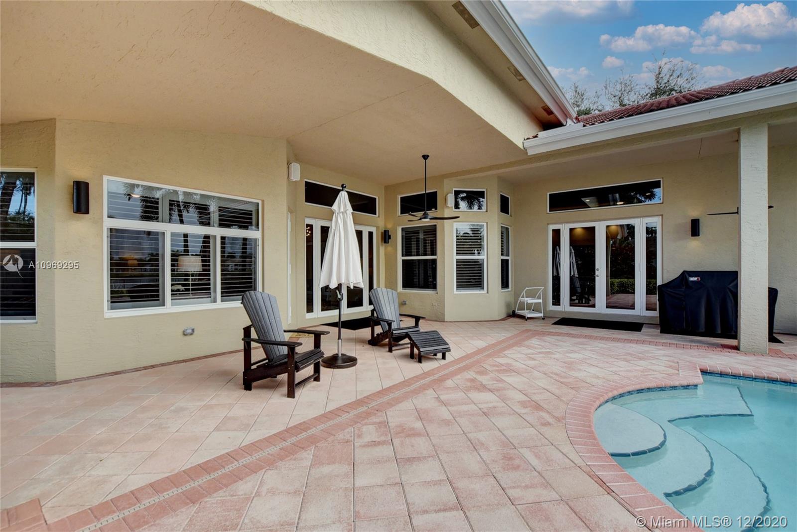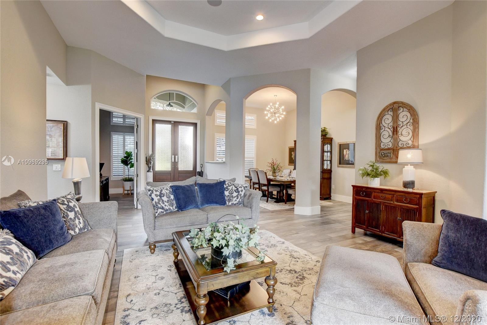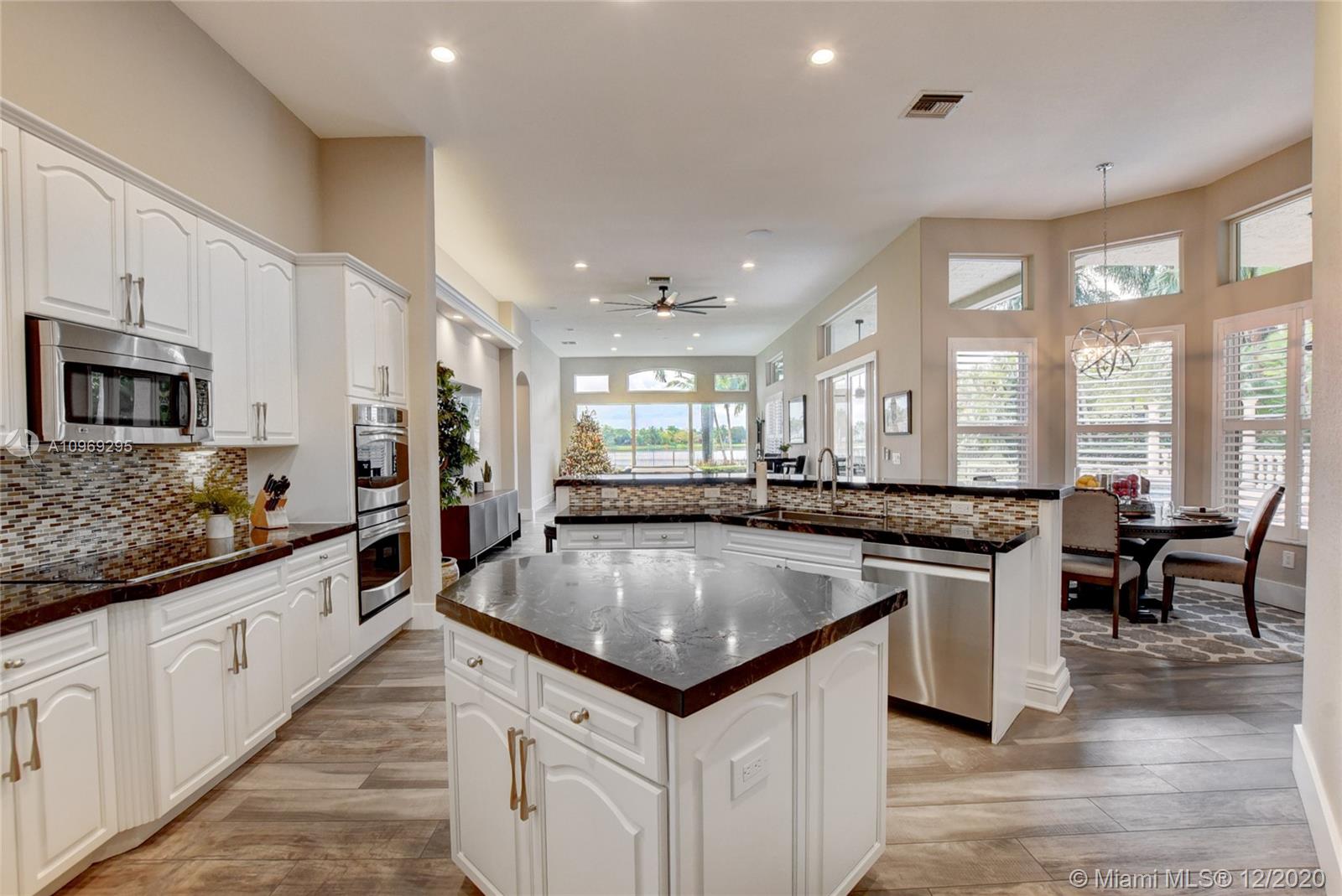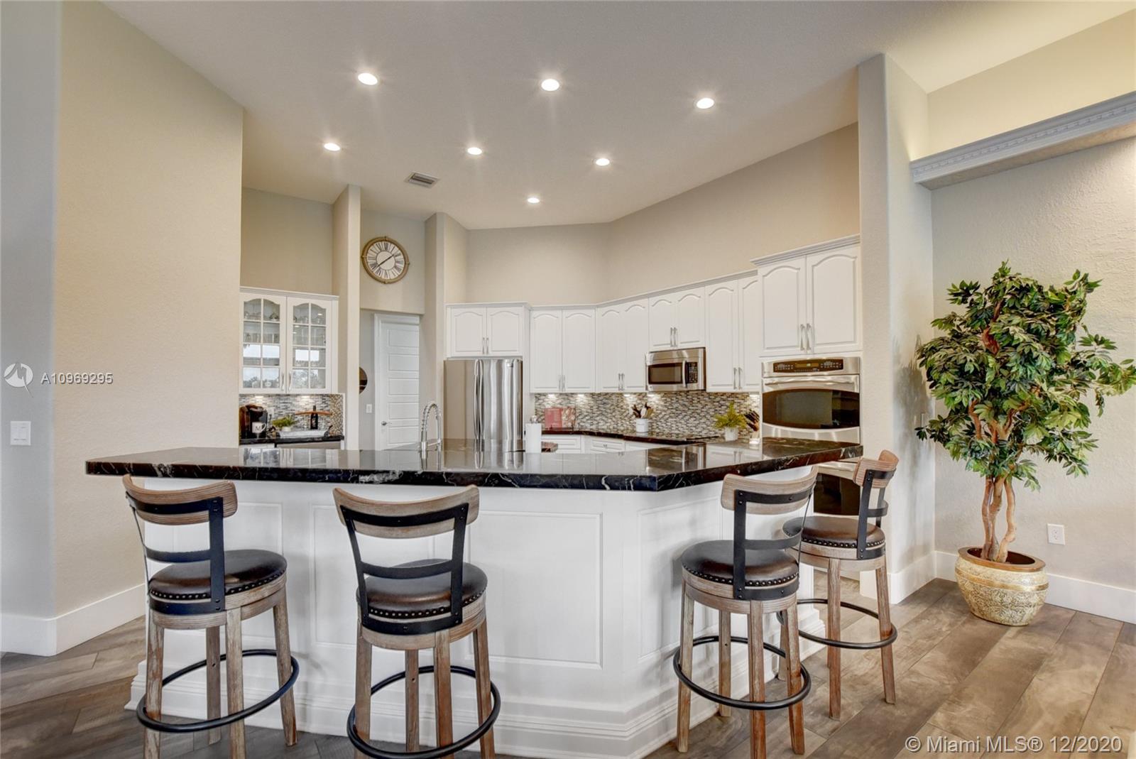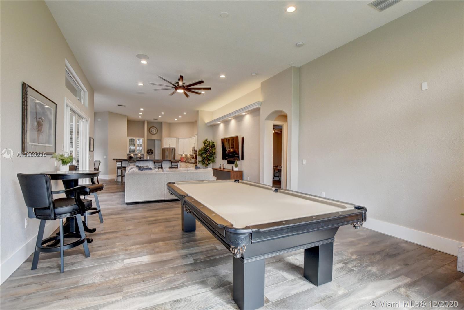 Gorgeous lake view from this immaculate, completely remodeled 5 bedroom + dedicated office + great room/3 bath residence in guard-gated Long Lake Estates. Impact glass windows/doors showcase generous yard, salt system pool w/raised spa, & wide view of the lake. Meticulously maintained & tastefully updated w/high-end finishes: porcelain wood tile flooring w/new 7.25" baseboards, quartz bathroom countertops, undermount sinks. Newer roof (2007) w/Roof-a-cide treatment, New a/c's, new Rheem water heater, new LG washer/dryer and all new Samsung & GE Profile kitchen appliances. U-line wine fridge, Plantation shutters, customized shelving in all closets. 3-car garage w/impact resistant garage doors, higher horse power motors & app-controlled entry. Whole-house water filtration/softening system.
