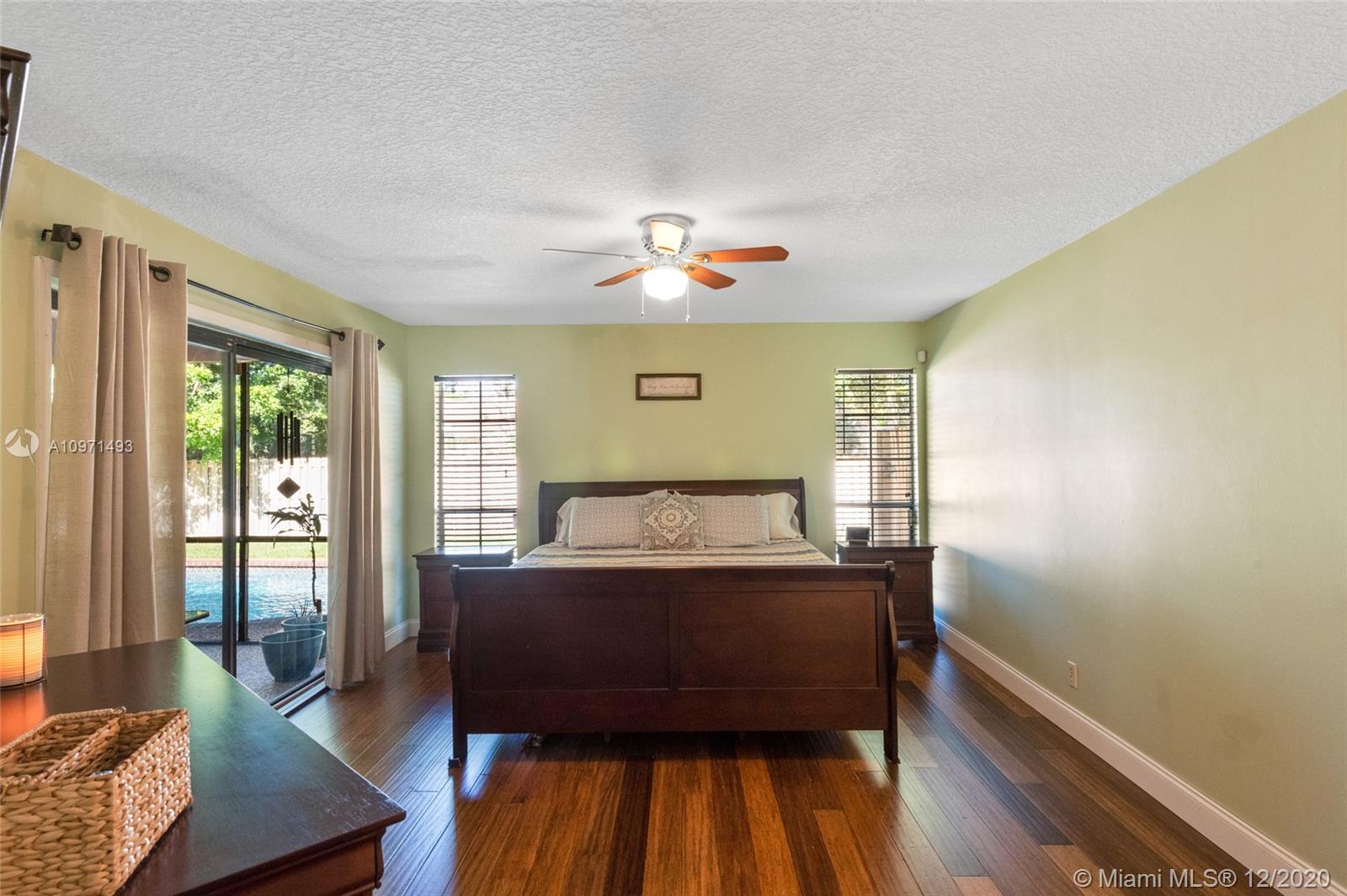 This spacious home features 4 bedrooms (split floorplan), 3 bathrooms (1 cabana bath), 2-car garage, pool, canal, and is located next to Countrywood Park. Other features include updated wood flooring through most of the home, updated kitchen with granite countertops and breakfast nook area, roof installed in 2013, HVAC handler newly installed, updated baseboards, crown molding, and recessed lighting. Exterior features include circular driveway, fully fenced backyard, covered and screened patio, pool and extended outdoor patio area. Very private backyard and a great space for entertaining.