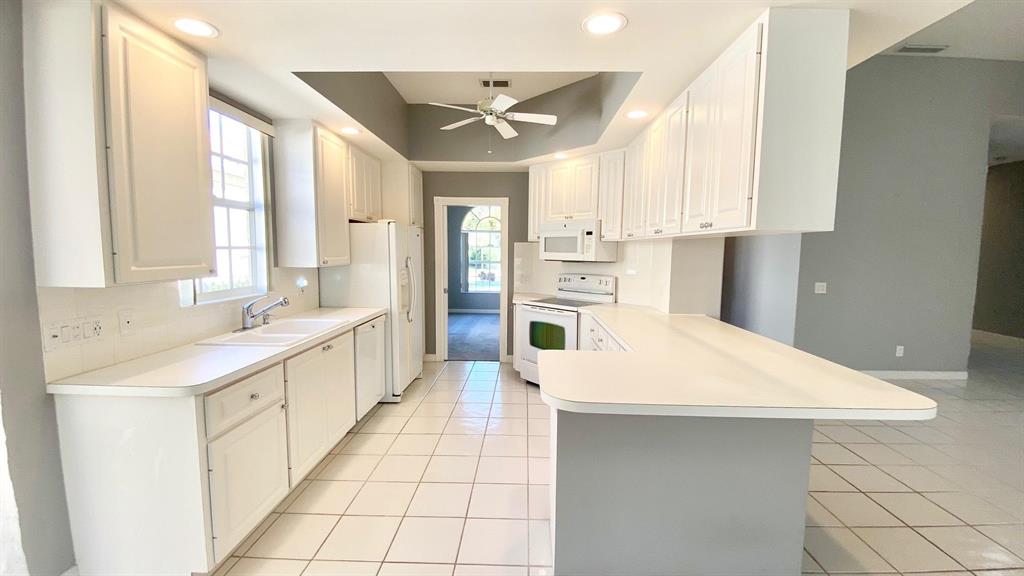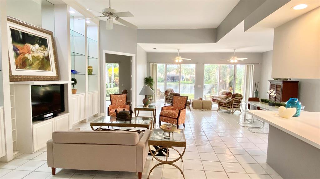 This Expanded Oakmont model has tile through the main living areas and master bedroom, new carpet in the den and guest bedrooms, fresh paint throughout. Stunning 12 ft ceilings in the great room and a built in entertainment center,10 ft ceilings elsewhere. The expanded living space offers many options for furniture placement, with an open patio and views of the lake, fenced in yard, large electric awning, perfect for shaded outdoor dining! This property also boast the popular ''side load garage'' which allows plenty of parking options. the ac has been replaced and updated kitchen appliances. The master suite has generous closet space and a unique double bathroom arrangement, one side has a deep Roman tub, the other has a large walk in shower... both with its own sink, vanity and toilet.