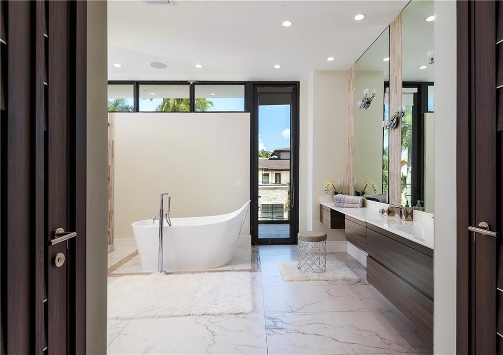 Best priced newer construction home w/100' of WF in Las Olas!! Allow yourself to be taken into pure bliss over this beautiful masterpiece. Equipped with luscious modern style & sleek tones, this property looks out on the water & takes you on a journey of luxury & enjoyment. With it's beautiful design & immense amenities, this oasis offers the ultimate lifestyle living! This villa boasts 2,000 square feet of outdoor lounging including a one of a kind 40' Infinity pool, hot tub, & gorgeous water views that include dock space for up to an 80 foot yacht. Along with an open-air design & 30 foot ceilings that breathe life into the interiors, the house is fitted with oversized master, Italian kitchen appliances, and smart-home systems, including a fully-integrated Sonos sound system.
