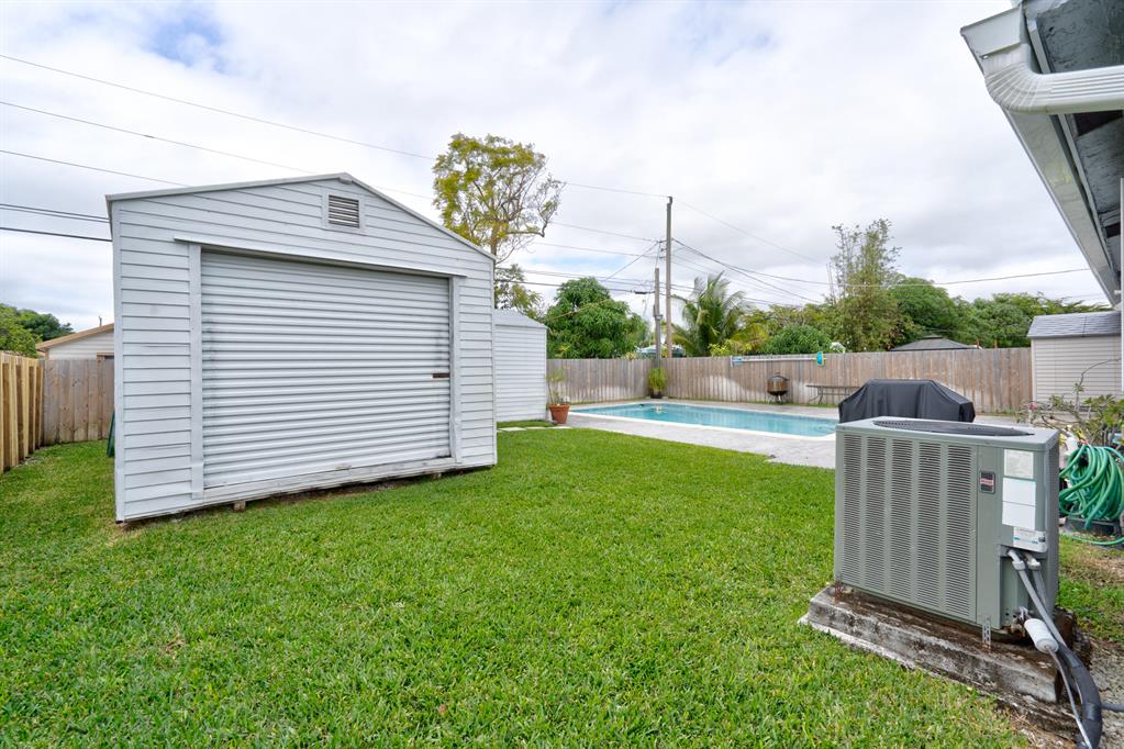 This well-appointed 3 bedroom, 1 bath home offers an open floorplan, impact windows, accordion shutters, neutral tile, crown molding, and high hat lighting. The beautifully renovated kitchen features high-end Samsung stainless steel appliances including a double oven, granite countertops, and oak cabinetry. The private master (10x21) boasts an oversized walk-in closet with a custom organizer and a door to the backyard. The backyard features a sparkling pool with a Diamond Brite warranty, 2 sheds with AC (12x24 & 10x14), and a third shed housing energy efficient front-load Samsung washer & dryer. Just a few of many notable features include a 15,000 watt generator with direct line hook-up, a tankless water heater, upgraded 200-Amp GE electrical panel, and an automatic sprinkler system.