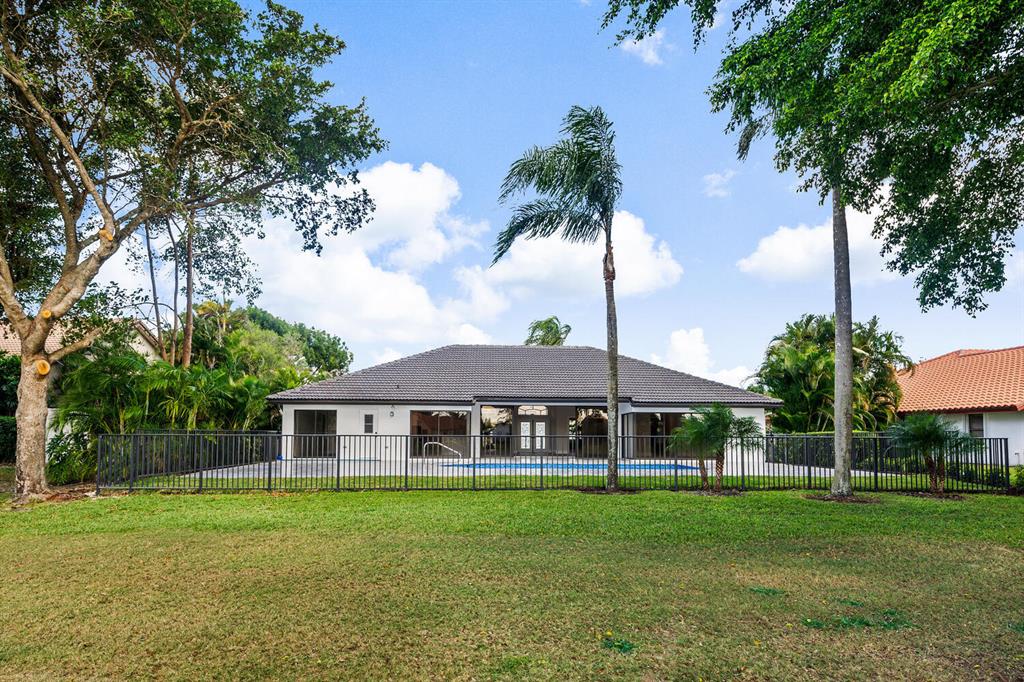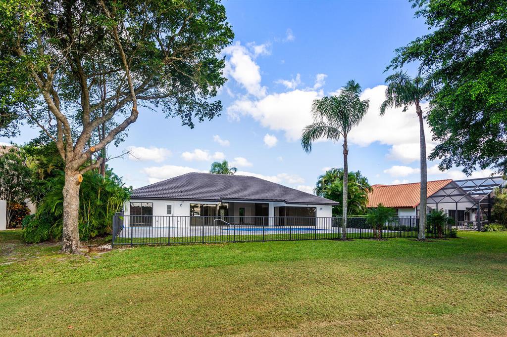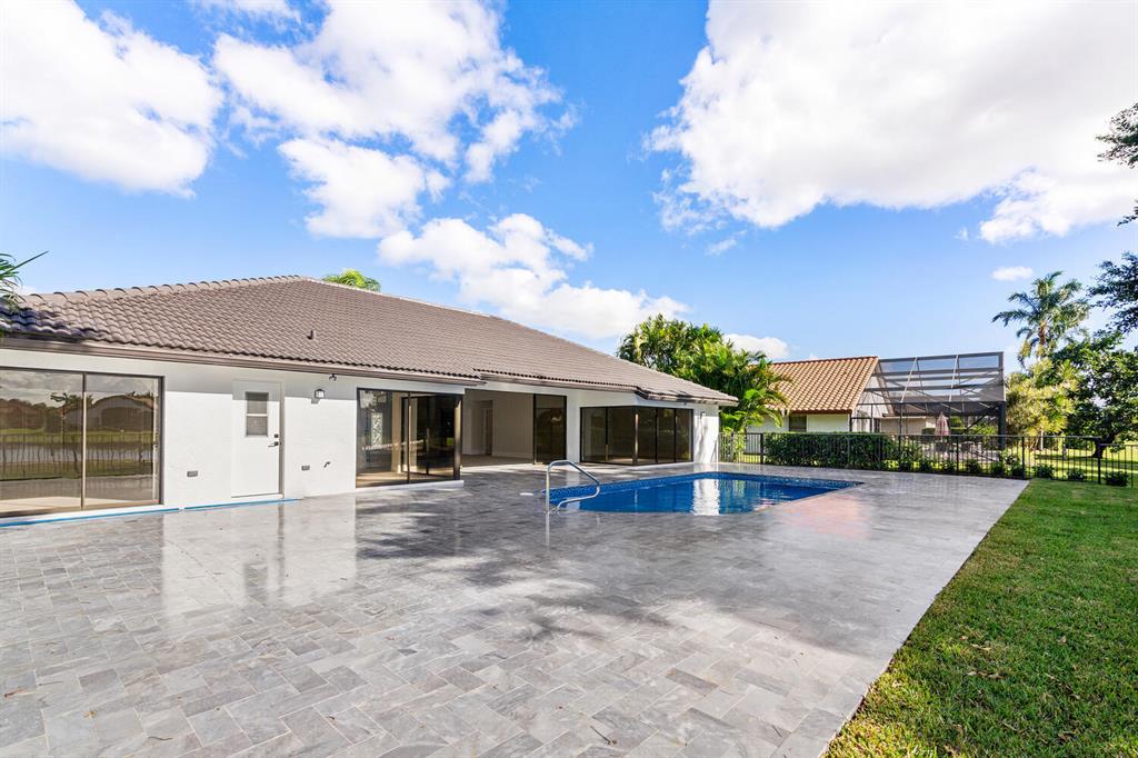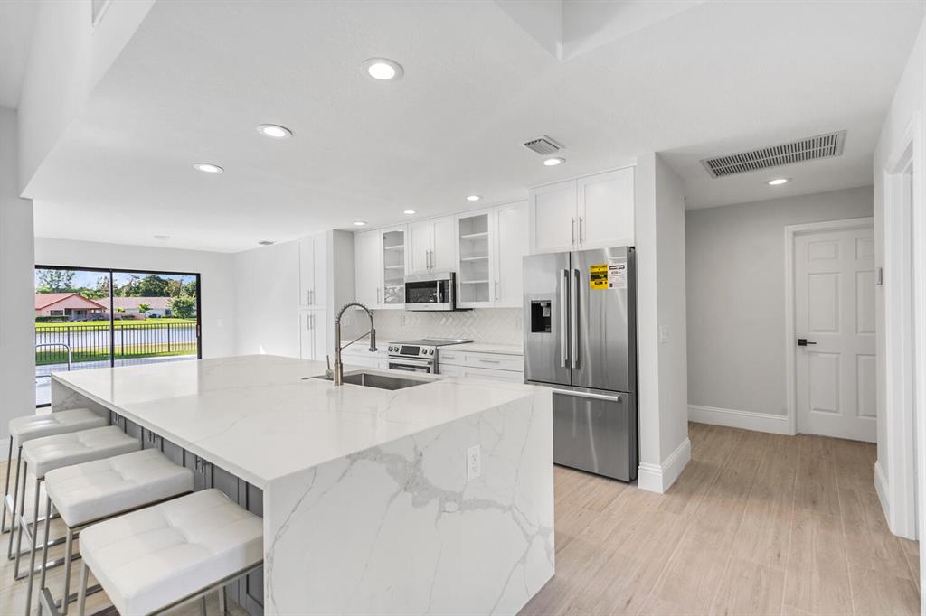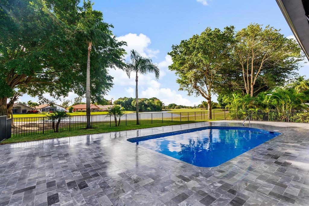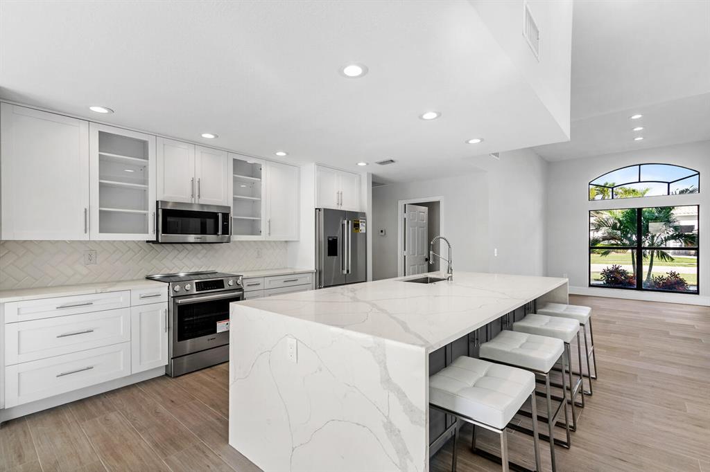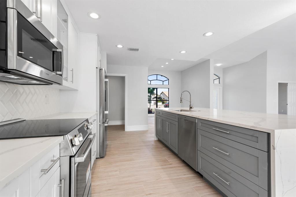 Stunning newly renovated 3 bedroom, 2.5 bath pool home w/lake views. Italian porcelain plank flooring throughout. New kitchen & baths include solid wood shaker cabinetry, high end designer quartz countertop throughout. Brand new never used Bosch Appliances w/LG front loading washer & dryer w/small wash drawer. 10 ft. island w/pull out drawers for dishes. A/C 2018. New marble drive + walkway. Expanded oversized marble pool patio pavers. Pool w/new diamond brite, pump & filter awaits you. Porcelain bath w/ designer tiles & high end fixtures. Garage freshly painted has a separate door and garage space for your golf cart. Lake and golf course views in between 2 golf courses, so NO GOLF CART traffic! Completely freshly painted inside and out. Enjoy the good life here in Boca Woods CC!