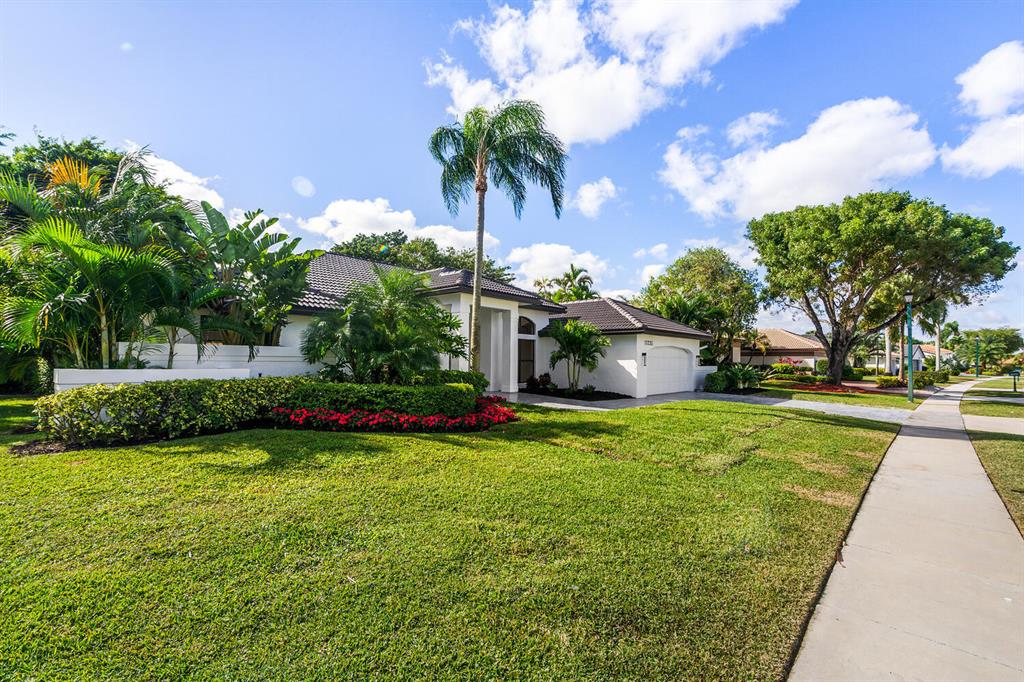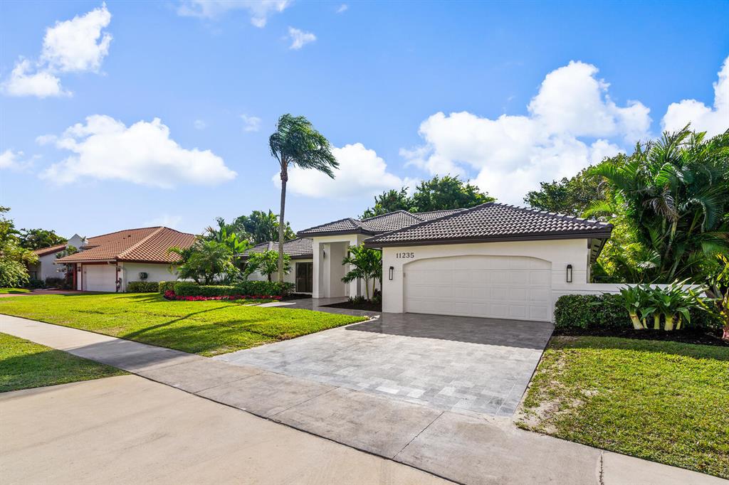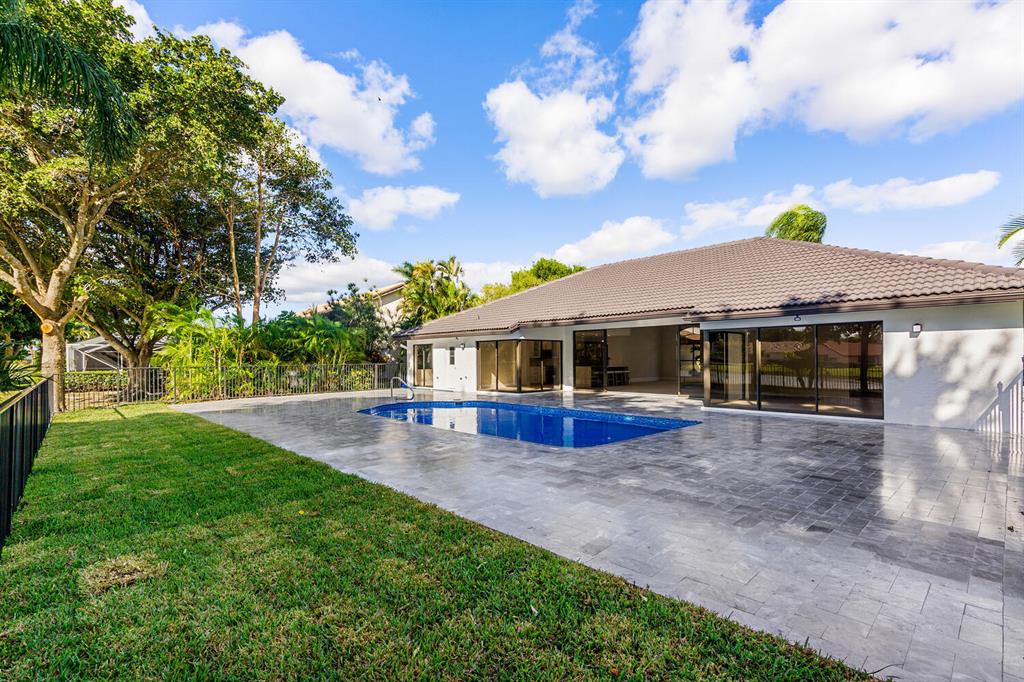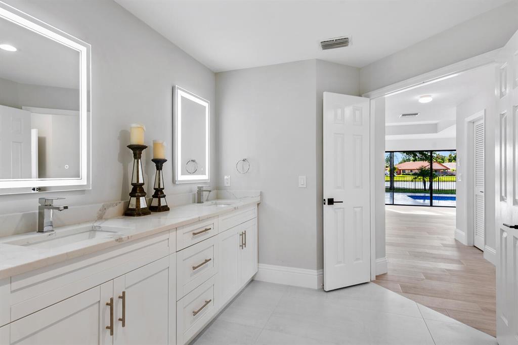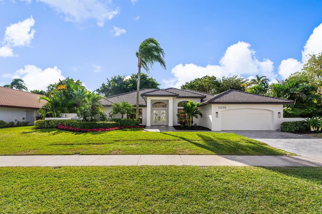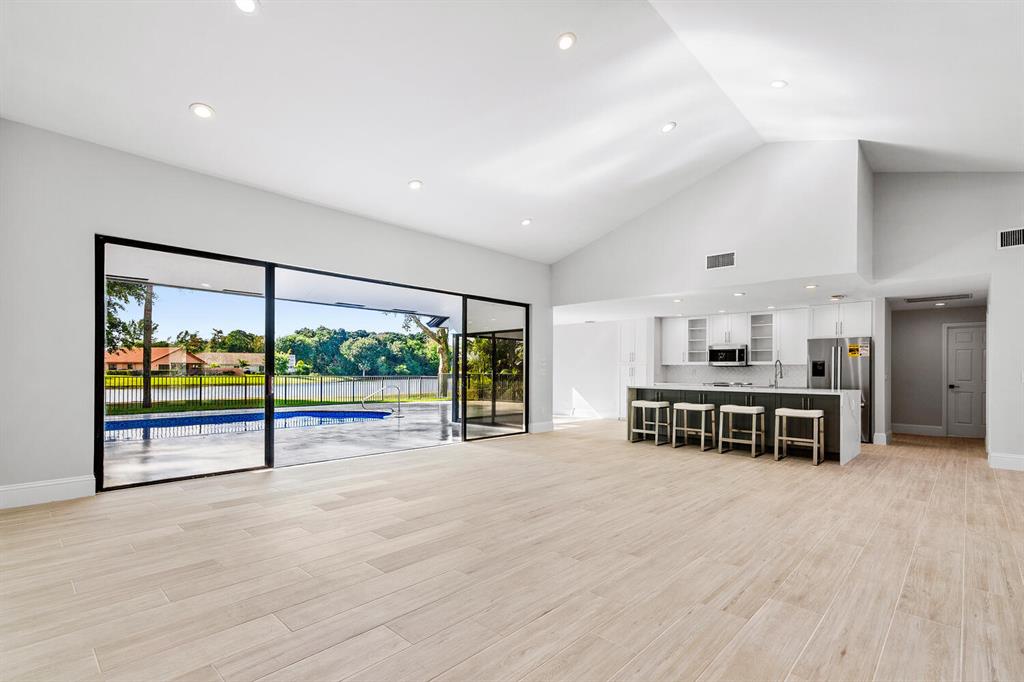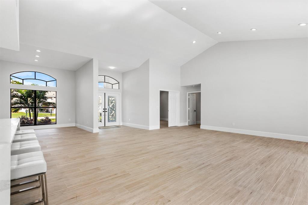 Stunning newly renovated 3 bedroom, 2.5 bath pool home w/lake views. Italian porcelain plank flooring throughout. New kitchen & baths include solid wood shaker cabinetry, high end designer quartz countertop throughout. Brand new never used Bosch Appliances w/LG front loading washer & dryer w/small wash drawer. 10 ft. island w/pull out drawers for dishes. A/C 2018. New marble drive + walkway. Expanded oversized marble pool patio pavers. Pool w/new diamond brite, pump & filter awaits you. Porcelain bath w/ designer tiles & high end fixtures. Garage freshly painted has a separate door and garage space for your golf cart. Lake and golf course views in between 2 golf courses, so NO GOLF CART traffic! Completely freshly painted inside and out. Enjoy the good life here in Boca Woods CC!