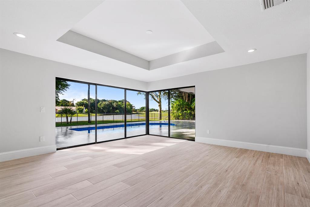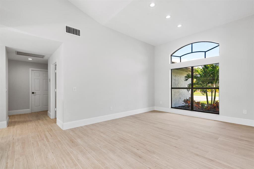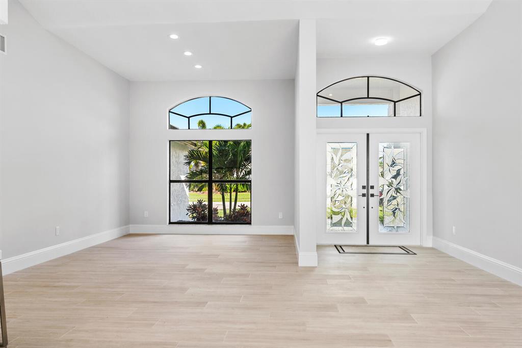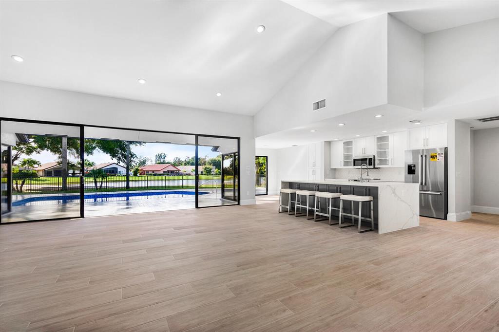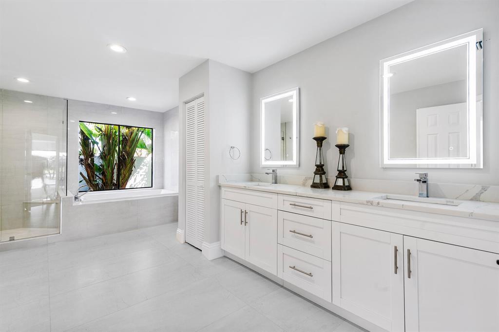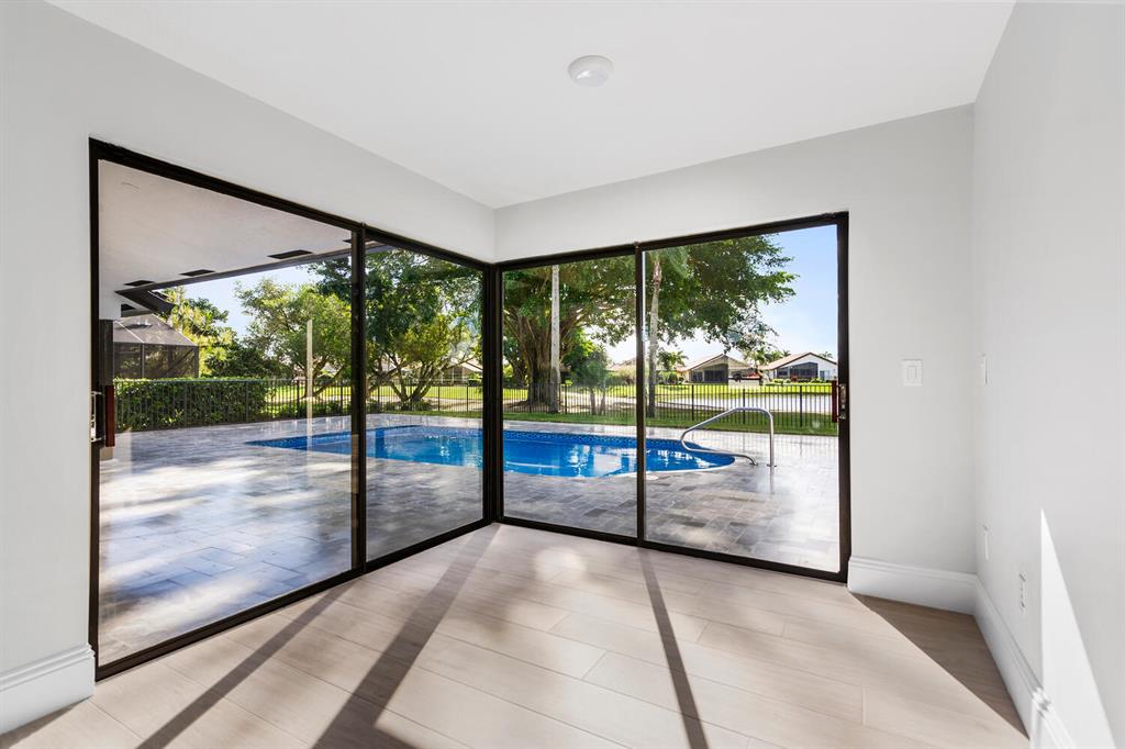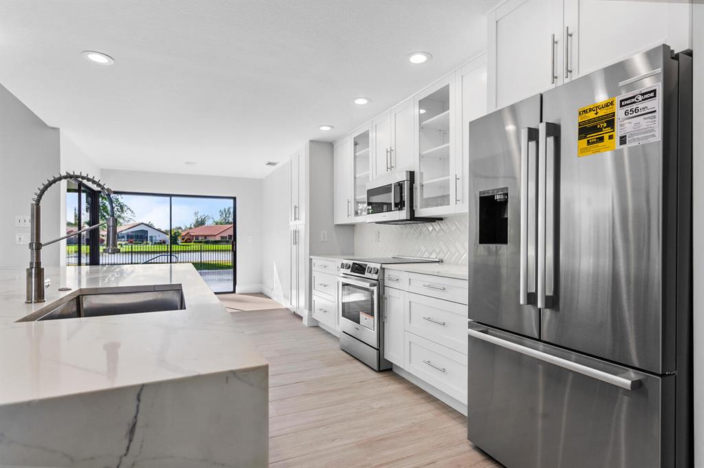 Stunning newly renovated 3 bedroom, 2.5 bath pool home w/lake views. Italian porcelain plank flooring throughout. New kitchen & baths include solid wood shaker cabinetry, high end designer quartz countertop throughout. Brand new never used Bosch Appliances w/LG front loading washer & dryer w/small wash drawer. 10 ft. island w/pull out drawers for dishes. A/C 2018. New marble drive + walkway. Expanded oversized marble pool patio pavers. Pool w/new diamond brite, pump & filter awaits you. Porcelain bath w/ designer tiles & high end fixtures. Garage freshly painted has a separate door and garage space for your golf cart. Lake and golf course views in between 2 golf courses, so NO GOLF CART traffic! Completely freshly painted inside and out. Enjoy the good life here in Boca Woods CC!