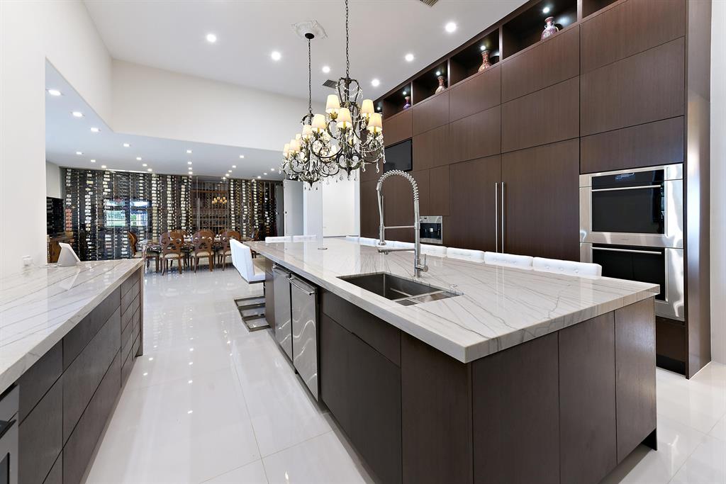 Luxurious double lot estate with more than 10,000 sq ft of living area, 7 large en suite bedrooms, 7 baths, 4 half baths, 3 garages, home theater, and library. Renovated in 2020 with meticulous attention to detail with the use of limestone, marble, porcelain, exotic parquet and hardwood Mahogany for various floors throughout this high end finished home. Fabulous modern chef's kitchen custom built 2020 with top of the line appliances including a 9ft professional hood. 14 ft center island gazes into huge temperature controlled wine cellar with 3000 bottle capacity. Large pantry and laundry room with additional subzero fridge. Three spacious screened porches and 2 wrap around balconies. 4 fireplaces. Marble pool deck surrounds 61 ft pool & spa overlooking golf view.