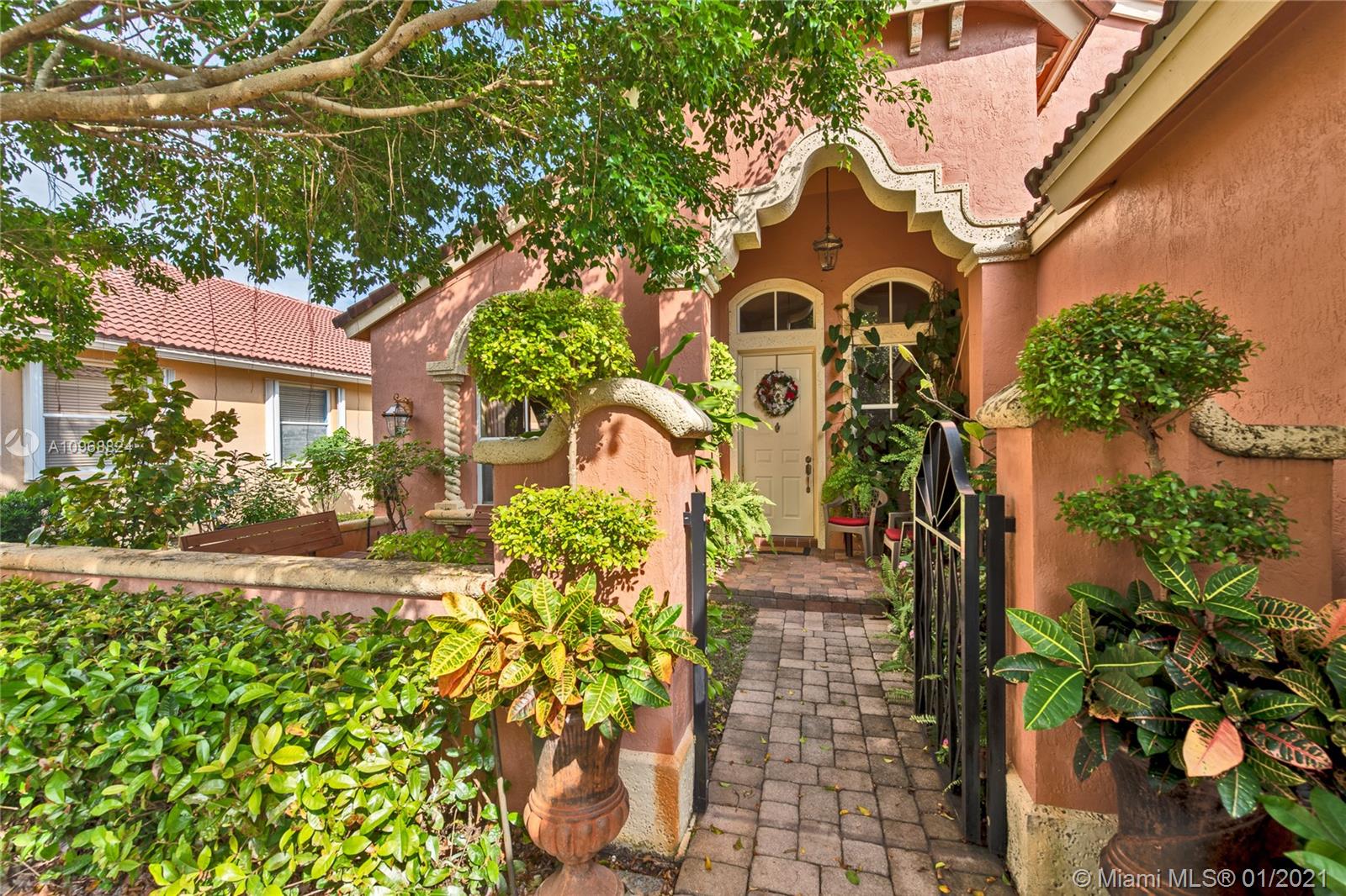 WELCOME HOME to this beautiful and impeccable one story house, located in the gated community of Monaco in Sunset Lakes, West of I-75 this home enjoys, 3 bedrooms 2 full baths, 2-car garage with a paved driveway. Beautifully upgraded front elevation stands above others in the neighborhood. Enjoy the birds singing in the spacious front yard garden. Tile floors throughout, higher ceilings with corner round walls. Kitchen equipped with tall wood kitchen cabinetry and Corian countertops. Spacious full sized laundry room. Large fenced yard that can easily accommodate a pool and outside entertainment areas. Enjoy all the amenities the clubhouse has to offer, sauna, gym, pool, kids pool, volleyball, tennis, basketball at a low$ maintenance. Make your appointment now. This one is a must see!