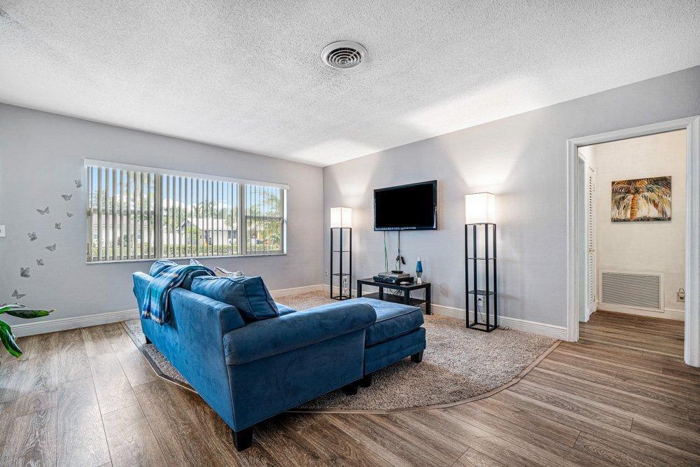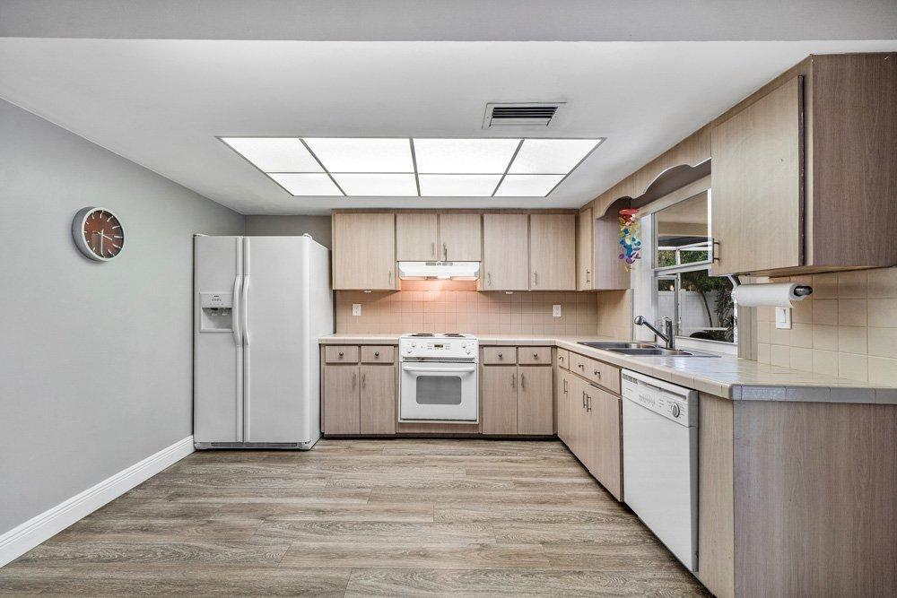 Outstanding 3 bedroom, 2 bathroom pool home in Boca Raton Square! This home is split bedroom plan that is open, airy, light, and bright. There is beautiful laminate wood plank floors in the living room and kitchen. The kitchen is very large and has tiled counter tops, tiled backsplash with a good sized breakfast nook, and a passthrough window to the gorgeous patio area. The second full bathroom has a tub/shower and has cabana bath access. The outdoor pool and screened patio area is fantastic with a large covered area, patio floor was res-stoned, and completely fenced in backyard that is very private. There are many upgrades and updates which include full HURRICANE protection. Most windows are HURRICANE impact windows, and a few set of newer sliders on the back patio have HURRICANE