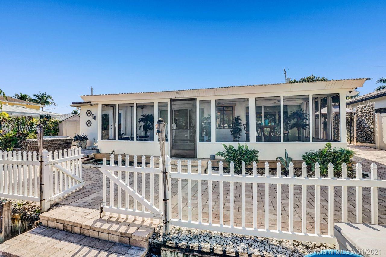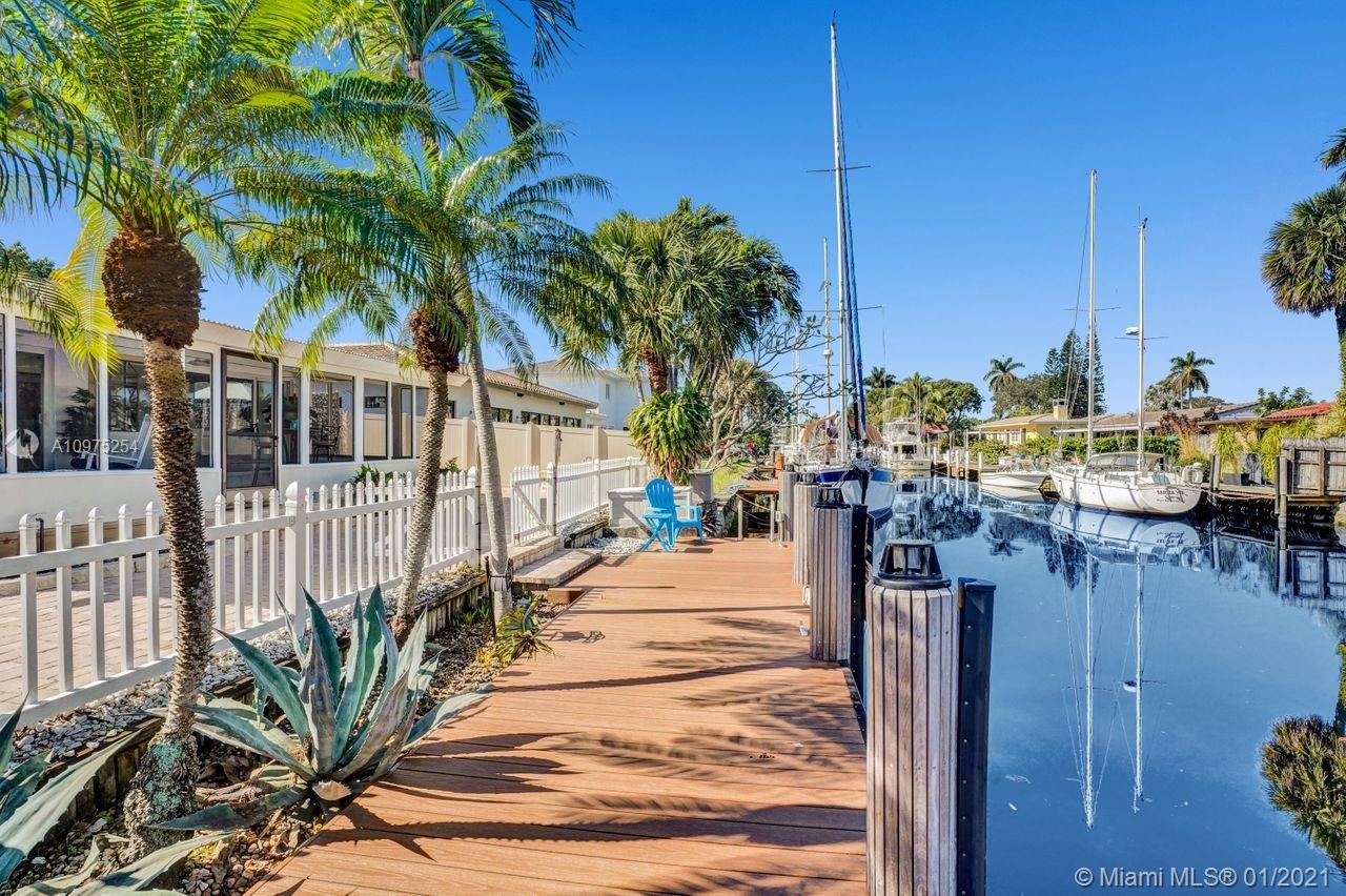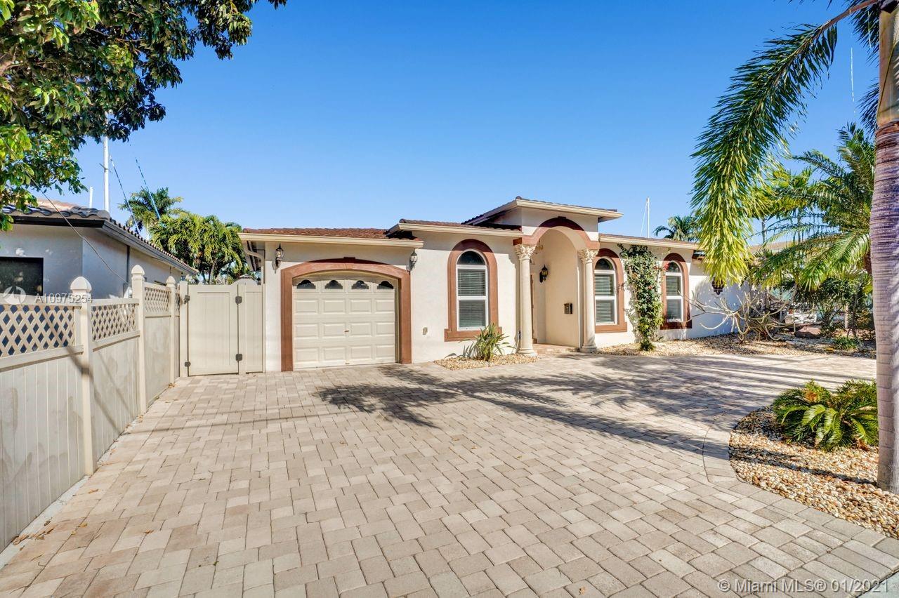 Bring your boat-waterfront beauty- -doubled in size in 2008 2,220+SF. 3 bed + den/office & 2 1/2 bath. Impact doors & windows, pavered circular driveway w/1-car garage & large rear screened-in patio. Dock/seawall & new Dingy in great condition -65' on water, in-water color accent lights. Fully fenced, space to entertain, BBQ gazebo w/pass-thru to kitchen, shed w/power outlets & outdoor shower. BIG master suite w/walk-in closet, high ceilings, ensuite bathroom w/Jacuzzi tub, shower, toilet room & vanity. Open kitchen w/wood cabinets, desk, counter bar & gas stove. Big Florida Room w/wall of windows out to dock. ADT security, 2 ACs. NOT A TEARDOWN. Laundry in epoxy floor garage w/TV. Office was 2nd car garage. Ocean access, no fixed bridges. Galvanized roof. Larger than SF on record
