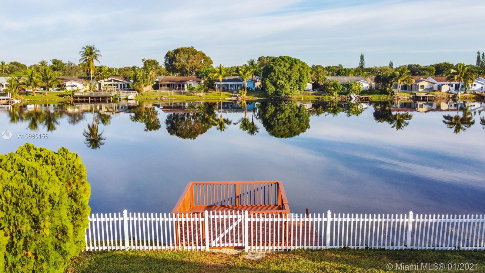 Home Sweet Home! Move-in-ready 4 bed/2 bath in Palm-Aire with sweeping lake views and heated salt water pool. Spacious white kitchen with granite counter tops, stainless steel appliances, breakfast bar, custom bottle rack, pass-through to outside, and generous storage. Primary bedroom features walk-in closet and bay window with relaxing water views. Both bathrooms renovated with new glass shower doors. Custom closet in one of the bedrooms. Brazilian cherrywood and tile flooring. Brand new deck on lake, fully fenced yard, NEW full-size washer and dryer (2020), tankless water heater (2018), and utility sink. Freshly painted exterior, adjacent storage room, extended 5-car driveway, sprinklers front and back, NEW AC package unit (2020). Storm ready with hurricane panels and generator hook-up.
