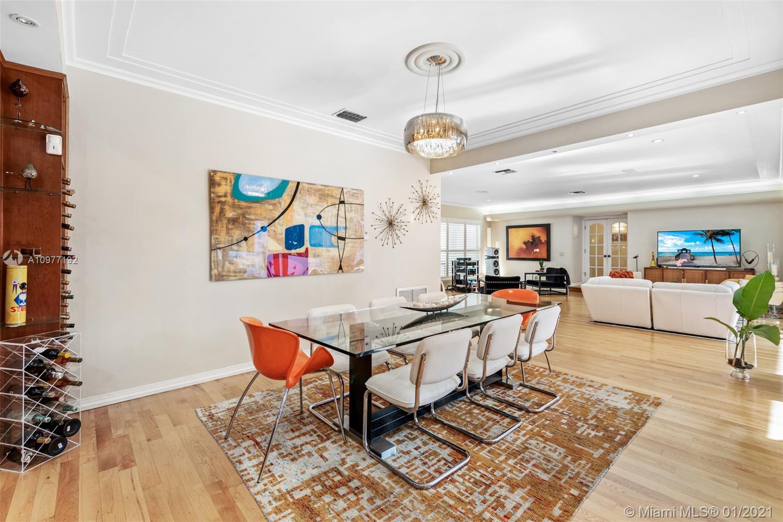 Prime Platinum Triangle location. Tropical oasis! Home sweet home featuring a brilliant integration of its sophisticated indoor and outdoor elements through the use of floor to ceiling impact glass walls which opens to convert fluid open spaces. Nestled with a lush 15571 sf lot. Great open floor plan, new gleaming hardwood floors, plantation shutters, 2 car garage and is ideally situated in a bike/walk friendly street. Outdoor dome screened large saline pool, roofed patio with built-in BBQ. Additional family room with office set-up. Charming and inviting! Lovely cared-for and updated. Move-in! A little gem and must be seen to discover more!! Appts with notice please.