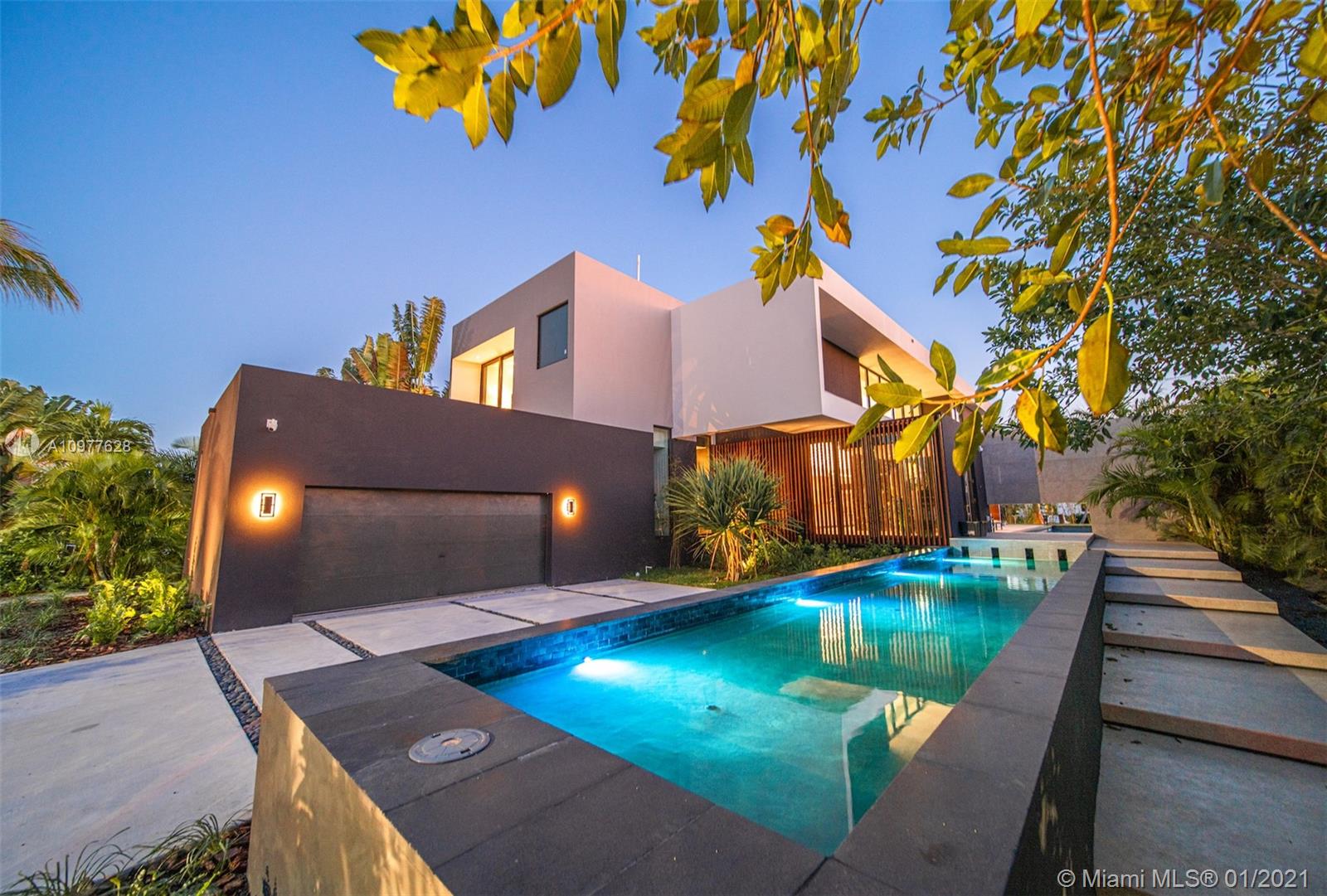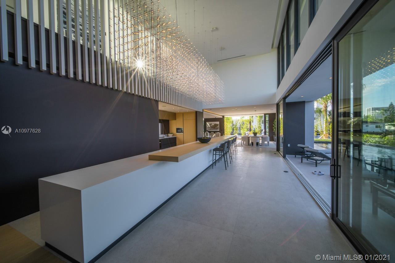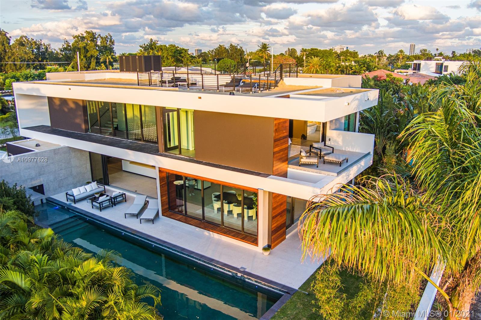 Villa "L'Artiste" is a modern estate that sits in a quiet gated community encompassing the famous Normandy golf club and brand new tennis center. The property broadcasts 5 bedrooms with 5 en-suite bathrooms and 1 powder room.Boasting opulence and sophistication with design by Togu, the main level of the home provides a fully equipped kitchen with Miele appliances, a 22 foot bianquissimo quartz countertop, 20 ft high soaring ceiling and a 20 ft long LED Chandelier across the living area. A 500 sqft Rooftop overlooks the Golf course, the canal and the Bay. Full size sliding doors lead to a 55 foot long boat dock and oversized heated pool prolonged by a decorative 40ft pond. Finally, Villa "L'Artiste" is staged by Meredith Baer with Modern furniture to boast luxurious indoor-outdoor living.