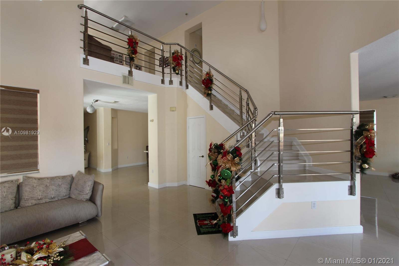 Great corner single home in Island at Doral. Spacious and bright areas, porcelain floor all over, Italian kitchen cabinetry, quartz counter top, studio and 1 bedroom downstairs, garage with laminate floor and fan. Enjoy the backyard with a pool and a trampolin. Stainless steel stairs railing give access to upstairs. Resting area.