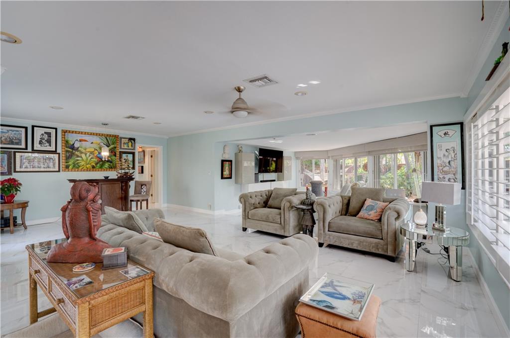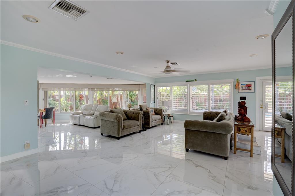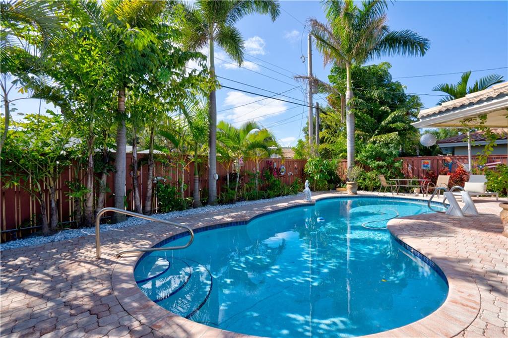 Welcome home to this terrific Coral Ridge home, located on a very low traffic street, yet walking distance to movies, shopping, restaurants and more. This home features a great open floor plan with split bedrooms, 32x32 porcelain tile throughout and plenty of space to entertain. All bedrooms are spacious with good closet space and the outdoor areas are designed for low maintenance with great hidden niches designed to allow you to enjoy the outdoors and beat the heat. The pool gets year round sunshine and there's a private outdoor shower. Impact windows with accordion shutters give dual protection, whole house generator and water purification system, too. 2 car garage with lots of parking and a short bike ride to the beach, this location is so private yet in the middle of everything!
