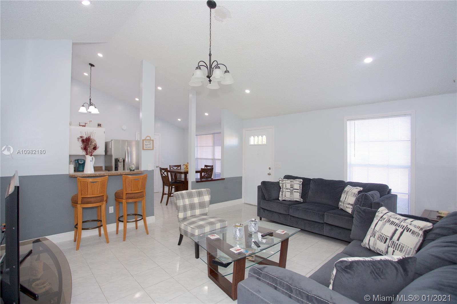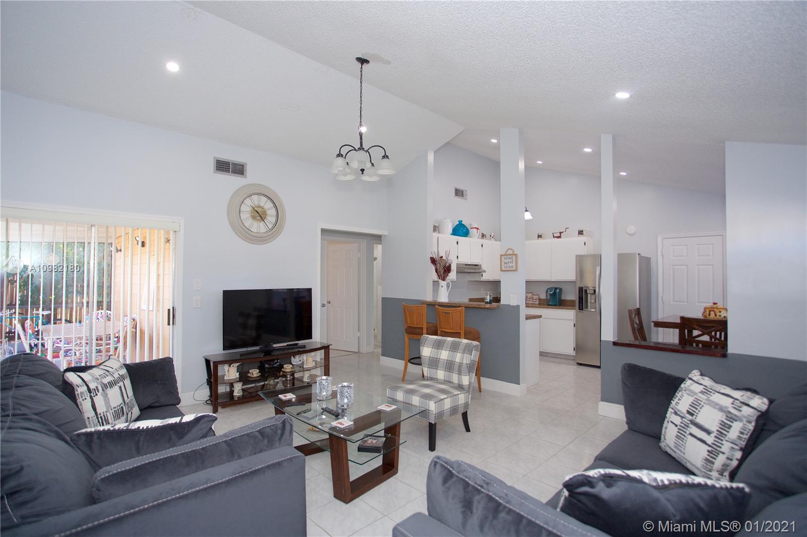 Beautifully remodeled 2/2 single family home in Honey Place of Miramar. Great open concept layout with vaulted ceilings in family room, kitchen, and dining. Stunning, modern, bathrooms with high-end finishes. All polybutelene pipes have been replaced with PVC and new drywall and fresh paint. Ample storage in the one-car garage. Fenced backyard with avocado tree and screened-in patio for morning coffee or evening wine. Very low association fee of $35/month and FHA, VA approved. Move quick on this one! Note: Washer and Dryer do not convey.
