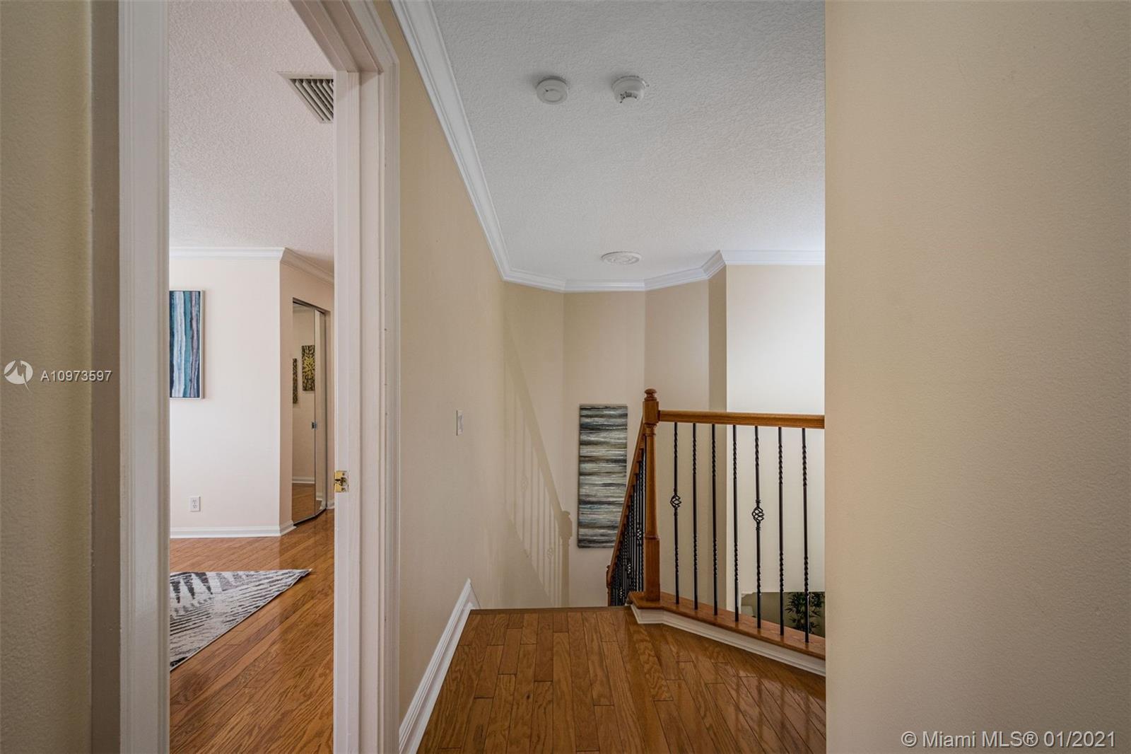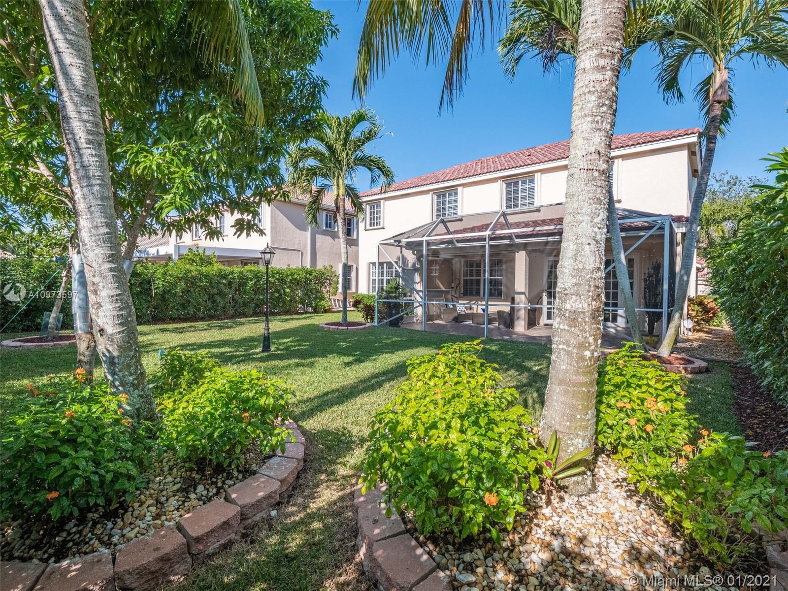 Beautiful two-story home with four bedrooms and two and a half baths plus a bonus room off the master bedroom. This home has been meticulously maintained by its original owners. Kitchen has been renovated with wood cabinets and stain steel appliances. Hardwood flooring throughout the 2nd story and stairs, stairs with wood and iron railings. Italian porcelain throughout the 1st floor. Family room with french doors leading to a nice screened patio and large backyard with space to build your dream pool. White plantation shutters and total accordion hurricane protection throughout the house. Nest Thermostats for both AC units. Gated community with club house, pool, playground for children and sports fields. Very close to library, shopping malls and major highways. Excellent Weston schools.