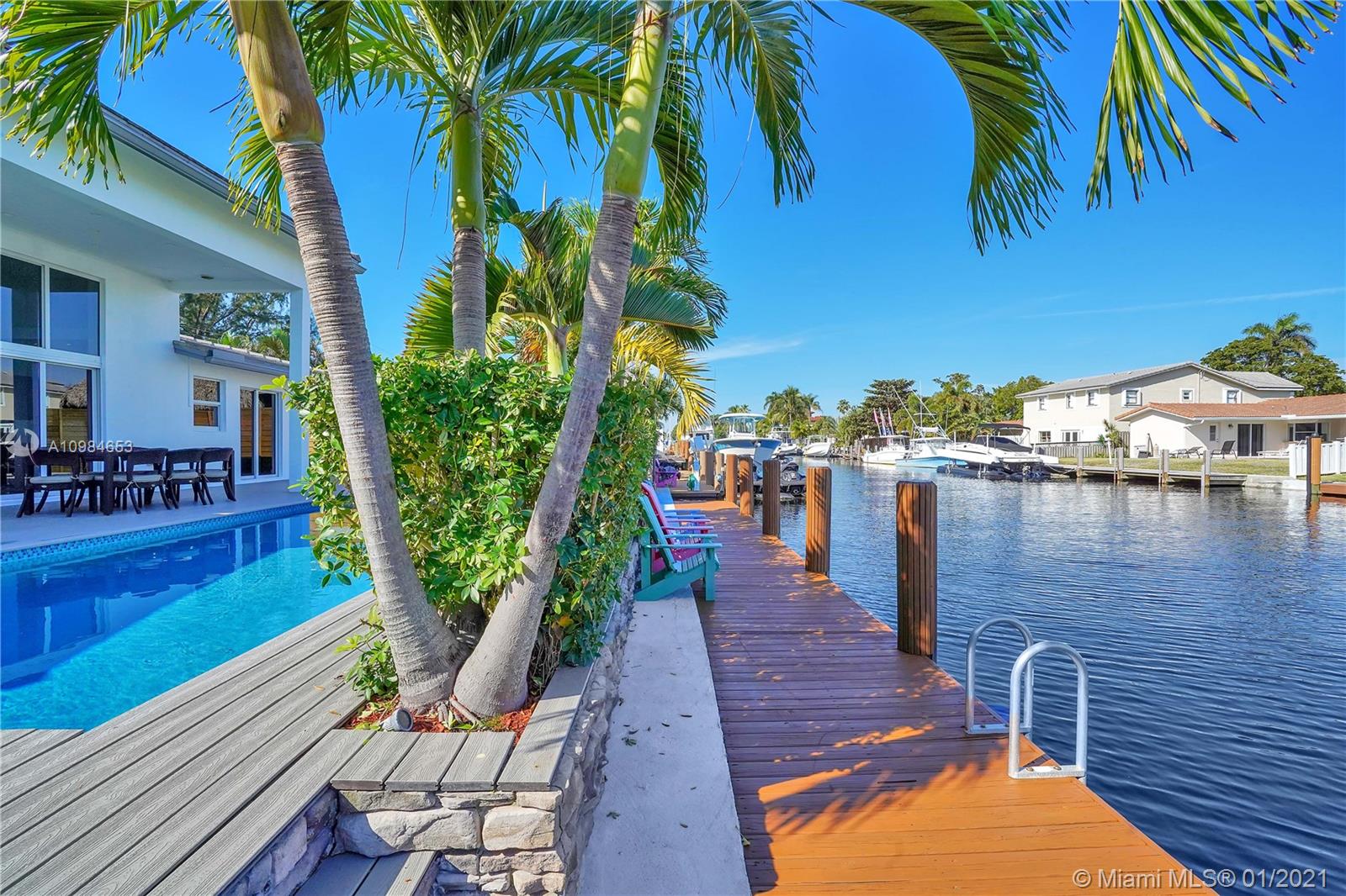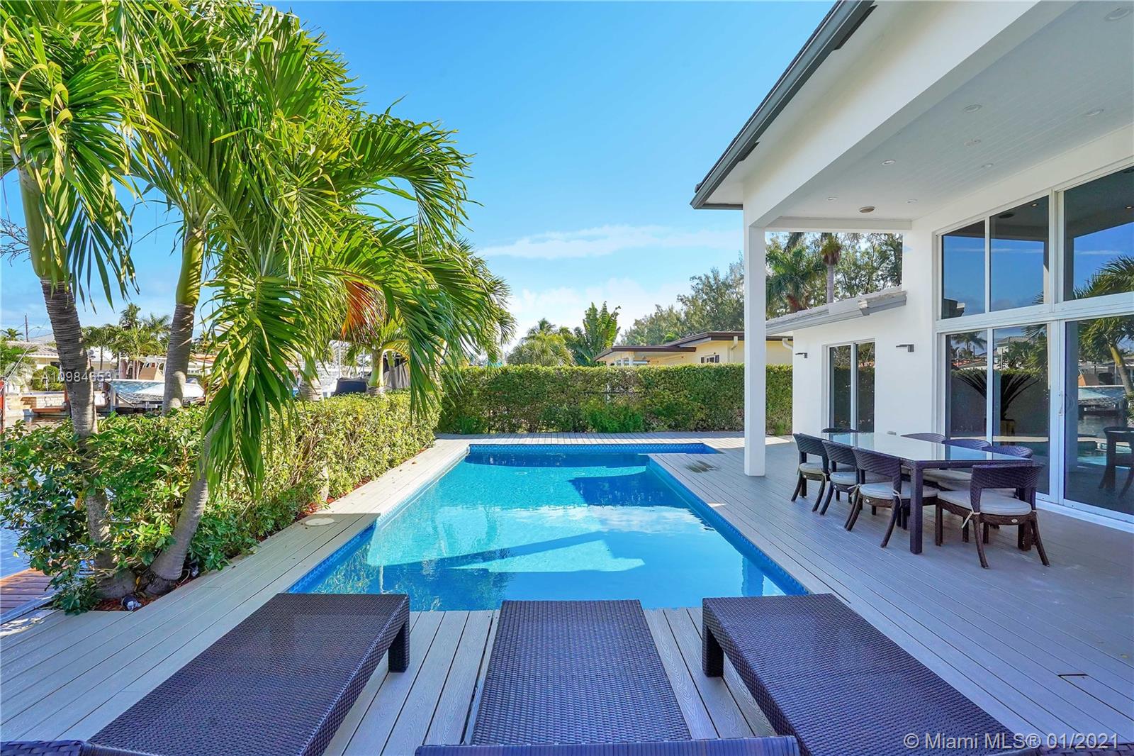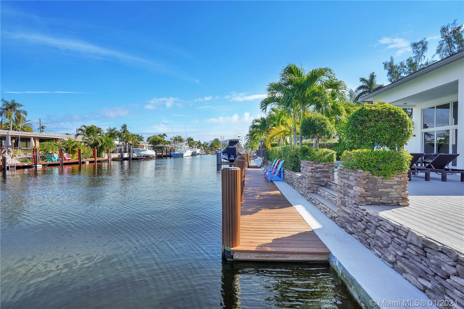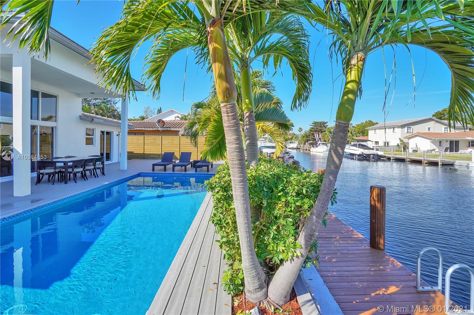 Welcome home to this modern 3 bedroom, 2 bath waterfront beauty with impact doors and windows. Newer construction with gorgeous volumes throughout, discerning buyers will love this bright, tastefully appointed boater’s paradise with 60 feet of deep-water dockage, no fixed bridges and one minute from the Intracoastal waterway. Beautiful heated pool with built-in spa, perfect for entertaining friends and family. Ideal location just minutes from the beach and social amenities. This gem is situated on a quiet residential street with no through traffic. Call today for a visit!