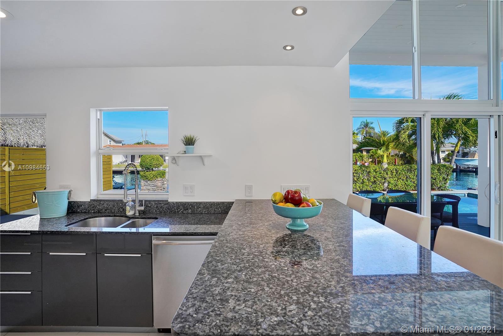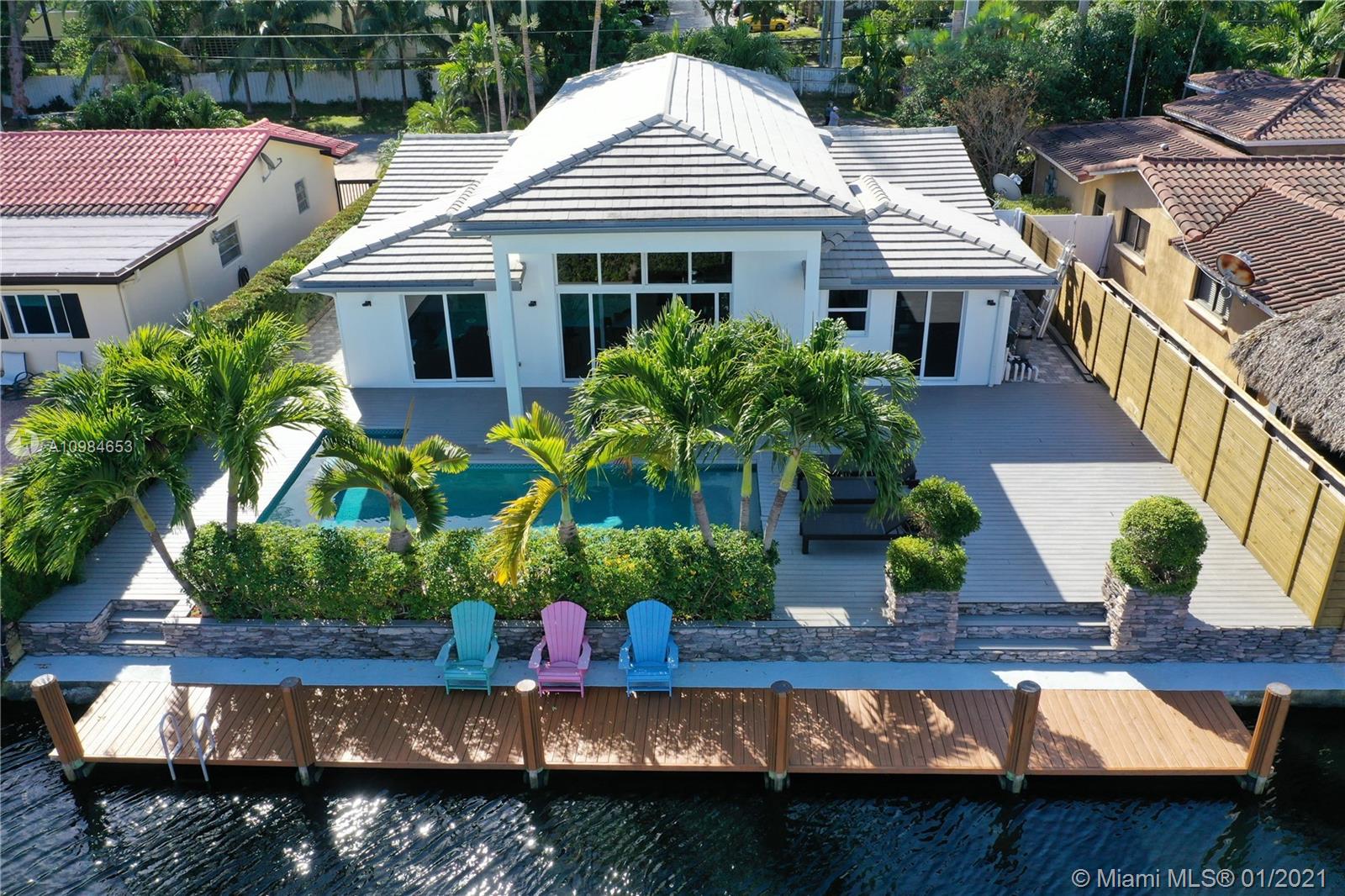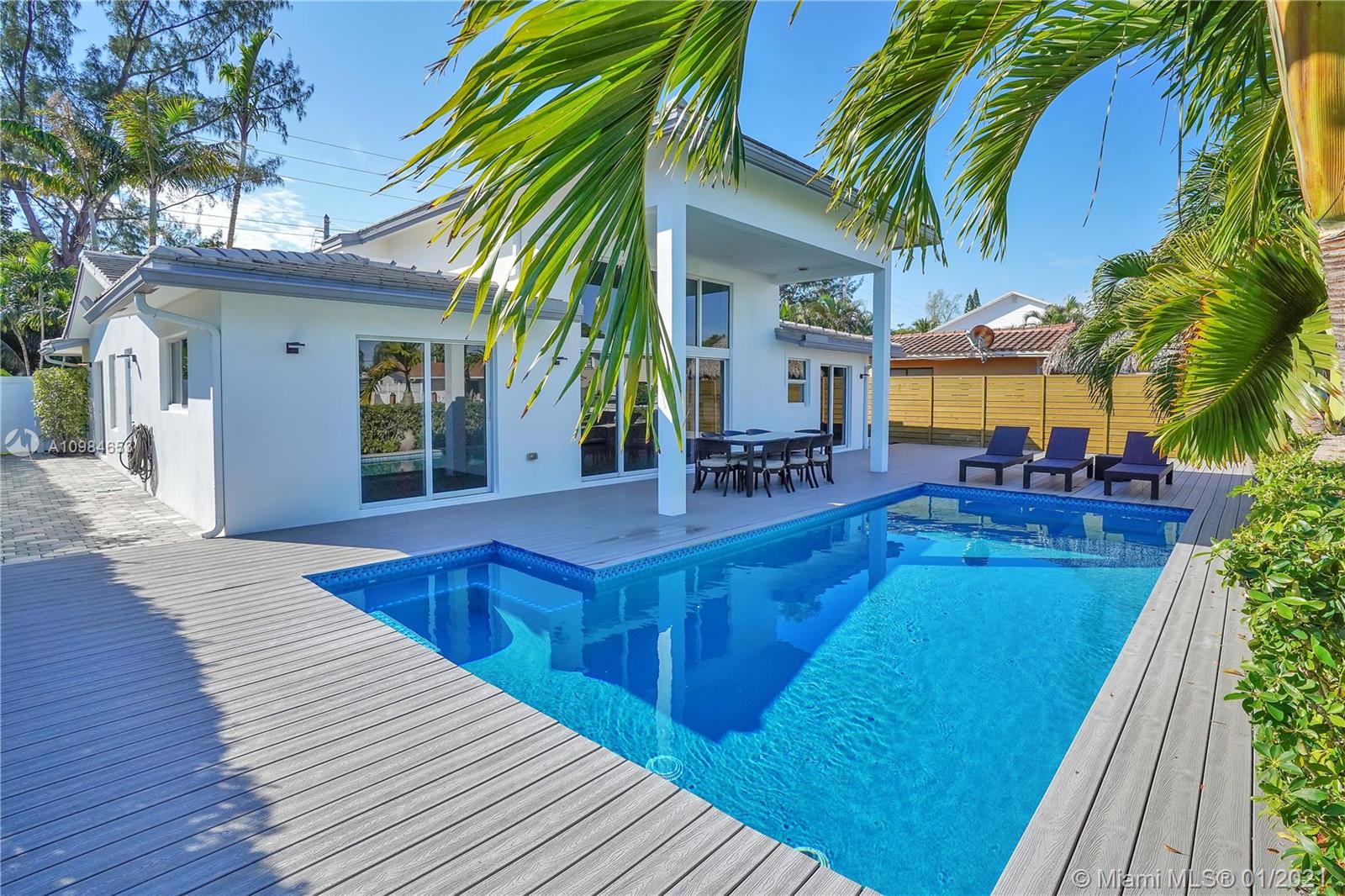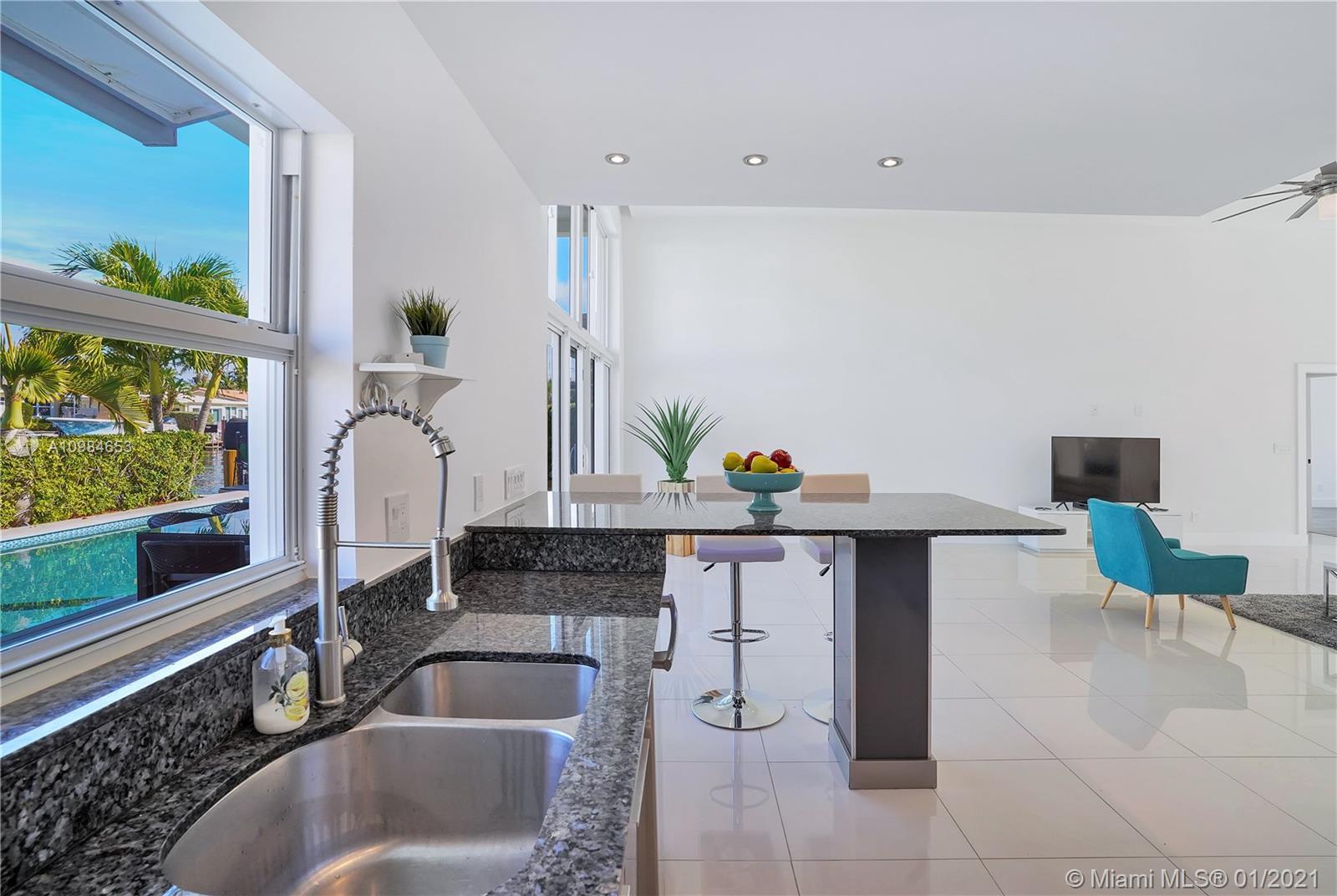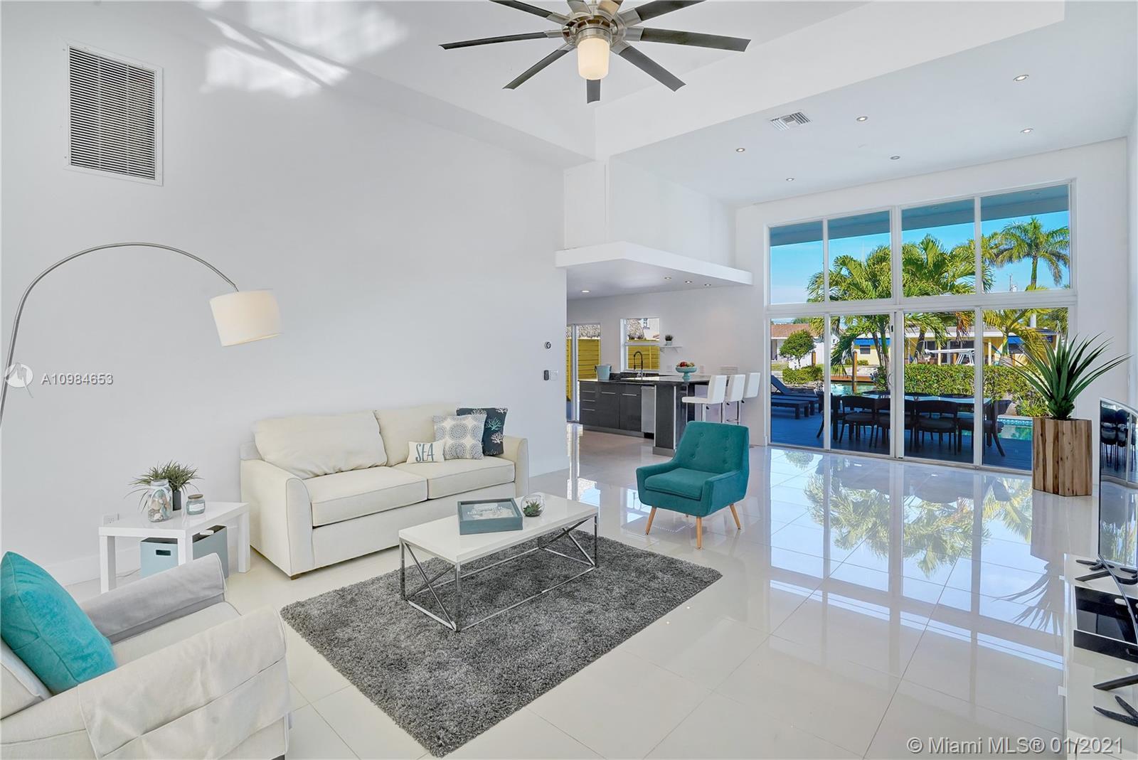 Welcome home to this modern 3 bedroom, 2 bath waterfront beauty with impact doors and windows. Newer construction with gorgeous volumes throughout, discerning buyers will love this bright, tastefully appointed boater’s paradise with 60 feet of deep-water dockage, no fixed bridges and one minute from the Intracoastal waterway. Beautiful heated pool with built-in spa, perfect for entertaining friends and family. Ideal location just minutes from the beach and social amenities. This gem is situated on a quiet residential street with no through traffic. Call today for a visit!