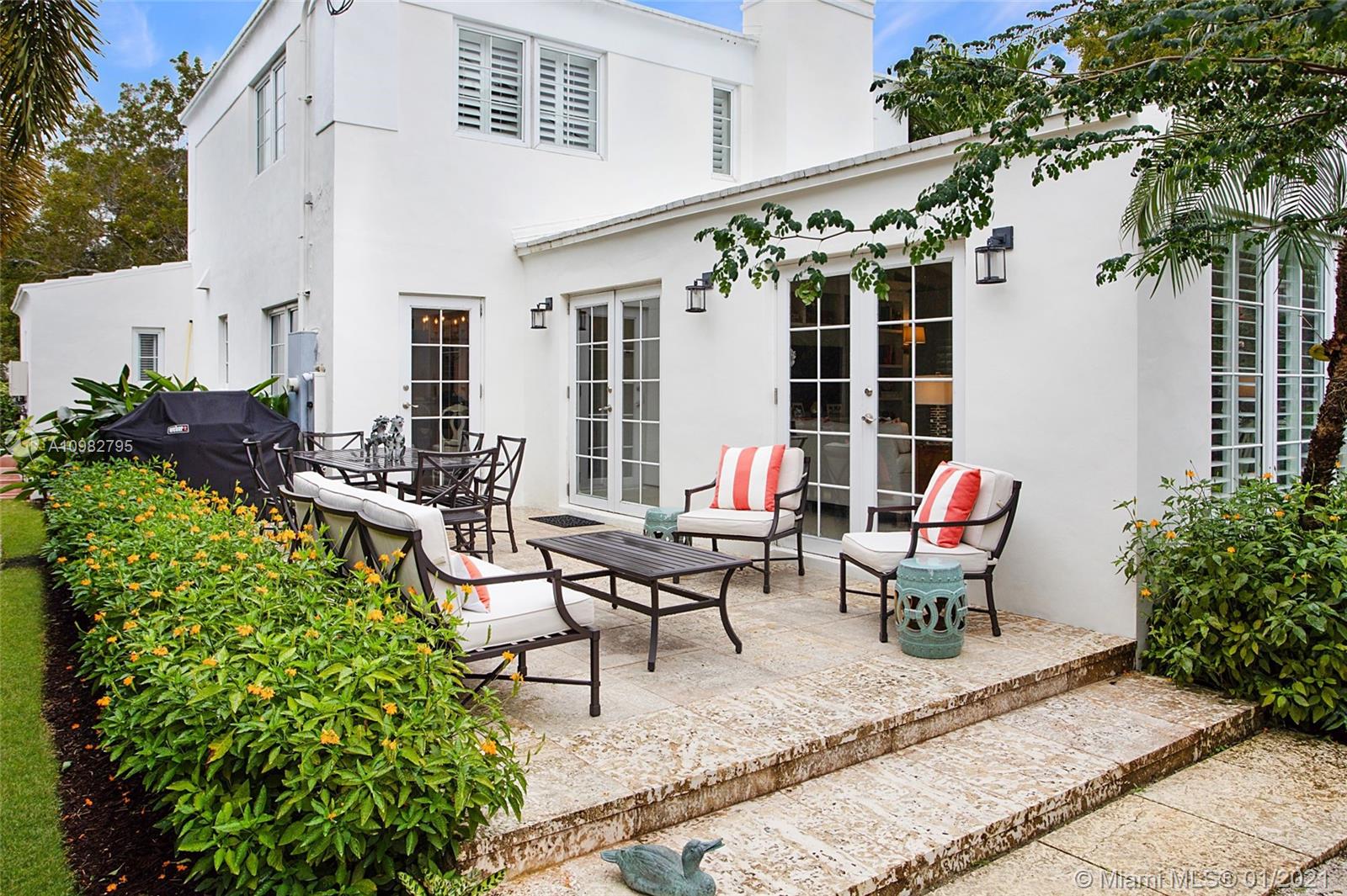 Gorgeous, charming and impeccably maintained home in highly desirable Golden Triangle neighborhood on a corner lot. Over 2,300 sqft living area includes a classic living room and fireplace, a bright kitchen open to dining room, and a spacious family room featuring a built-in bar and bookcases. Enjoy the gardens with beautiful landscaping, a walking path and comfortable patio. Conveniently located on the first floor is one full bathroom and bedroom. Upstairs find the primary bedroom with walk-in closet, third bedroom and full bathroom. A one-car garage neatly fits laundry area and storage, and outside a private side yard for playtime or perhaps adding a pool. All impact glass, all new septic system. A quiet and central neighborhood with sidewalks, and proximity to the best of Coral Gables!