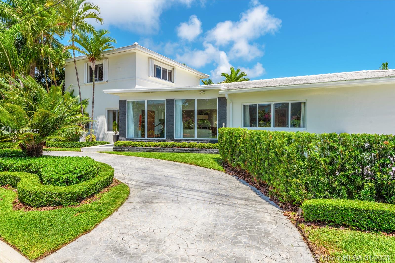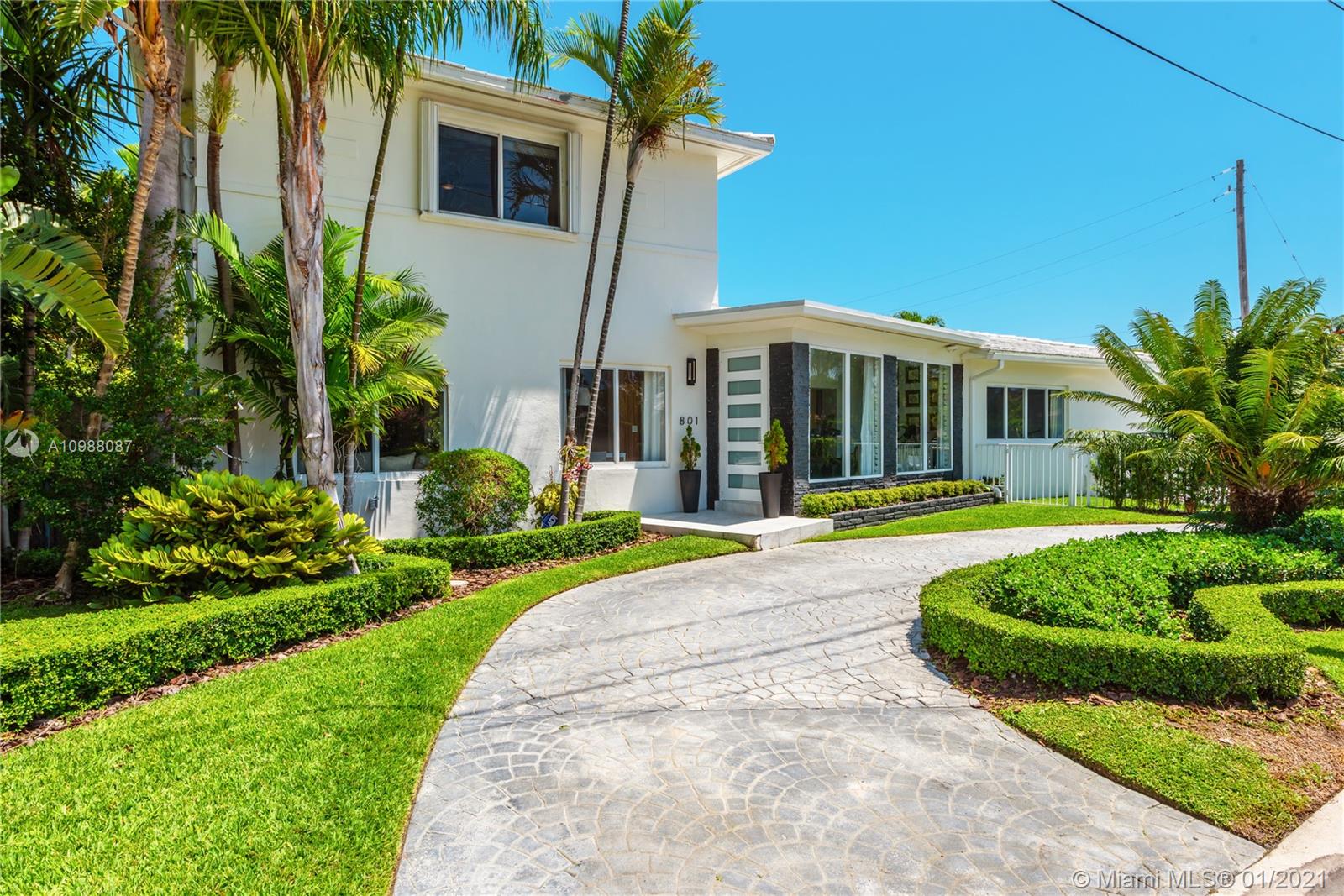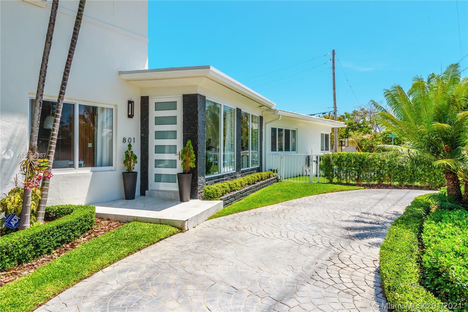 Beautifully renovated Mid-century Modern, 4-bed/3-bath, corner lot, pool home with circular driveway in desirable Surfside. Renovations include: Roof, hurricane-impact windows and doors, pool, pool deck, landscape lighting, fence, sprinkler system, two new AC units, and exterior paint. Interior features gleaming white Italian porcelain tile throughout the main living areas, modern kitchen with designer cabinets, stainless steel appliances and granite countertops; separate laundry room. Expansive principal suite features warm wood floors on the second level of the home; en-suite bath features separate tub & shower enclosures, and walk-in closet. A-rated schools in this tranquil neighborhood, in close proximity to the beach, restaurants, downtown Surfside and Bal Harbour Shops.