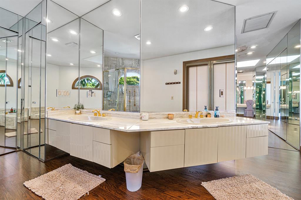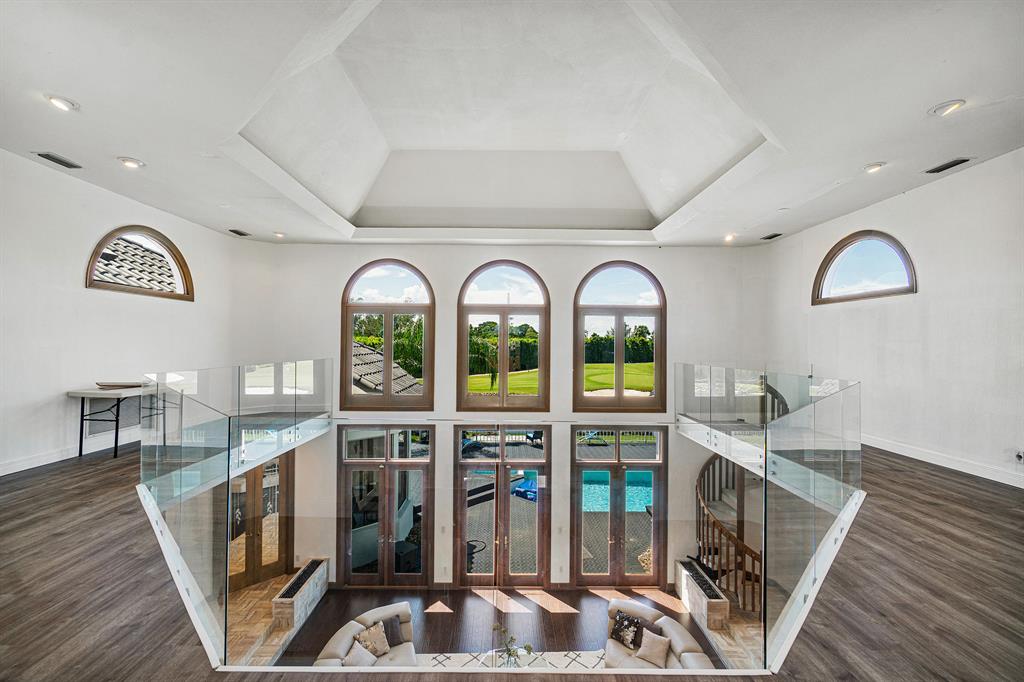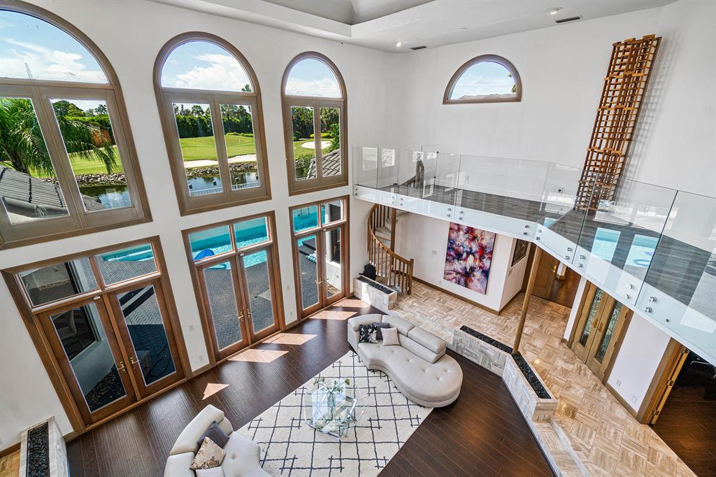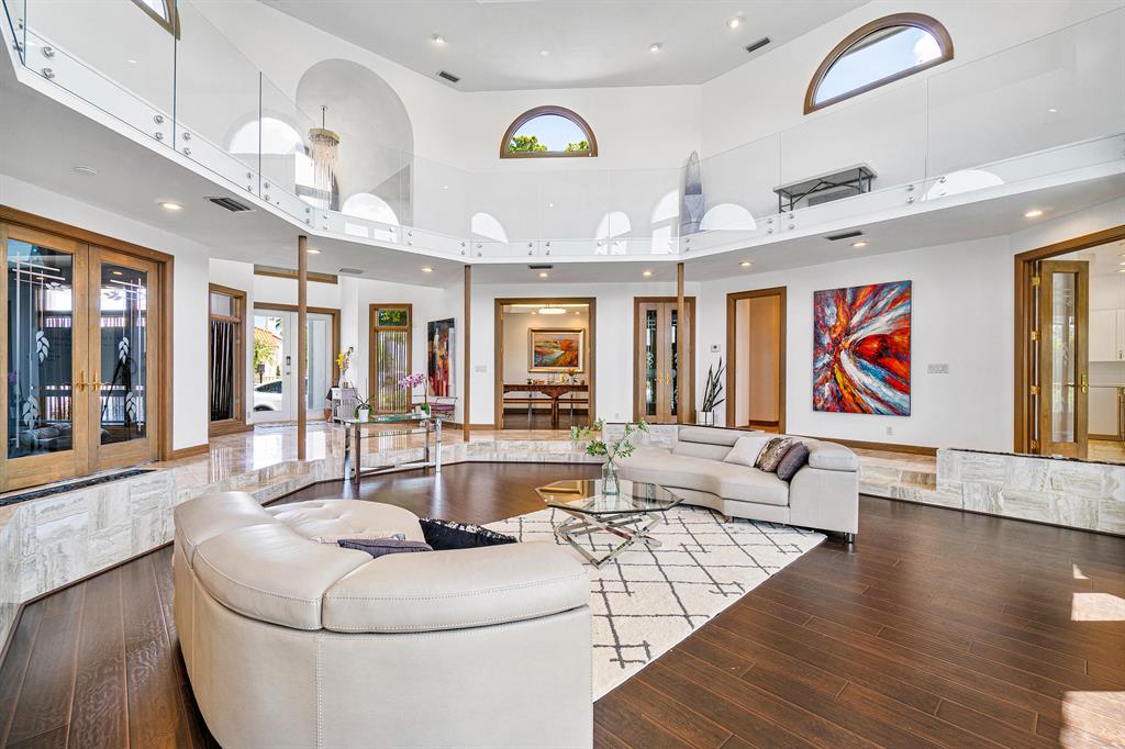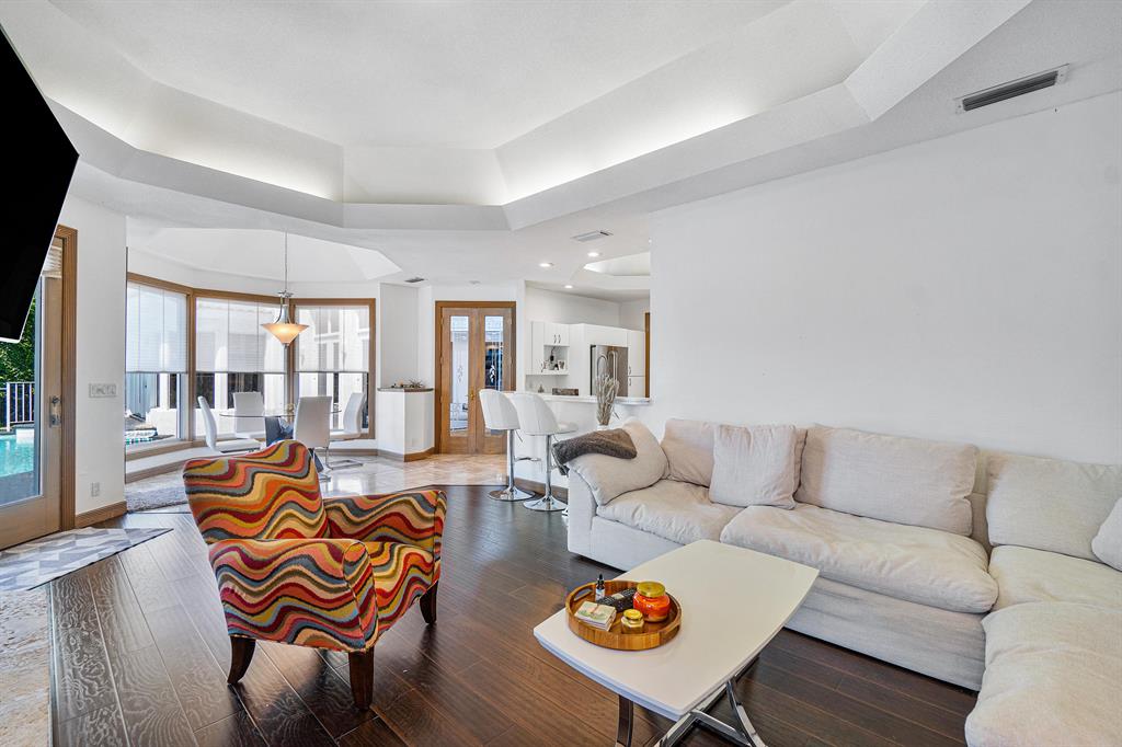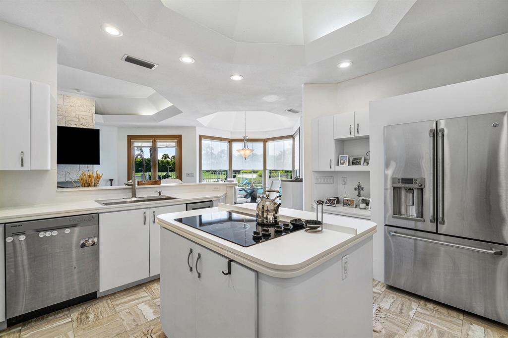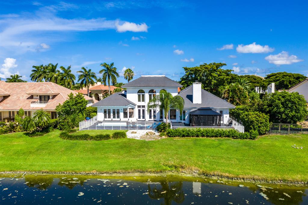 Rarely Available 1 Story, Renovated Contemporary home with spectacular golf and lake views. This home is situated on a private cul de sac street. A spacious floor plan with 3 bedrooms all with bathrooms ensuite. The generously sized office can easily be a convertible 4th bedroom with easy access to a full ball. One bedroom has been designed as a retreat with classic contemporary cedar Sauna and decorative nuances Formal Dining Room, sumptuous living room, contemporary kitchen and engineered wood floors are only some of the designer features. The contemporary flow features a 2nd floor viewing gallery. This beautifully designed home is perfect for relaxing or entertaining. The pool patio area is complete with an installed shaded lounging area overlooking the expansive gold and lake view