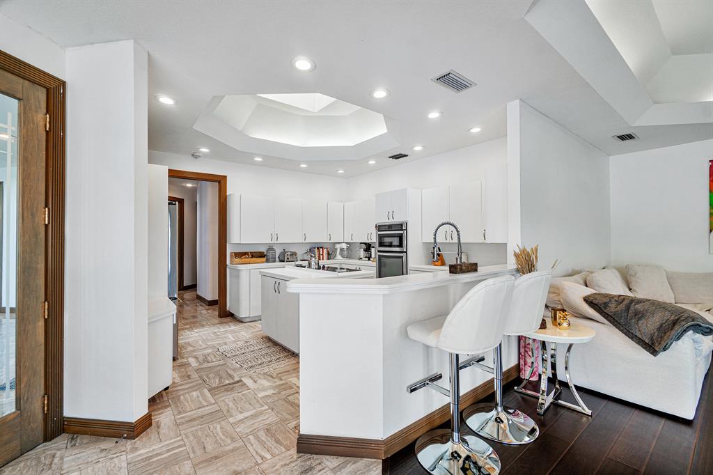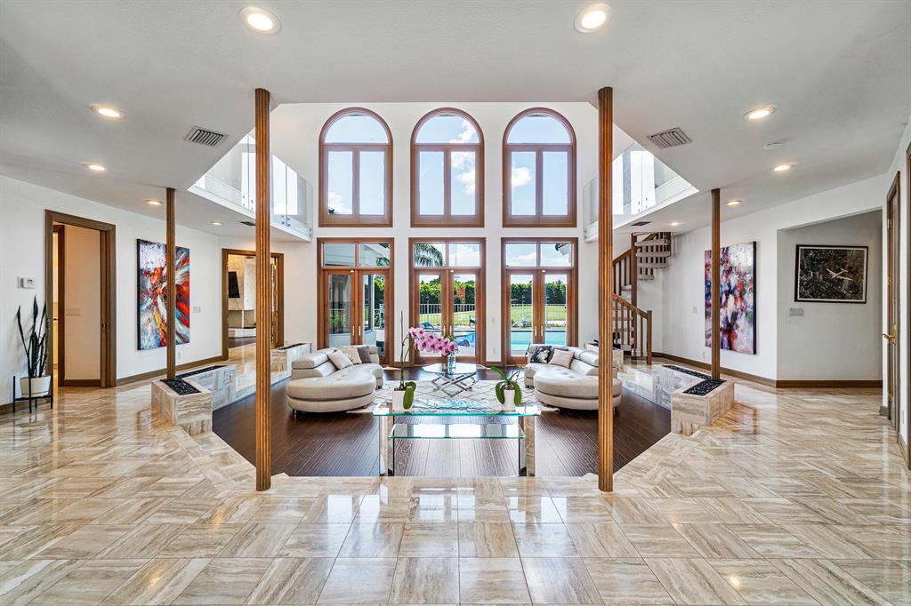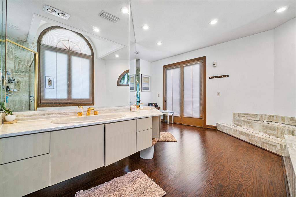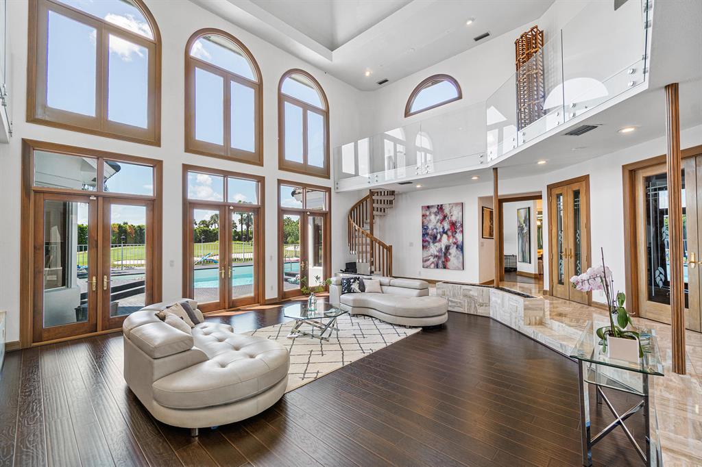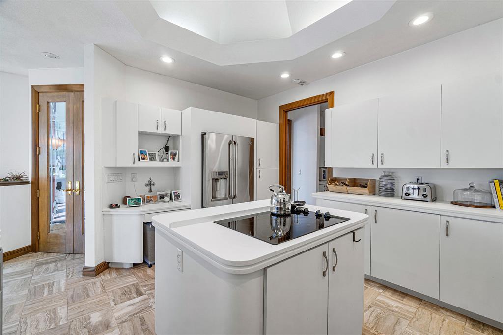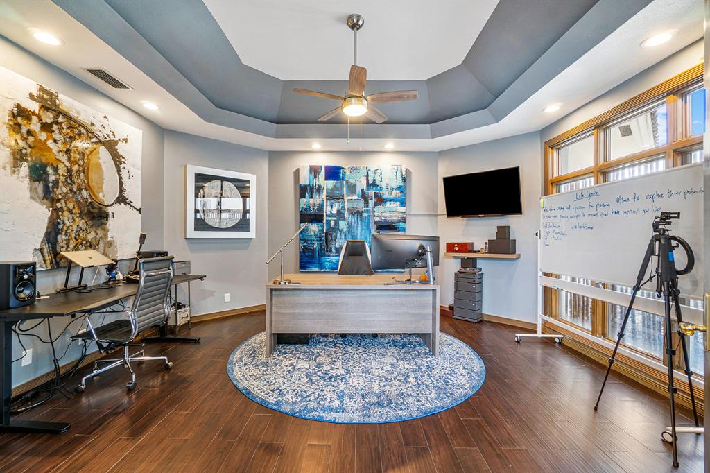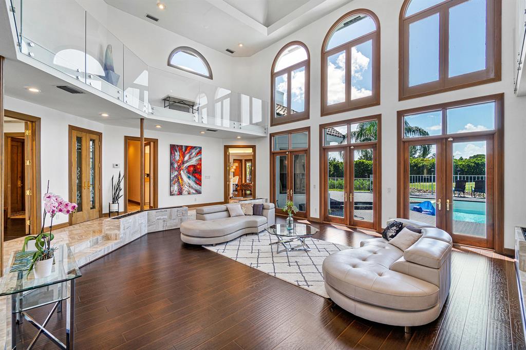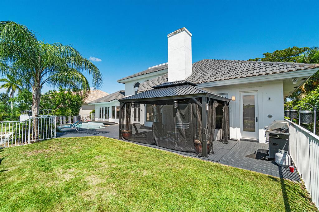Rarely Available 1 Story, Renovated Contemporary home with spectacular golf and lake views. This home is situated on a private cul de sac street. A spacious floor plan with 3 bedrooms all with bathrooms ensuite. The generously sized office can easily be a convertible 4th bedroom with easy access to a full ball. One bedroom has been designed as a retreat with classic contemporary cedar Sauna and decorative nuances Formal Dining Room, sumptuous living room, contemporary kitchen and engineered wood floors are only some of the designer features. The contemporary flow features a 2nd floor viewing gallery. This beautifully designed home is perfect for relaxing or entertaining. The pool patio area is complete with an installed shaded lounging area overlooking the expansive gold and lake view