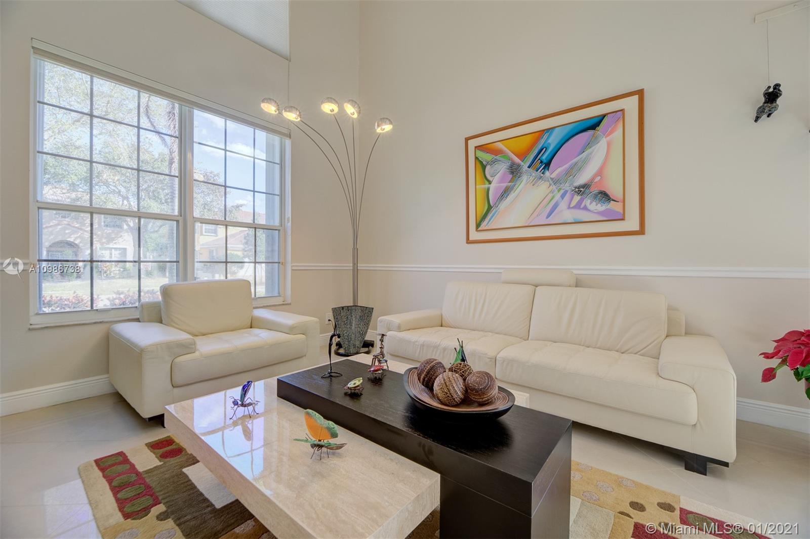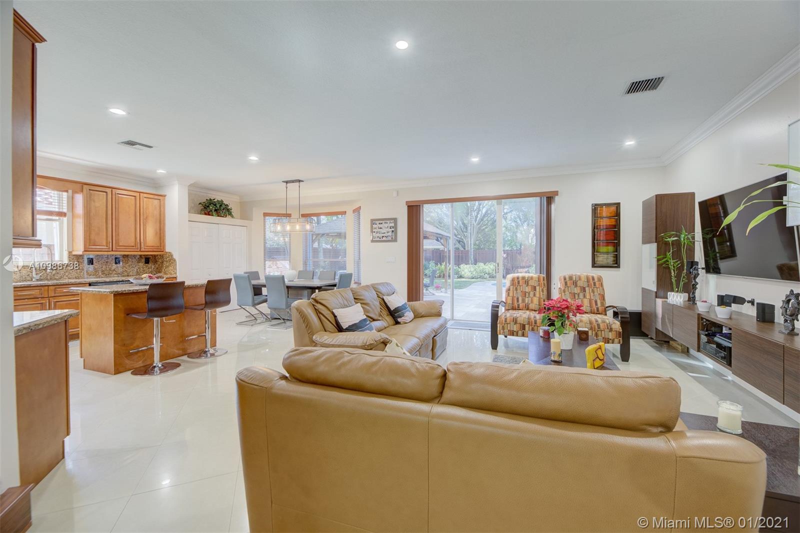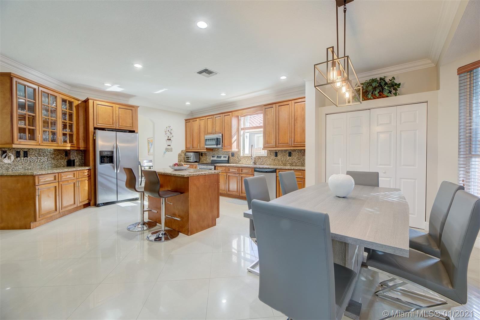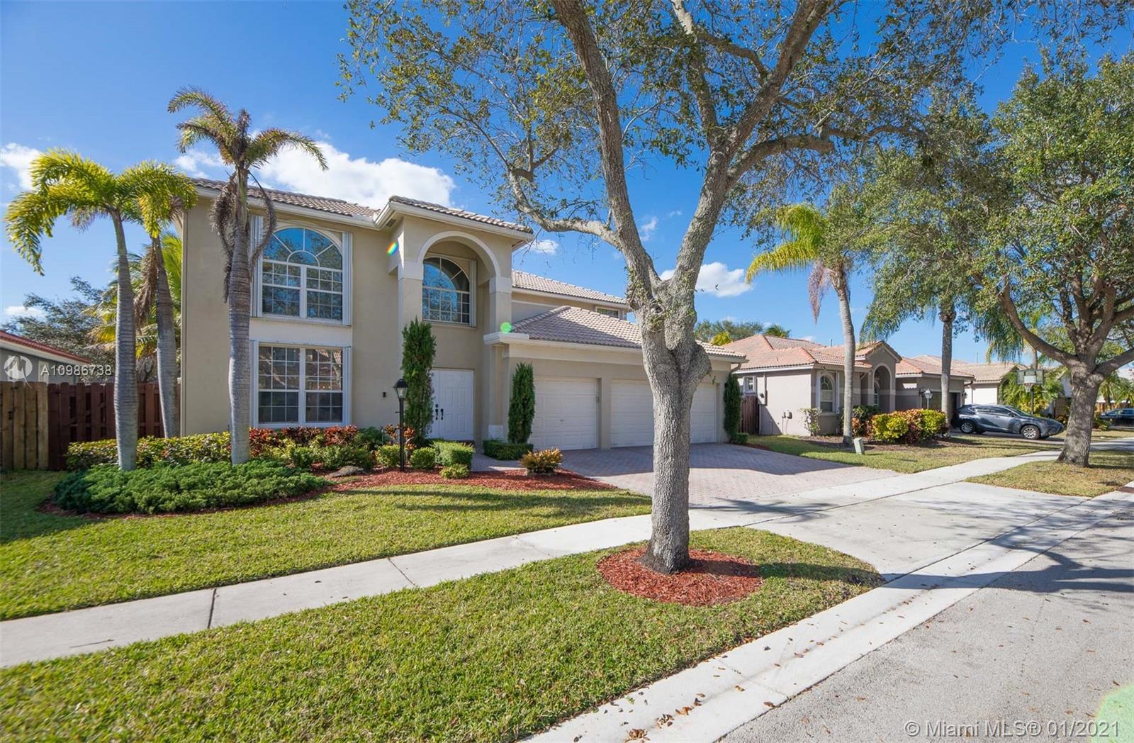 Elegant Kingston model with pool in sought after Pembroke Falls*this upgraded home features 5 bedrooms, 3 1/2 baths + big loft upstairs that's great for multi-purpose use and three car garages * master bed downstairs, with large walk-in closet * porcelain tile downstairs & dark wood on 2nd floor & staircase*open kitchen granite counters & s.steel app, ample custom wood cabinetry and cooking island*high ceilings*new led lighting throughout the house*laundry room*expansive backyard with your own tiki hut and pool to enjoy the breeze and peaceful evenings*the home is ready for immediate occupancy* HOA fee includes internet, cable, alarm, clubhouse, gym, heated pool, lakes, dog park, tennis & basketball courts. centrally located, a+ school district.