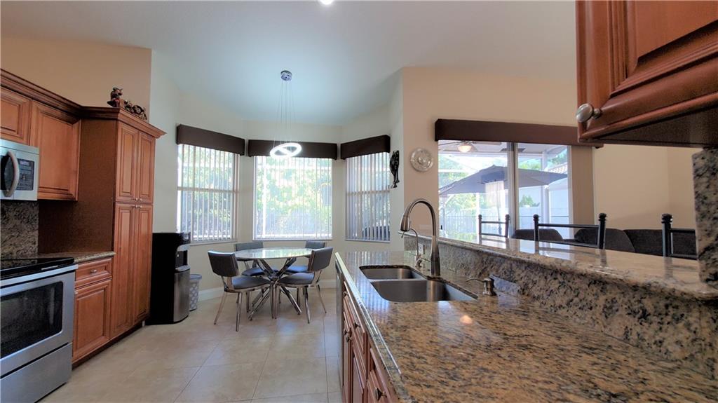 Newly Updated 4/2.5 home, 2 car garage and super low HOA . Vaulted ceilings create a light bright home with an open & spacious split floorplan while still providing a formal living & dining room. Wood cabinets in Kitchen w/ granite counters feature counter seating and a breakfast nook overlooking the family room. Remodeled Master suite has 2 walk-in closets & spacious bathroom w/ dual sinks, shower & stunning soaking tub. All bedrooms are spacious and bright. NO CARPET. Enjoy the Large interior laundry room w/ utility sink. NEW 2017 ROOF. New A/C, Hurricane & Accordion Shutters. Wifi programable ext lights and Sprinklers. Relax with family, friends and pets in the fully fenced yard w/ Lychee & Mango trees. Large screened patio makes BBQs bug free! Ask your agent for Floorplan, EZ to see