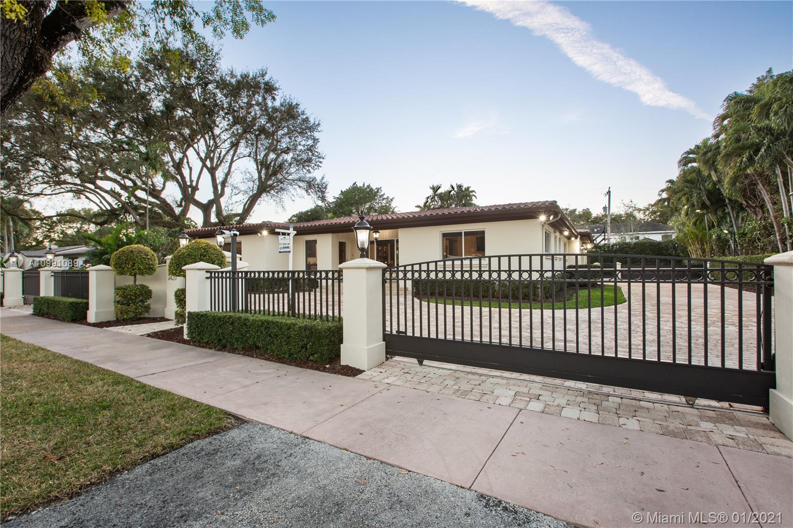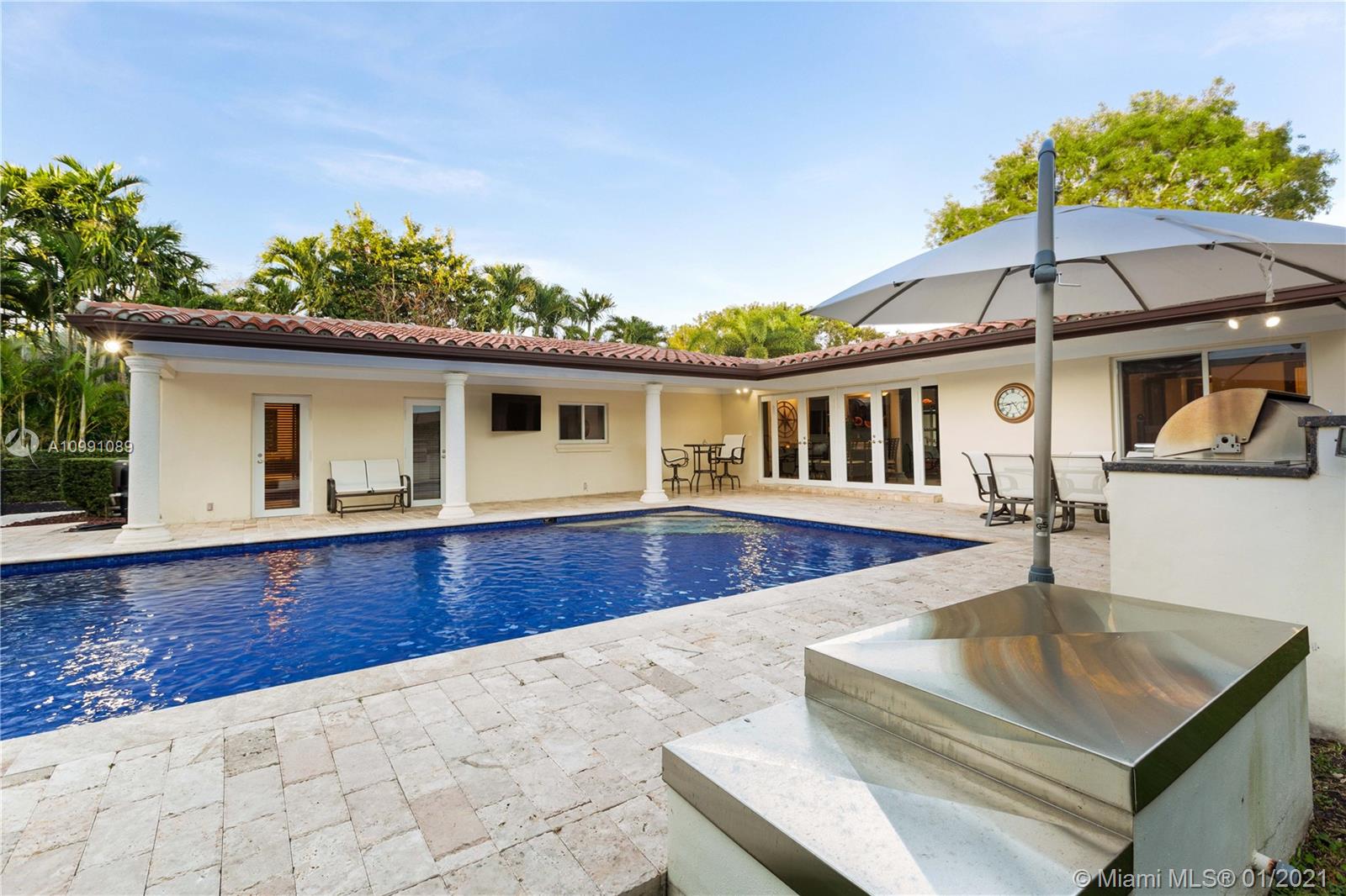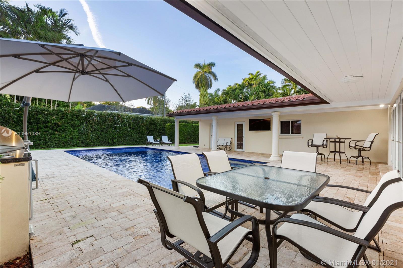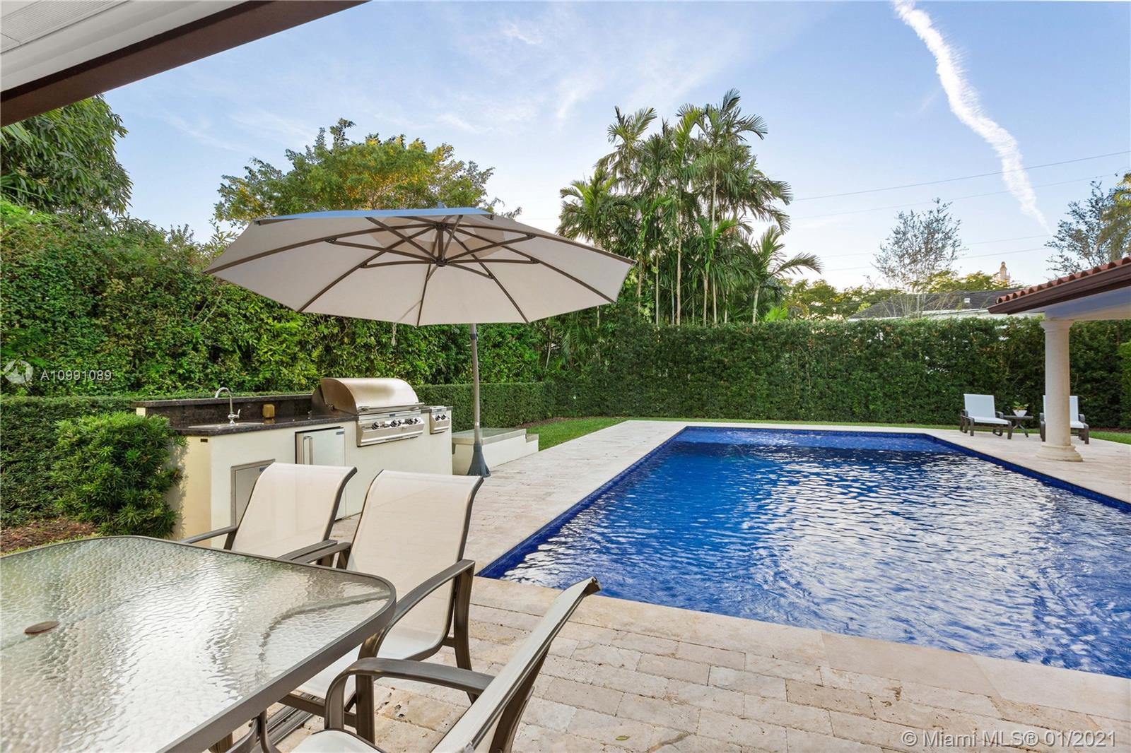 Step into perfection! Spectacular 4-bedroom, 3.5-bath split plan home In the heart of the Gables. Set on a generous 13,500 square foot lot, this home is more than turn key. Beautiful modern kitchen and great living spaces that are perfect for entertaining or spending time alone. This home is gated and has a great pool and summer kitchen. 4th bedroom is just off the pool and is independent from the main house. The home has impact Windows and doors as well as backup generator. Circular driveway, two car garage and beautifully landscaped. Just fabulous!