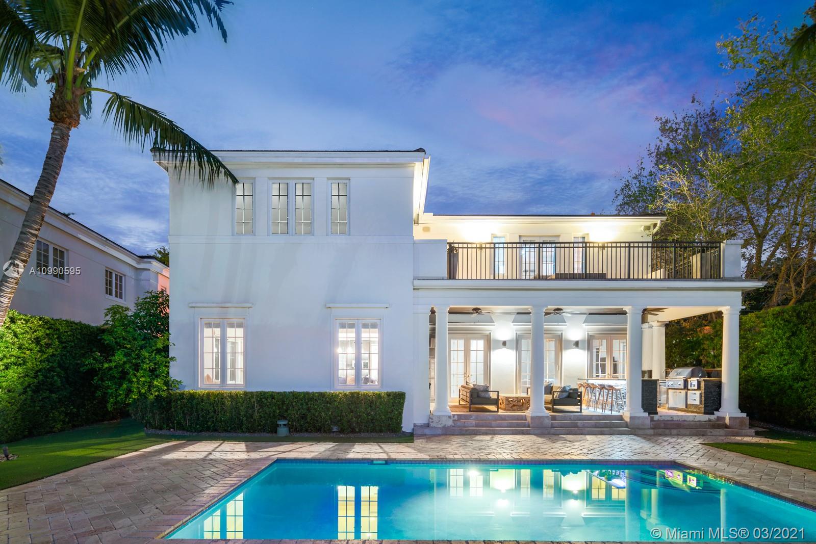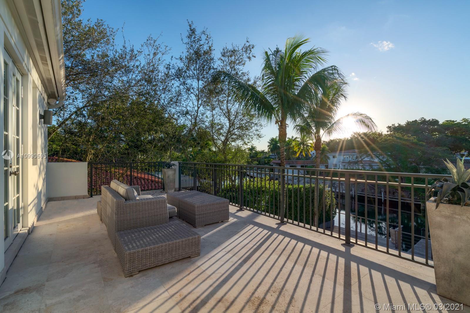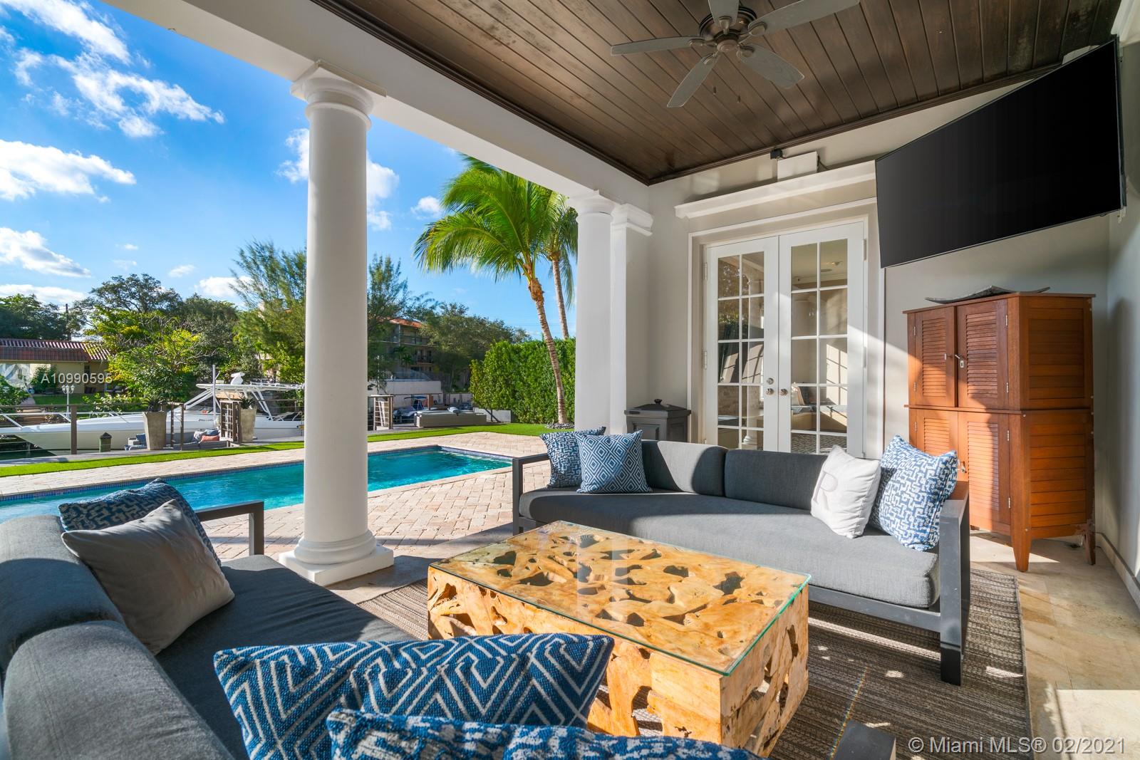 Gorgeous waterfront home located on the prestigious Coral Gables Waterway. It is a stunning contemporary French-inspired chateau on a 9,126 sf lot. The 4BR/4.5BA 4,078 total sf home includes hurricane impact windows and doors, marble floors, marble and granite countertops, high ceilings with recessed lighting, whole property sound system with zones, 13-camera security system, and wifi extenders. Less than 60' of water frontage, boat lift, and 600+ sq ft Brazilian Ipe dock with waterside seating area give access to Biscayne Bay. Gourmet eat-in kitchen is complemented by an outdoor summer kitchen complete with Lynx grill and side burner, icemaker, refrigerator and more, overlooking a sparkling saltwater pool. Generator with an underground propane tank will run the entire house for 4 days.