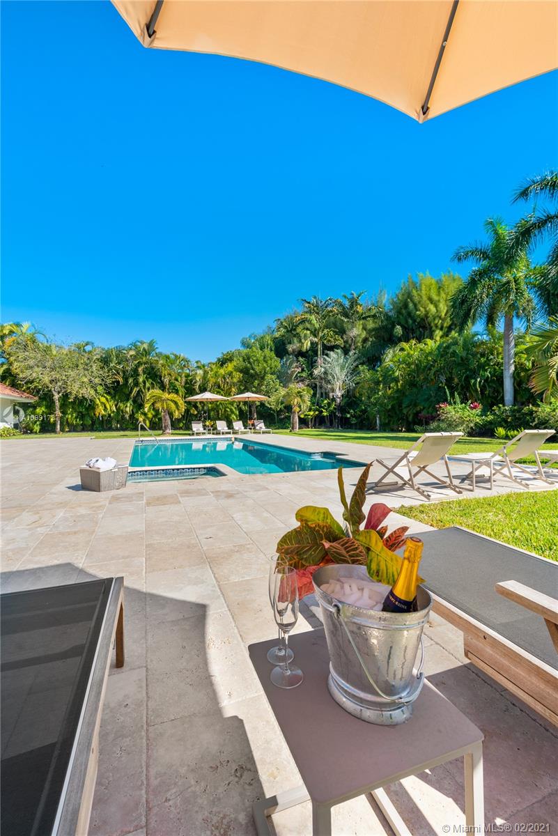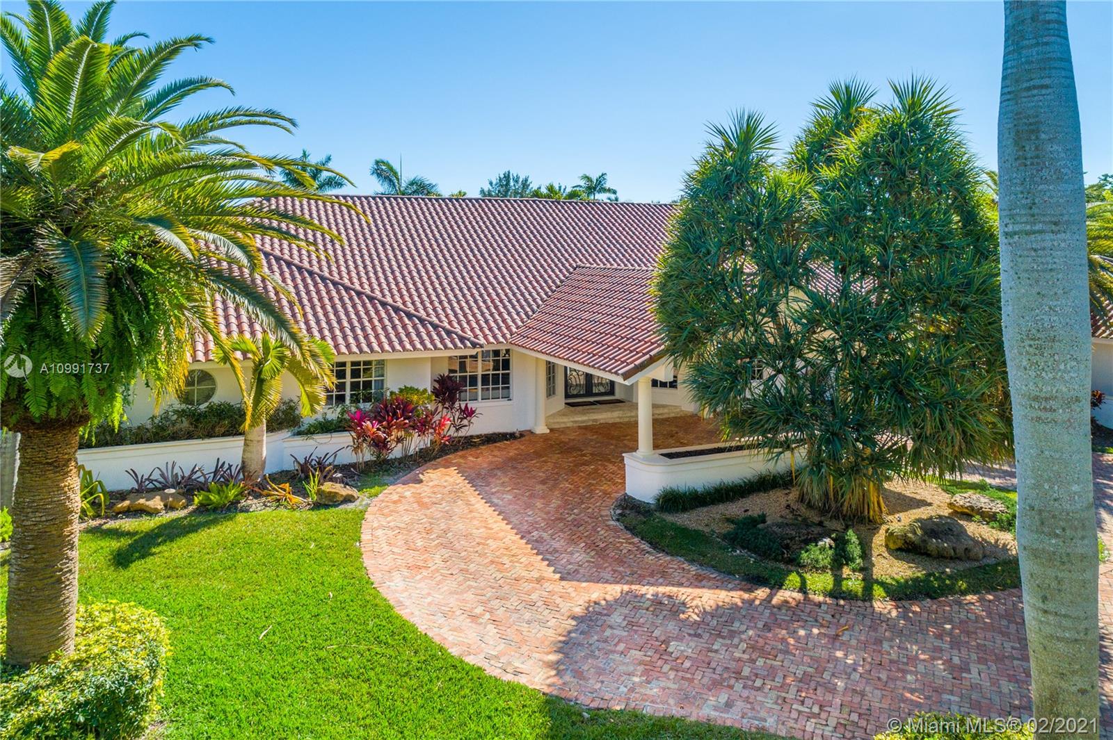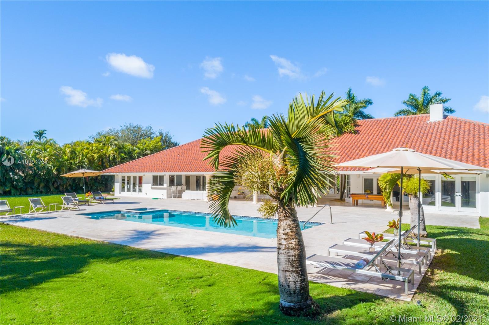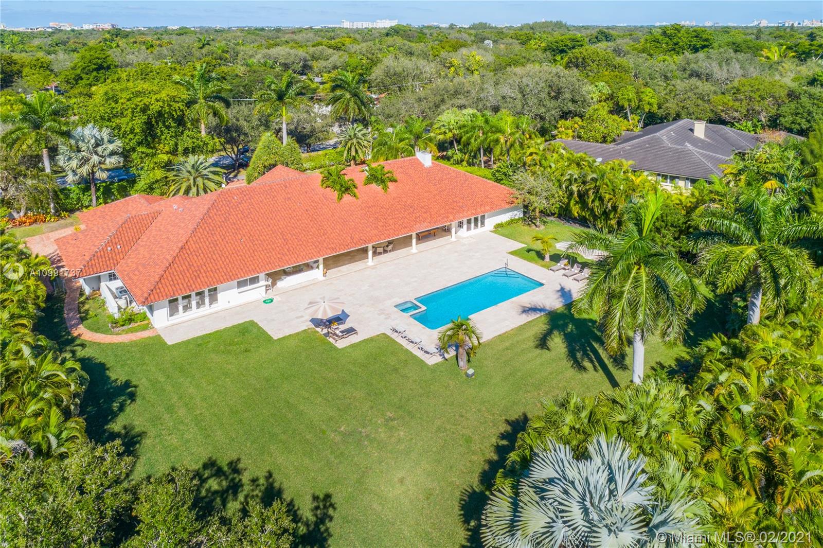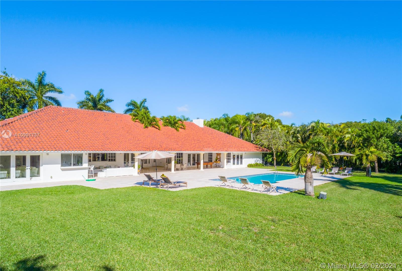 Tucked off historic Old Cutler Road, a tree-lined prestigious street in Coral Gables, a veritable paradise awaits. Here, sunlight dances across each room, lush greenery invigorates, and life unveils its most beautiful moments. Enter your gated drive with interlocking brickwork, yielding a spacious, private acre lot dotted with palms. An expansive foyer welcomes, while beyond, the one-story open plan offers endless room to play. Enjoy walk-through access to your immense backyard and inground pool, where you can cool off and sip champagne poolside. Living spaces reveal richly veined marble flooring in eye-catching contrast to bedrooms lined in lustrous dark hardwood. Decorative molding elevates crisp white walls, and drop lighting becomes a work of art in iridescent tones. Welcome home.