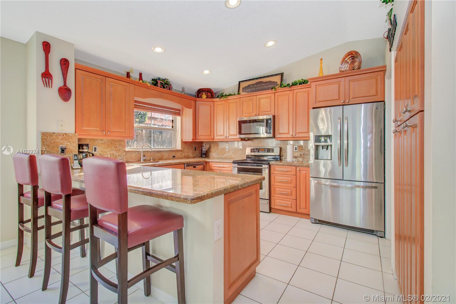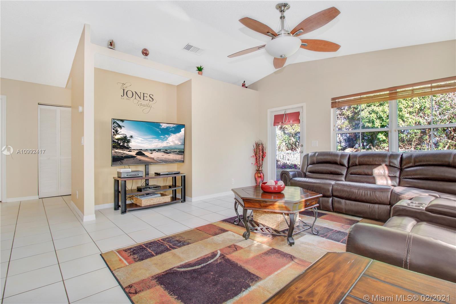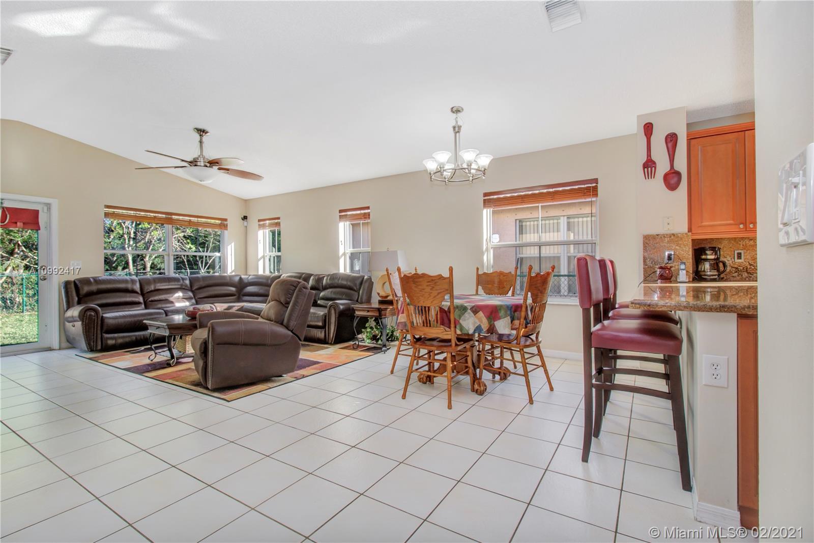 Spacious and Bright home in sought after Chapel Trail in Pembroke Pines. The pristine 4-bed/2-bath model features: paved driveway lined by tropical foliage, 2 car garage, utility room, with ceramic tile in the living spaces, and plush carpet in the bedrooms. Upon entering this home you will discover a great open room with lots of natural sunlight. The kitchen space is lined w/ wall-to-wall cabinets, SS appliances, granite countertops, back-splash, and a 3-seater breakfast counter. In close proximity to A+ public schools, public parks, shopping & dining, you have the awesome option to choose your days in town or indoors. Schedule a tour today.