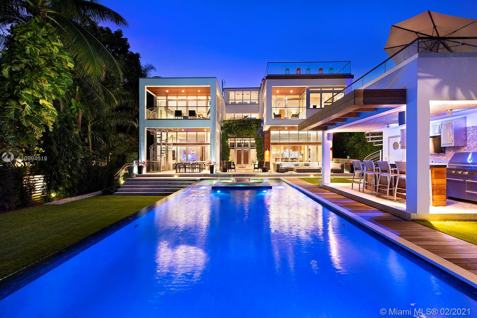 Architecturally stunning modern waterfront home on coveted Sunset Island IV. Experience gated living in what is now the most desirable and prestigious location on Miami Beach. Main house 5 beds, guest house 2 beds, all w/ ensuite baths. Expansive master bath suite w steam, overflowing bath and wet room. Open center-hall floor plan, chef’s kitchen, great room, library and floating staircase to 800sqft rooftop with 360-degree views. Floor to ceiling accordion glass doors open to spacious outdoor entertaining area, negative edge pool, spa, waterfall, cabana w summer kitchen, bar, private rooftop sundeck. Ipe dock allows 70’ boat. Crestron smart home, 2-car plus golf cart garage, Owner/builder gives 1-year warranty at closing. Short walk to nearby Sunset Harbor shops, gyms and restaurants.
