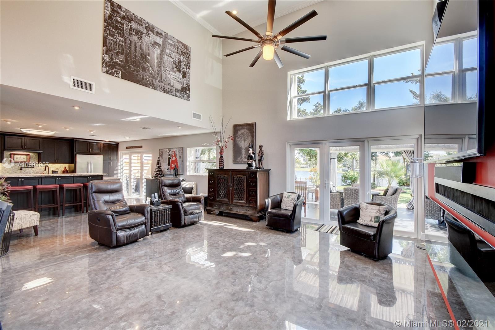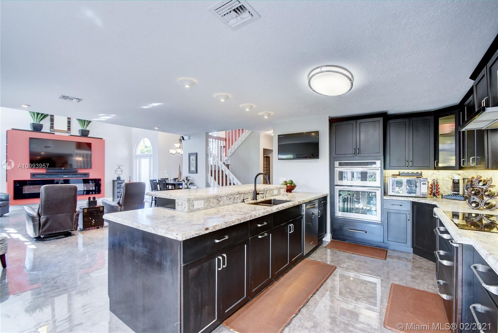 Impeccable LAKEFRONT CUL DE SAC home in Shenandoah. Perfect for entertaining! This spectacular home features an open floor plan and a new kitchen with granite, wood cabinets, and a huge bar, pot filler. The living room boasts an entertainment wall with an 80" tv, Bose sound-bar, and fireplace. The master has a large walk-in closet, the master bath features double sinks and roomy double shower. The guest bath is redone as well. The home has impact windows, doors AND accordions. Your outdoor living space is a 900 square foot patio and outdoor kitchen covered by louvered awnings with hurricane screens. Mosquito mist system, 10 Ring cameras, outdoor Bose sound, professional landscape with lights, fully fenced, fruit trees, insulated garage, roof 2006, and more. This one is a GEM, a must see!