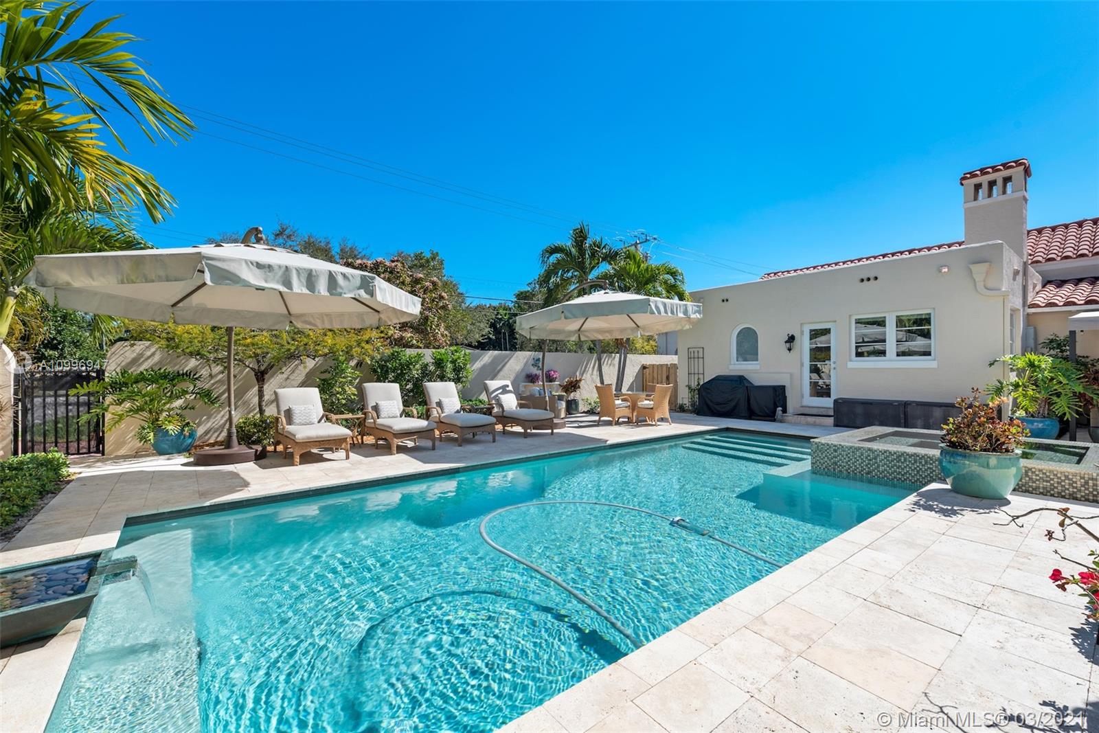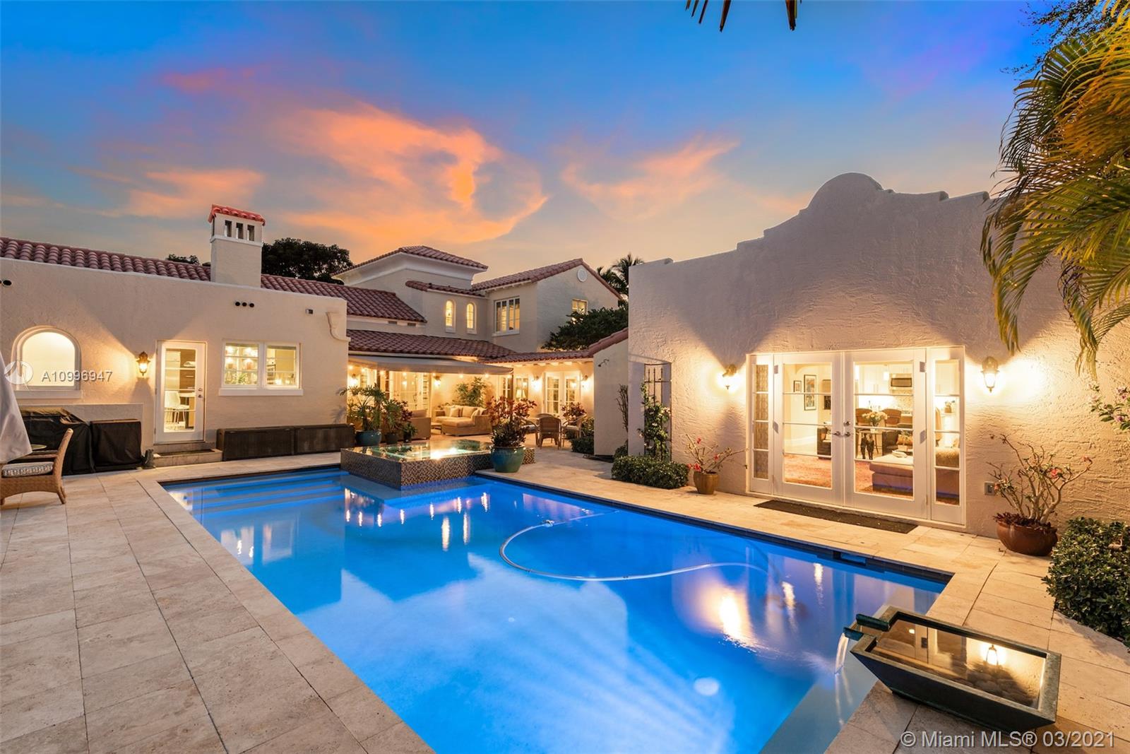 Expansive, impressive & a rarity in its own right, this landmark historic architecturally distinct Mediterranean estate is situated on expansive 19,200SF corner parcel inclusive of towering oaks, spacious main house+attached vast guest house. Main residence flaunts grand living&dining spaces, 6bds,5full ba&2 half ba. Enthralling details such as 14ft pecky cypress ceilings, custom tile/ironwork, French doors & remote controlled fireplace. Window-lined poolside loggia leads to renovated guest house w/ separate kitchen, laundry, living/dining, office & 2nd master. Perfect for blended families. Walled grounds w/ covered terraces, porte-cochere, full impact glass, full home generator, open green space & heated saltwater pool w/ built-in infinity jacuzzi. Includes plans for detached 2 car garage