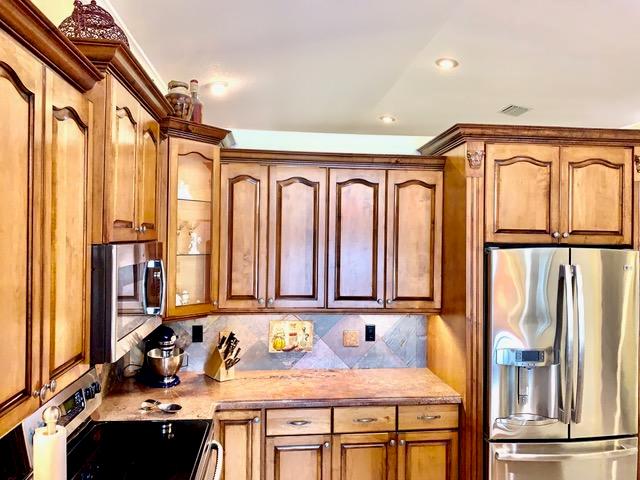 Recessed LED Lighting, Custom Oversized 36'' Solid Maple Wooden Cabinetry with Molding, Under cabinet lighting, Island kitchen lighting, Generator Hook Up at meter, Surround sound wiring in Family Room, Maple workstation, Maple Entertainment Center, GE Profile updated stainless steel appliances with GE Profile 29'' Counter depth French 3 Door Refrigerator, 2'' Granite countertops with Ogee edge, low maintenance slate backsplash and slate 1/2 wall at island, slow close cabinets, hammered pulls and knobs, Bianco Kitchen sink and Bianco Kitchen pullout faucet , marble bathrooms with custom vanities, updated faucet hardware, updated lighting fixtures in bathrooms, solid glass 5/8'' custom shower door, sit in area in shower with niche, crown molding, 4.5'' wooden baseboards. wood trim casings a