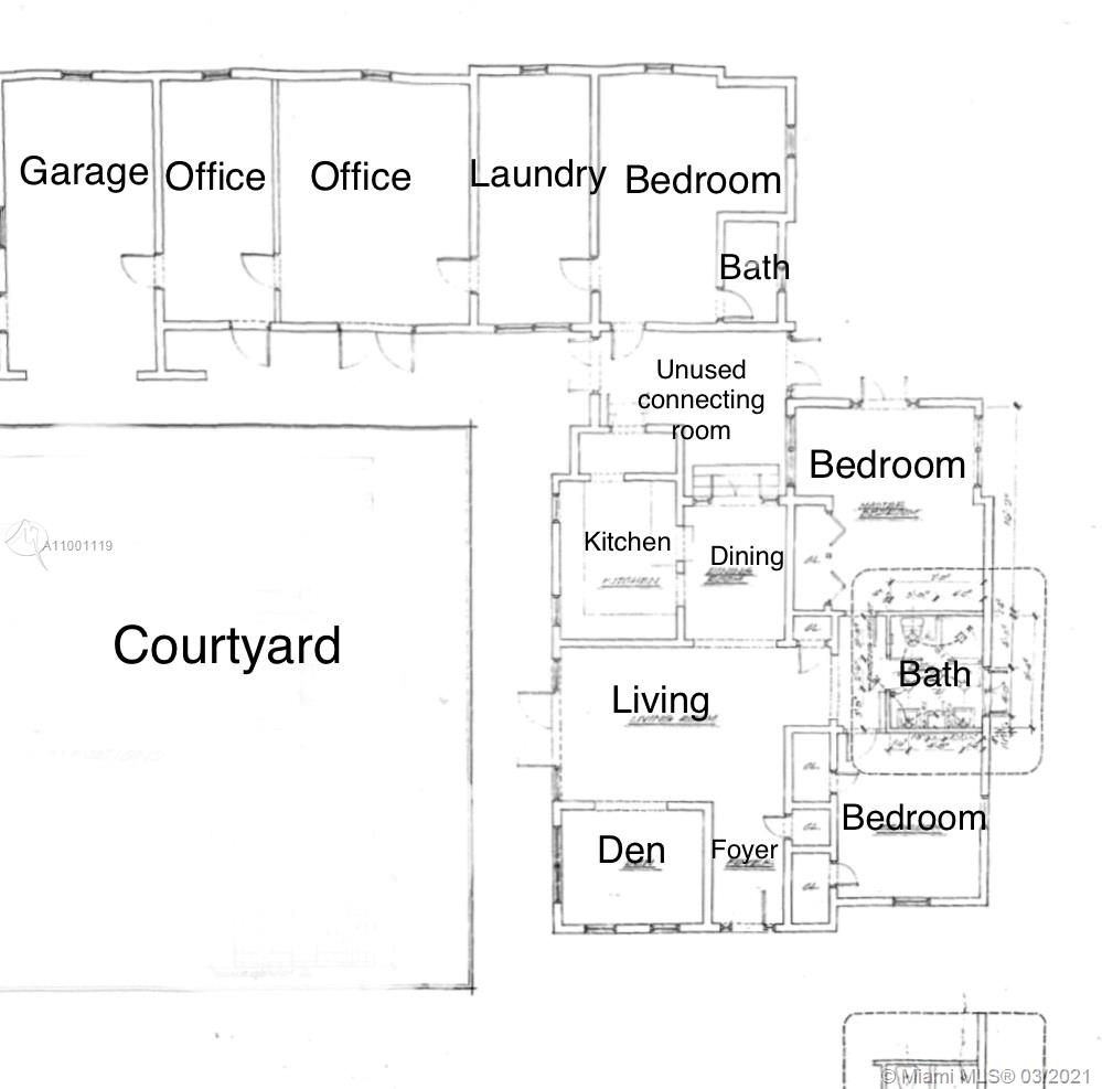 Charming 1925 Old Spanish featuring 3 Bed/2 Bath, 2 office/dens plus 1 car attached garage. Property boasts 2400 sf of living space on a 10,000 sf lot. Located just off Lejeune Road, between Coral Way & Bird Road, this home is ready for a visionary to turn this gem into a masterpiece. With "Old World Charm" galore this home was built in an L shape with lots of French windows & doors facing a wonderful courtyard perfect for outdoor entertaining, relaxing with nature during your morning coffee or enjoying a peaceful evening with a glass of wine. This home is perfect for those wanting to be close to the famed Miracle Mile in the heart of Coral Gables, filled with high end boutiques and fine dining.