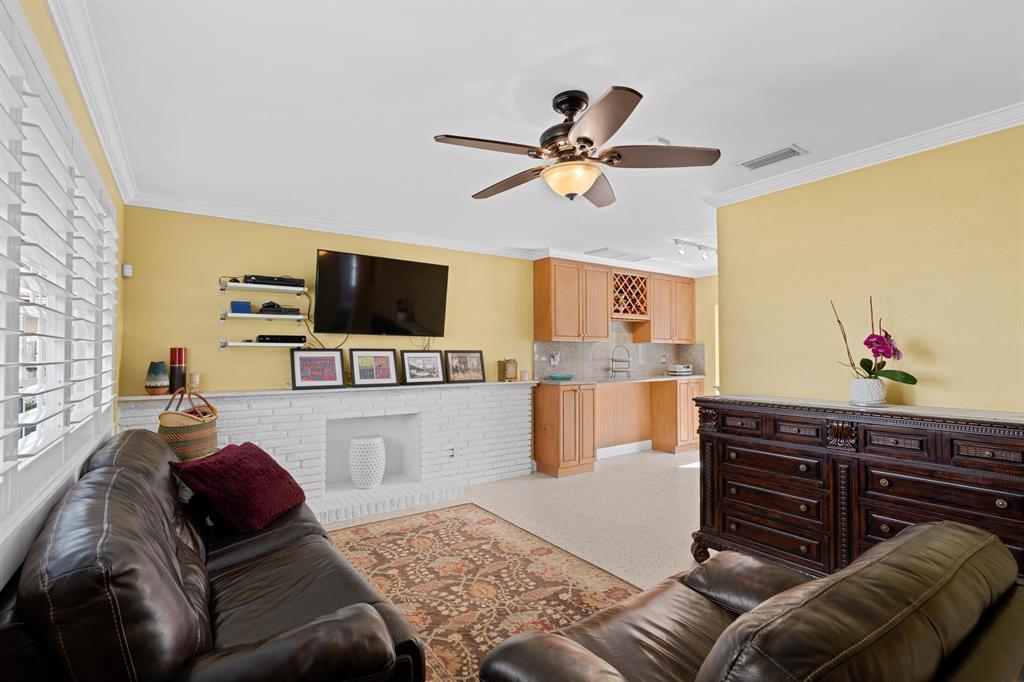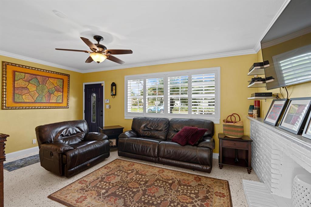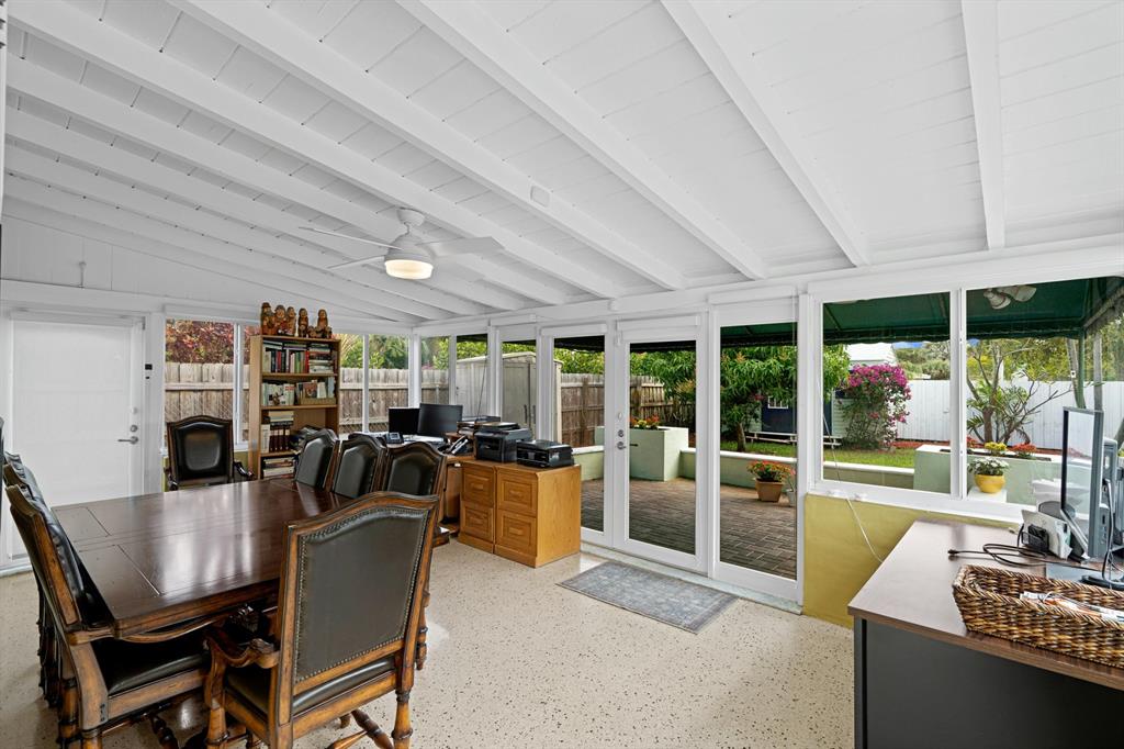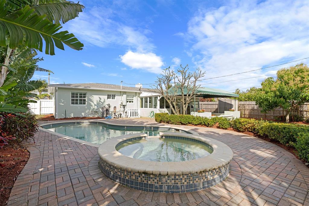 Charming Florida style bungalow in the SoSo neighborhood in the South Olive Elementary School District. 2 bedrooms, and 1 bath, restored original Terrazzo flooring throughout, and white brick fireplace. Updated kitchen and bath, all impact glass, and a lovely family room with windows and french doors opening out to the covered loggia and pool deck. The pool also has an attached Spa and is heated. The large yard is completely fenced, and the sellers are leaving a large exterior storage shed. A I car garage with the laundry inside the garage. The property is nicely landscaped and in move-in-condition.
