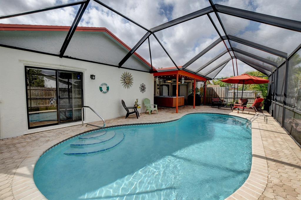 Welcome home to tropical PARADISE! This 4/2 POOL HOME is move in ready. NEW ROOF, CBS construction, NEW A/C. Enter into your foyer and notice the ceramic floors w/ a medalion & soaring ceilings with knockdown finish. Lots of natural light. Entertaining is a breeze in your NEW KITCHEN boasting upgraded Frigidaire Gallery S/S, granite counter w/ tumbled marble backsplash all flowing to your AMAZING outdoor space for guests/family. Take a dip in the sparkling pool or sip a cool drink & relax in the 5 person SPA w/ lights. Fully fenced yard for the swingset & dog run. Relax in your large master suite featuring a BARN DOOR entry to NEW master bath highlighted by vanity w/ granite countertops & undermount sink. Enjoy the BIG stall shower. New guest bath! Paver dway, NO HOA! A++ schools