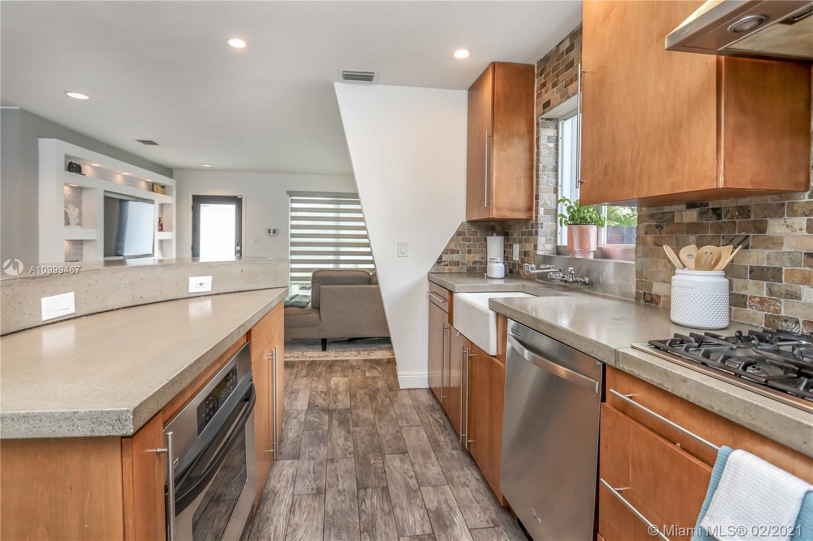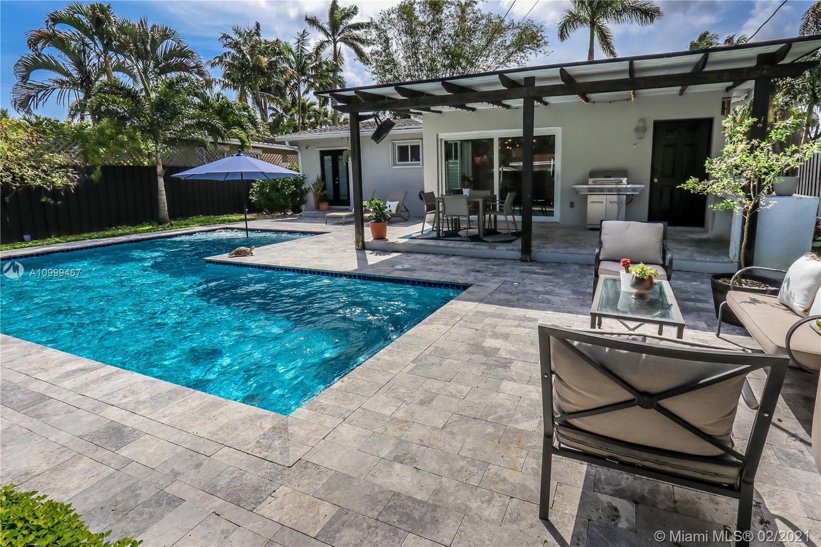 Contemporary 2 Bed/2 Bath residence with tropical landscaping and pool oasis. Featuring a circular drive, open porch, modern yet warm design elements. This superbly stylized layout continues with beautiful wood porcelain tile flooring, a sunlit living space and an open concept kitchen featuring custom island, concrete countertops, light cherry wood tone cabinetry, tile accents, ss appliances & gas stove leading to dining area. Oversized master bedroom/bath features a dual faucet sink with rainfall shower for a spa-like experience. An outdoor oasis awaits with a brand new saltwater pool perfect for entertaining. Features: Tankless Water Heater, Digital Nest Thermo, Pre-wired for ADT Camera System, Hurricane Impact Win/Shutters, Saltwater Pool, Deck, Landscaping & Lighting, Roof, AC, Shed.
