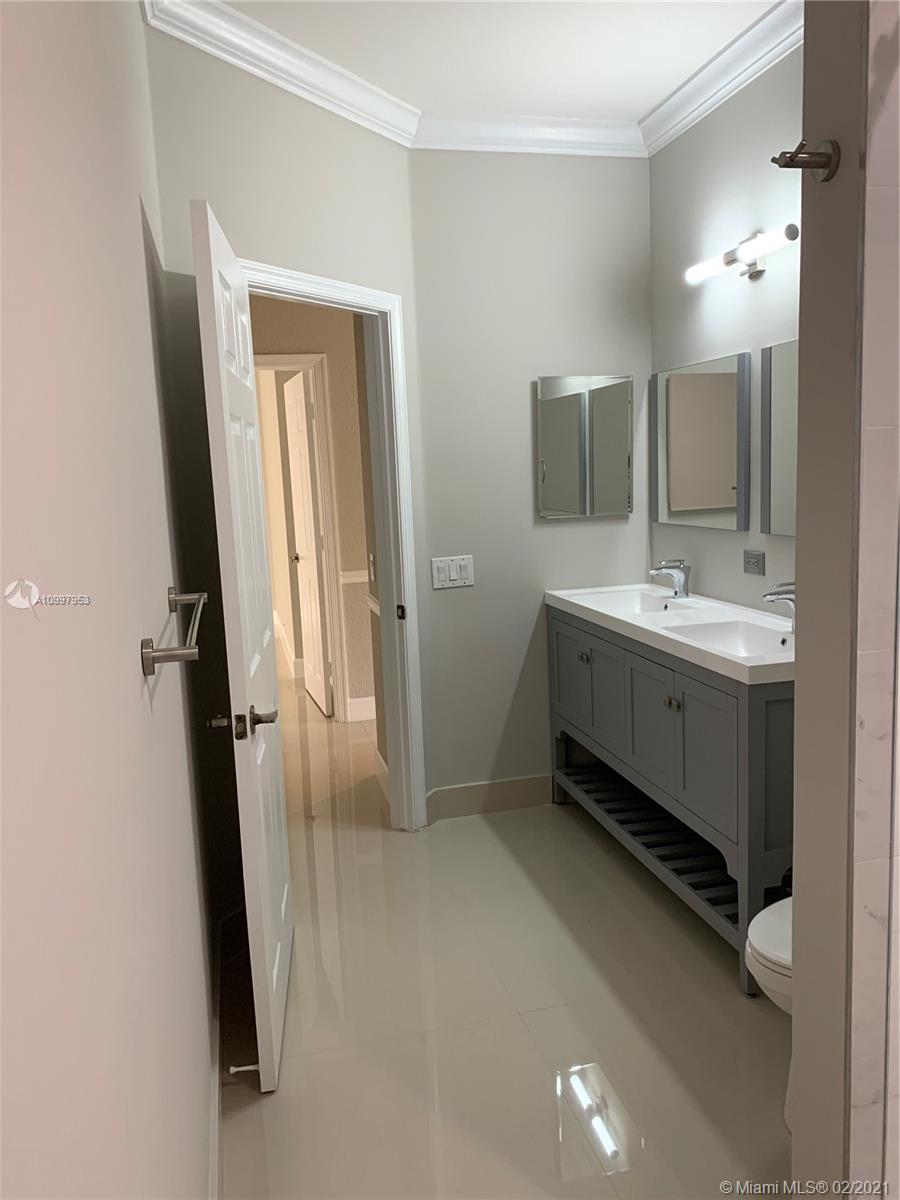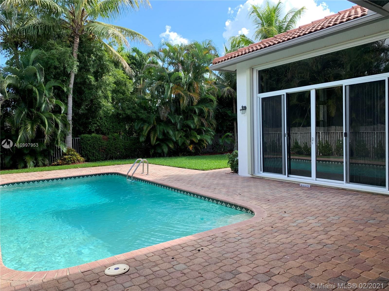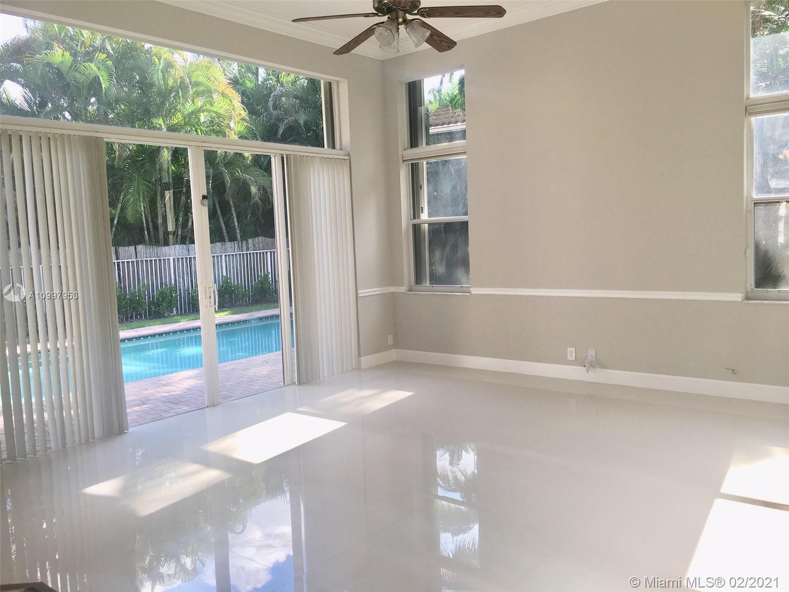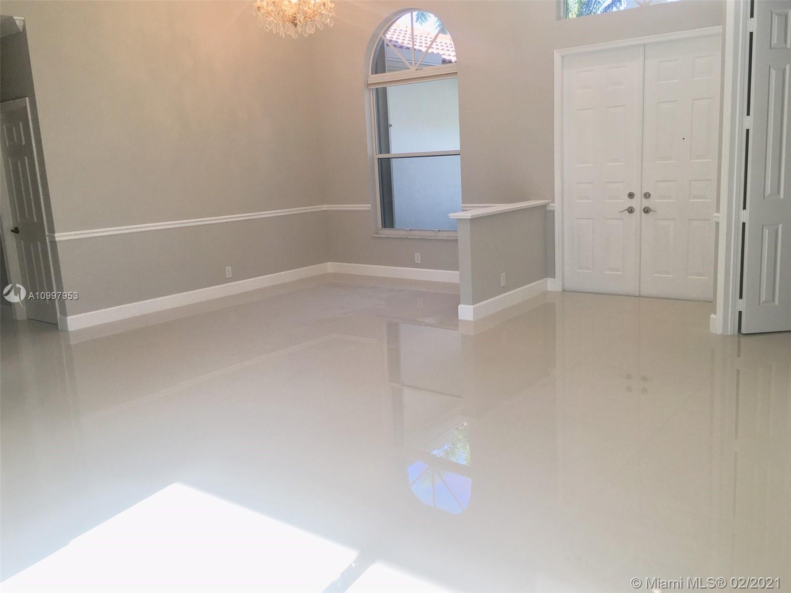 Beautiful home in Weston Hills, with spacious 1 story living, great pool in ample and very private backyard, tri-split bedroom design, 5th room is a den by the front door and next to the master bedroom, 2 big walk-in closets in the master bedroom. New porcelain floors throughout the whole house, new quartz counter top, completely remodeled cabana bathroom and guest bathroom, new shower in master bathroom, new toilets, tall ceilings, new LED ceiling lights, laundry room with sink; two year old stainless steel appliances. New diamondbrite in pool. Freshly painted. New accordion hurricane shutters. A must see!