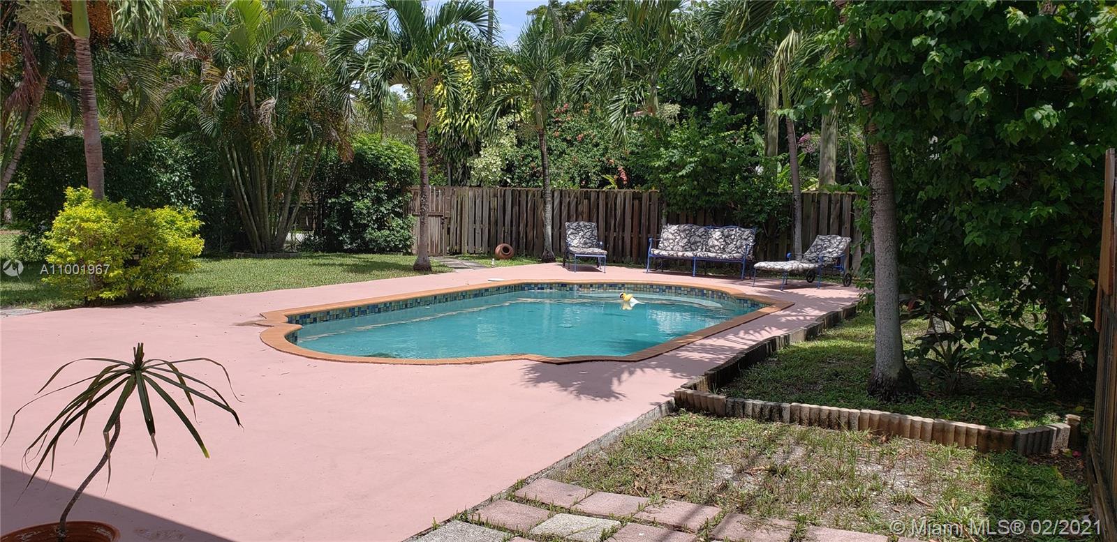 Beautiful 4/3 tropical pool home located in beautiful and established Miami Shores. Huge family kitchen connected to backyard thru convenient snack counter for indoor/outdoor lifestyle, as well as a cabana bathroom. Other features include: separate laundry room, secure wood fencing throughout backyard, closet space galore, alley access and circular driveway.
